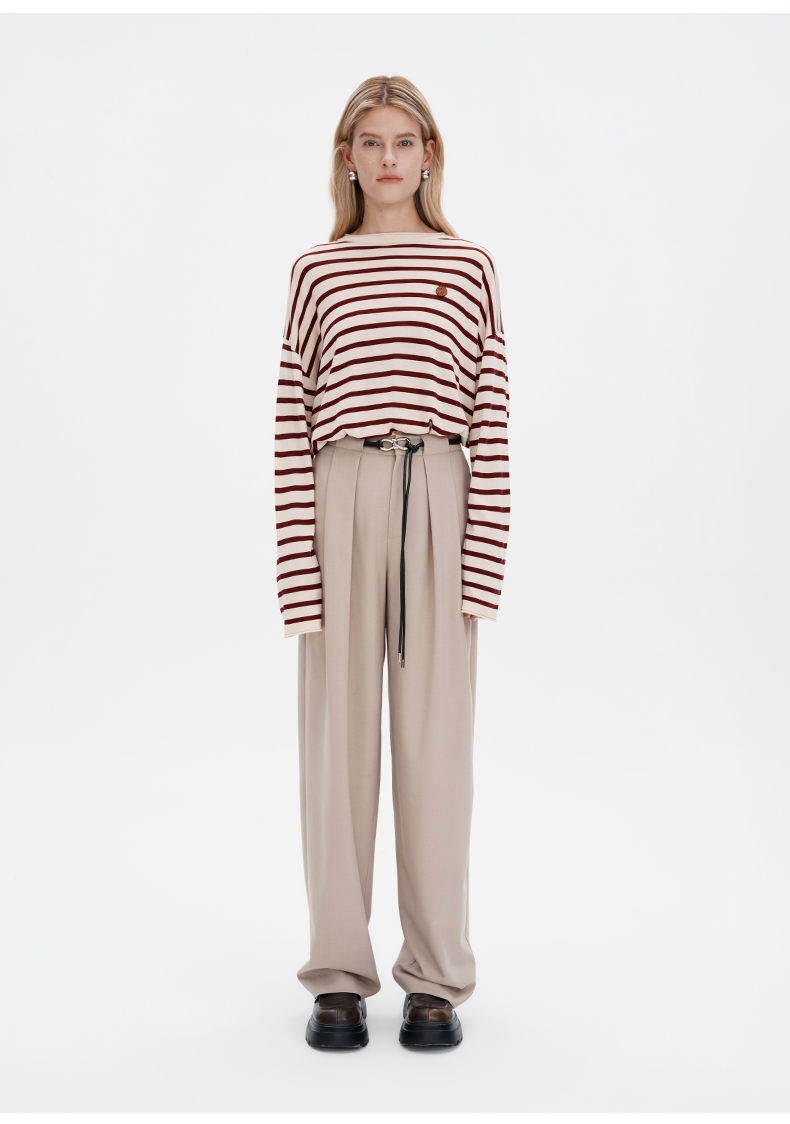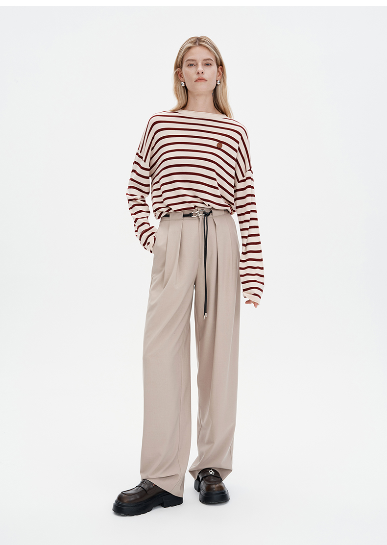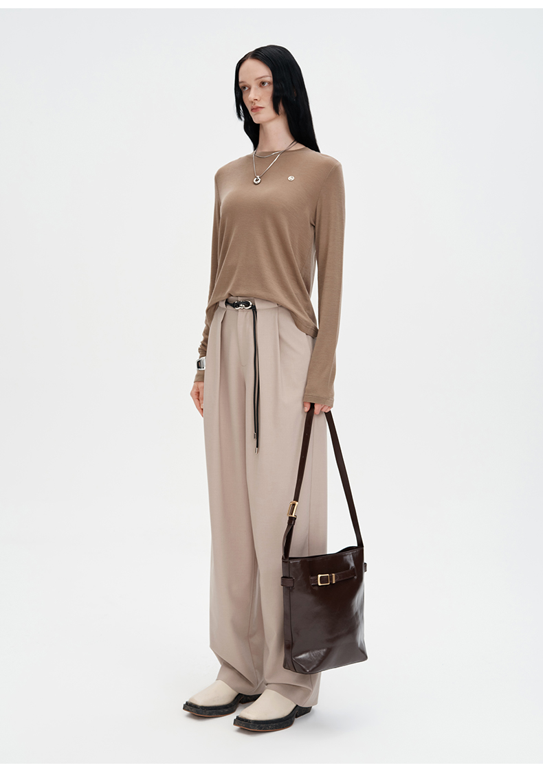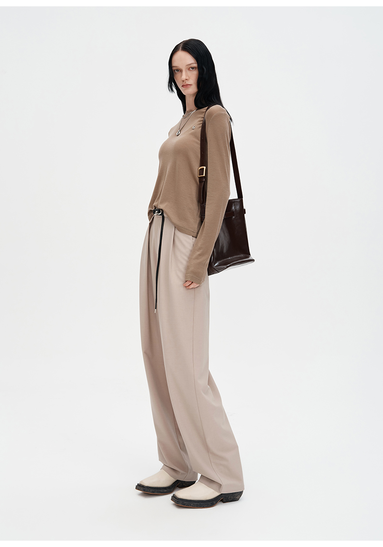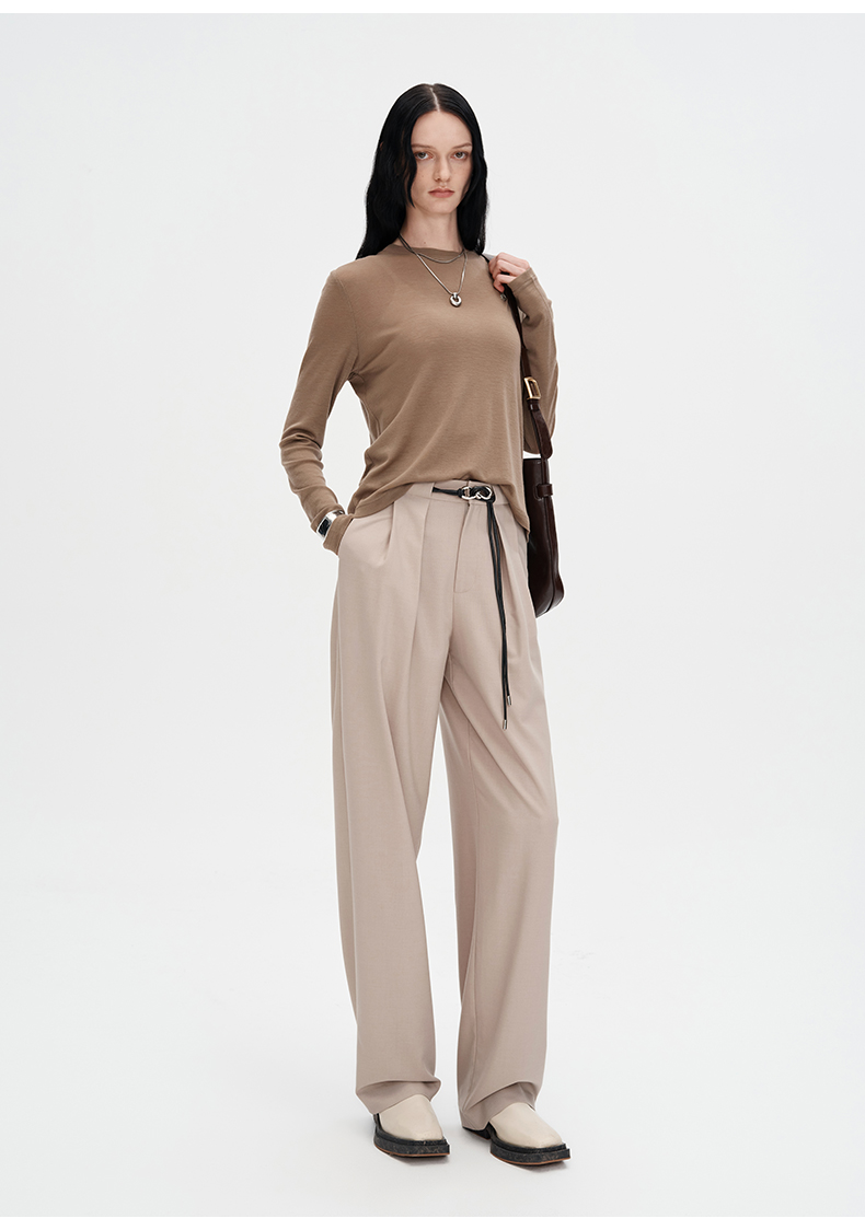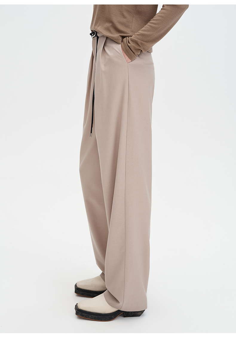 SELFWHO浅卡其羊毛混纺休闲裤西裤女2024秋新款通勤设计感直筒裤