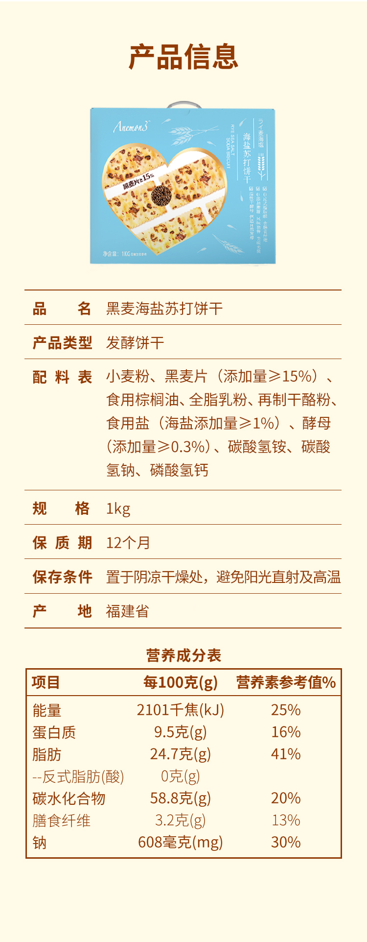 【品名】Anemon3爱你们黑麦海盐苏打饼干1kg