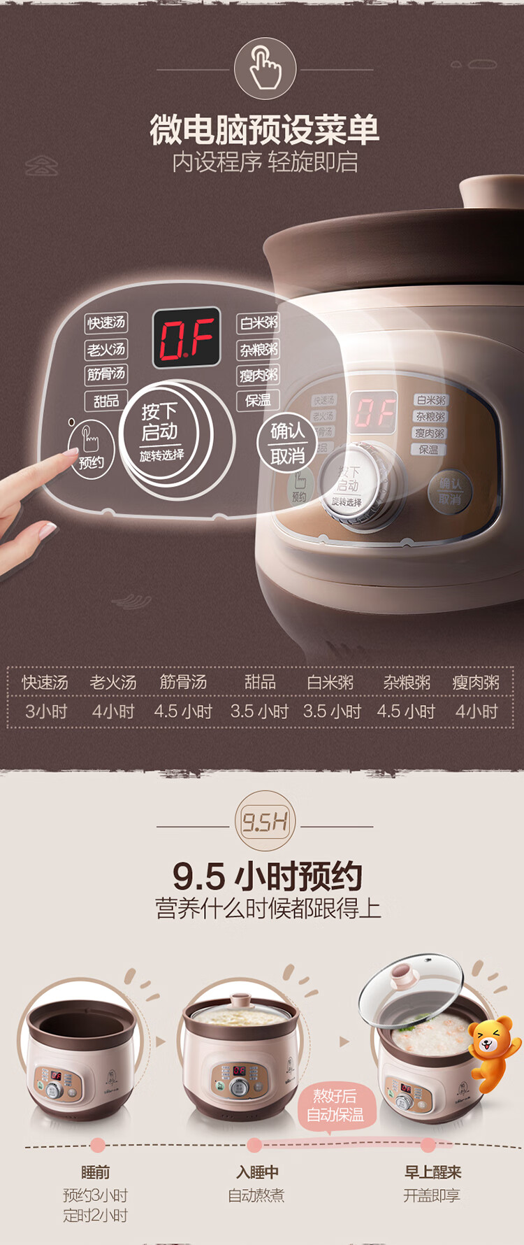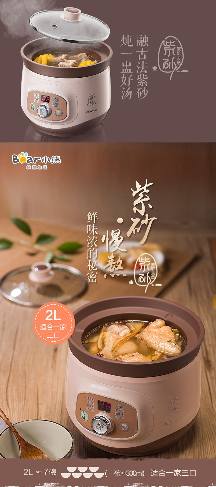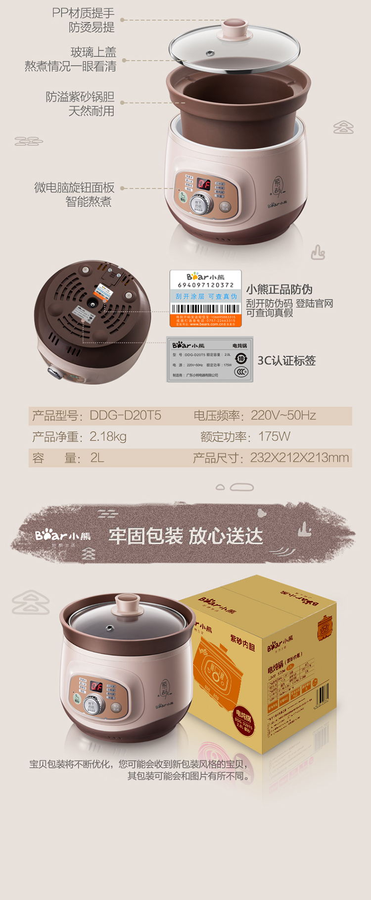 小熊(Bear)2L 电炖锅 电砂锅BB熬粥煮粥煲粥宝宝辅食煲汤锅 DDG-D20T5【ZMD安心系列】