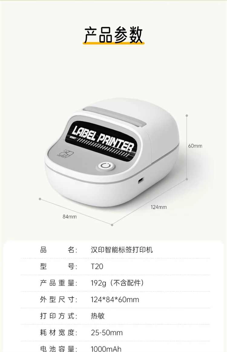汉印 收纳宽幅便携标签打印机 T20(含3卷标签纸)