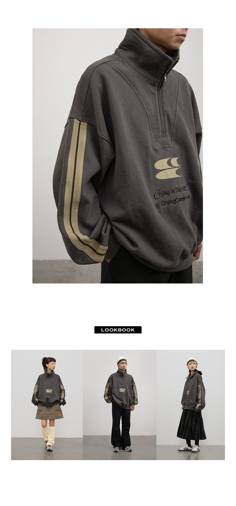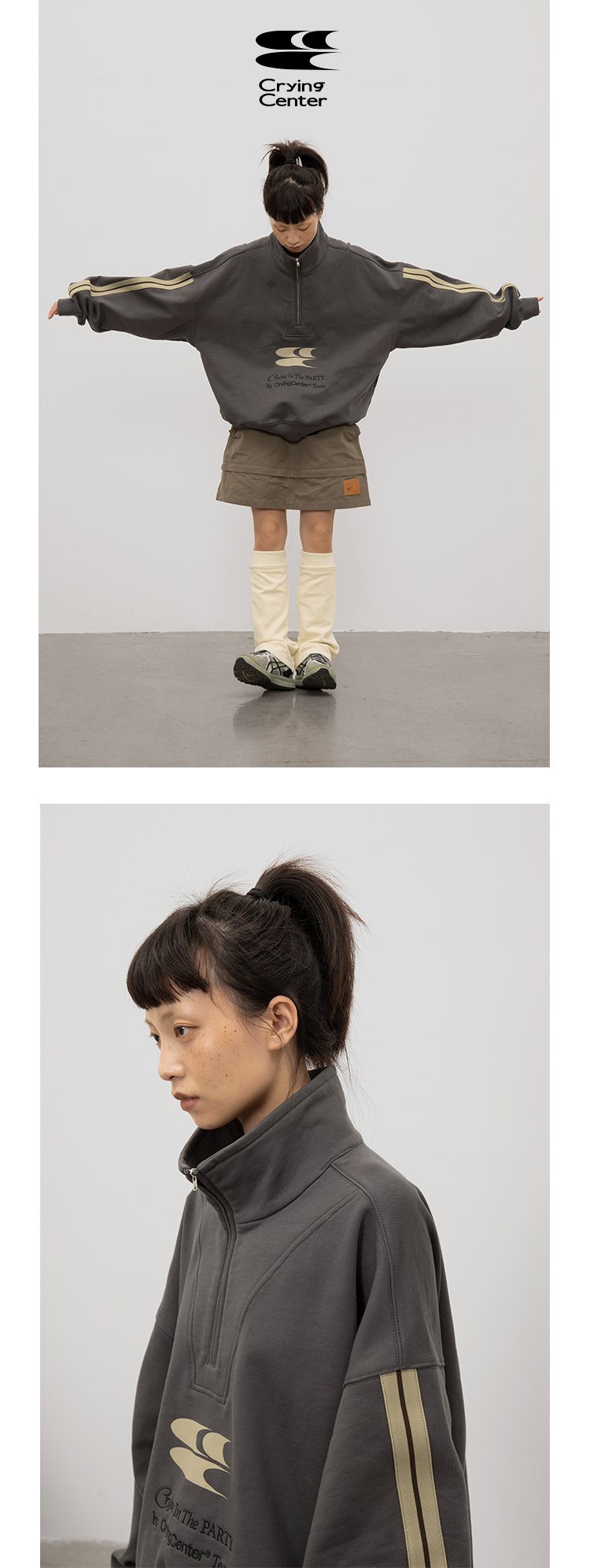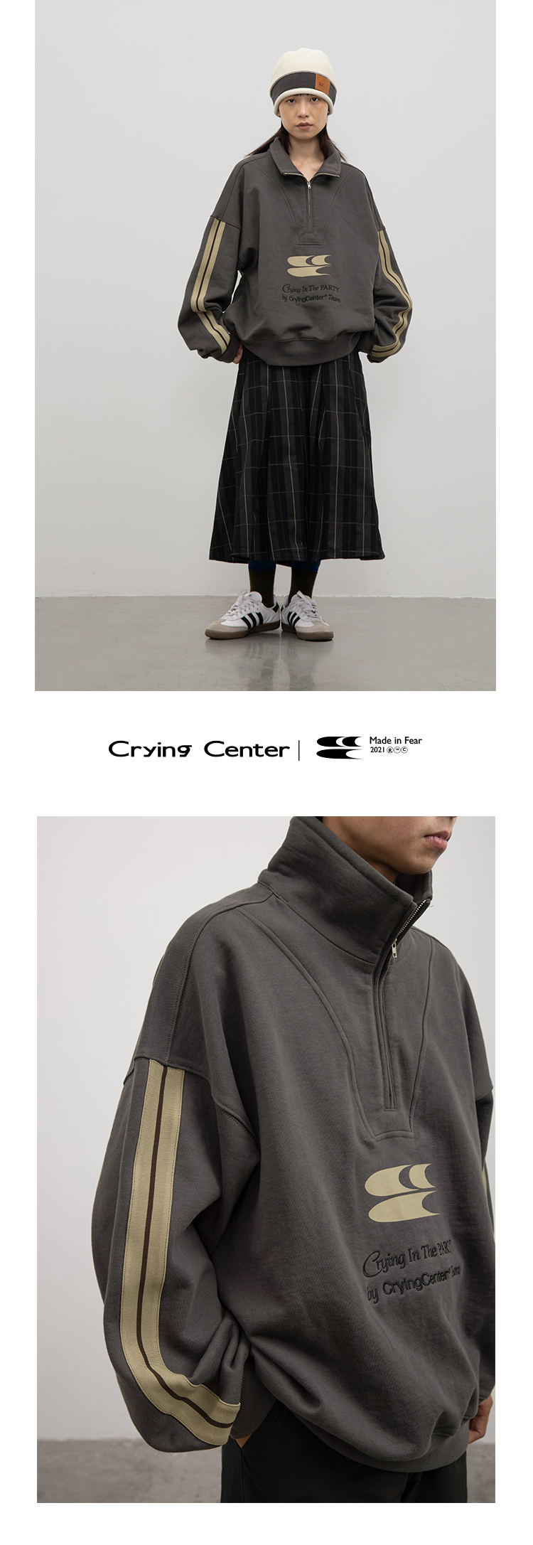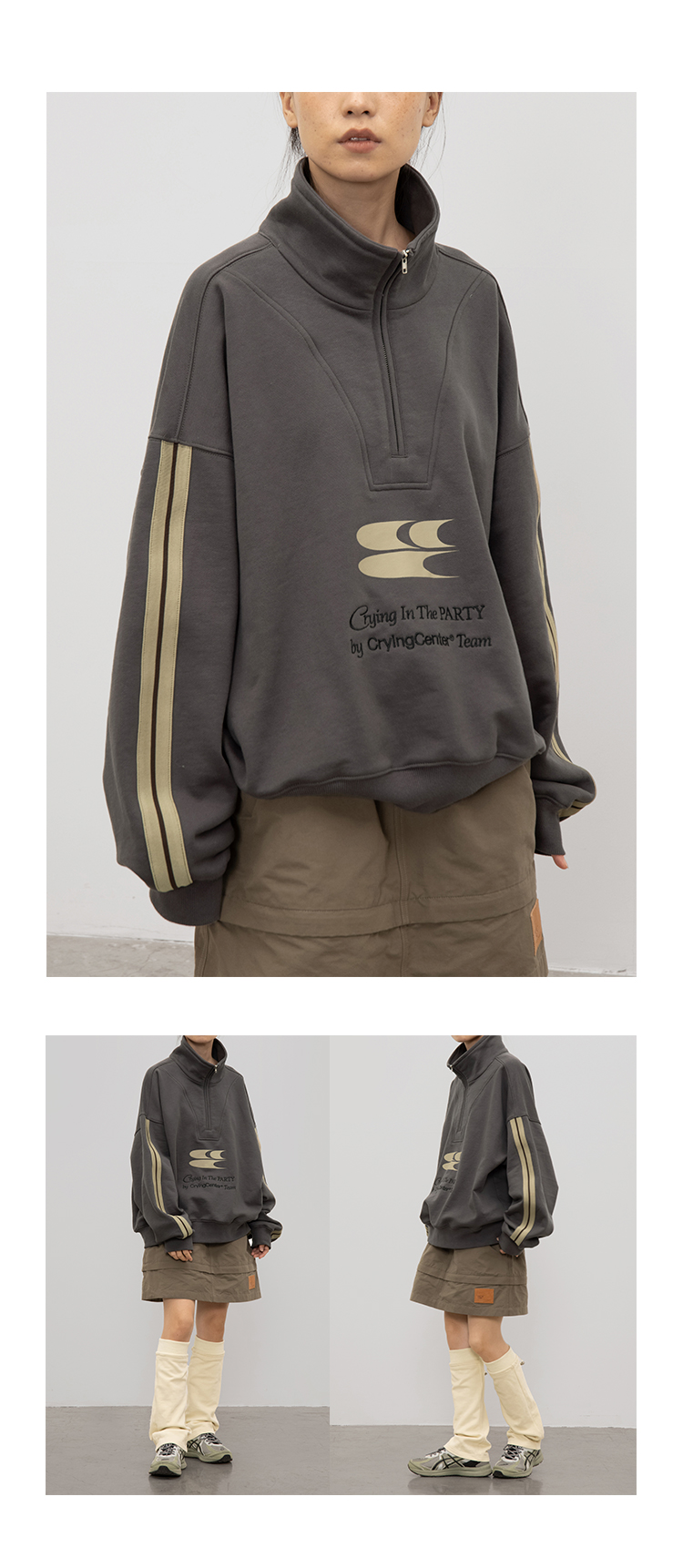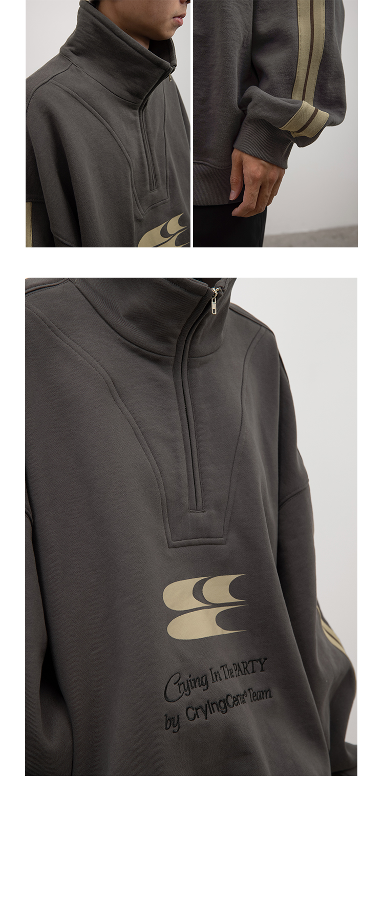 CryingCenter 含蓄的灰拉链高领卫衣 宽松LOGO运动卫衣 哭喊中心