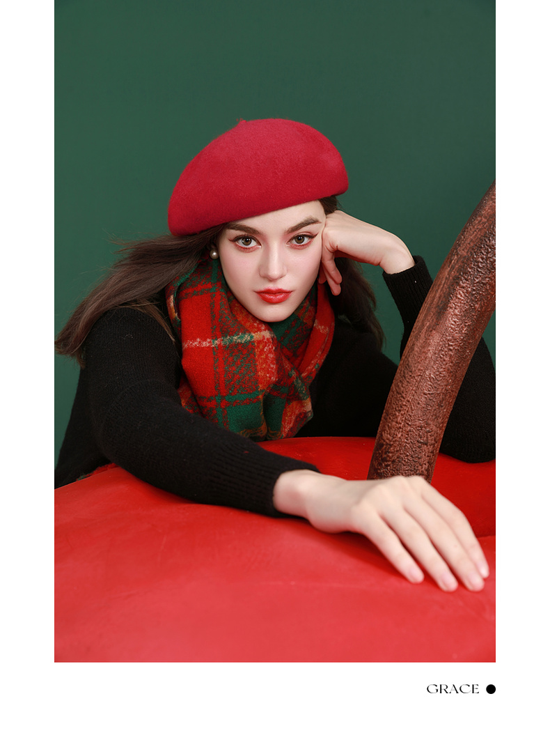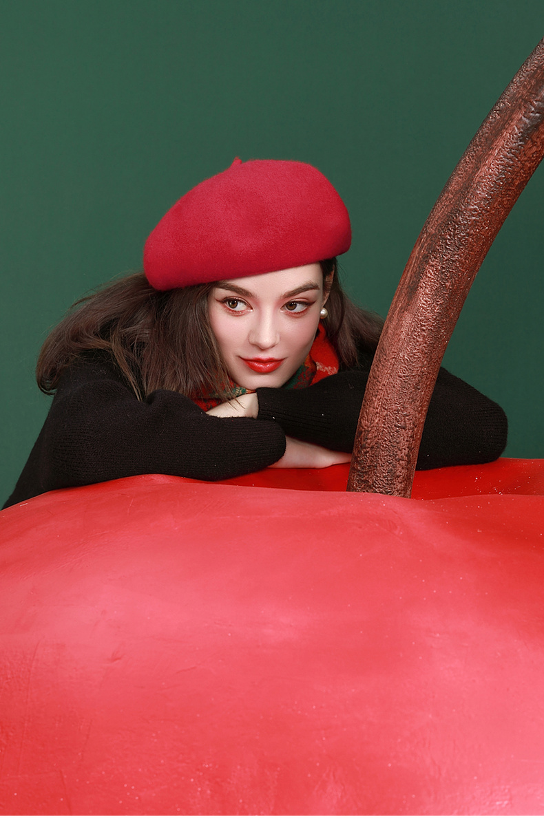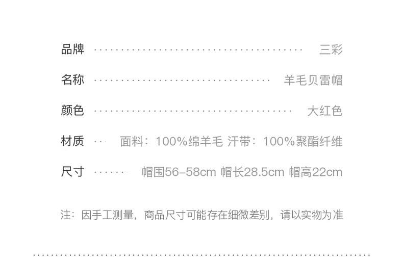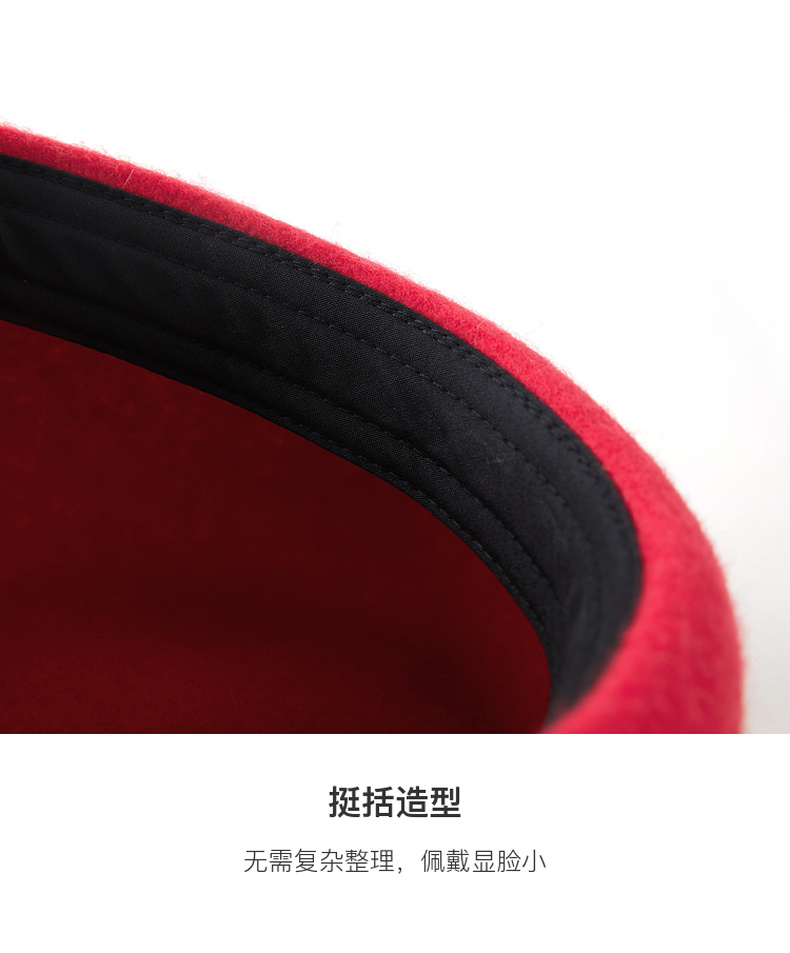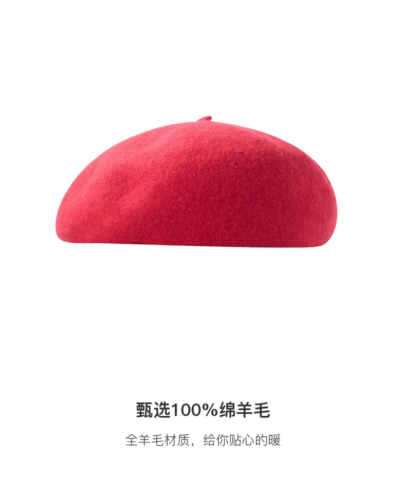 三彩2024新款秋冬绵羊毛贝雷帽保暖帽子本命年红色帽显脸小复古