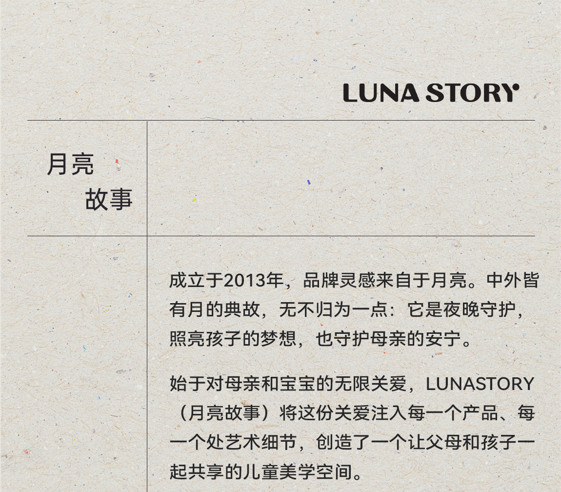 - Lunastory是2017年全新推出的母婴用品高端品牌,致力于维护孩子的安全与健康。以父母之心,开发多种母婴用品,目标是让客户只用Lunastory就能打造出温馨的儿童房。