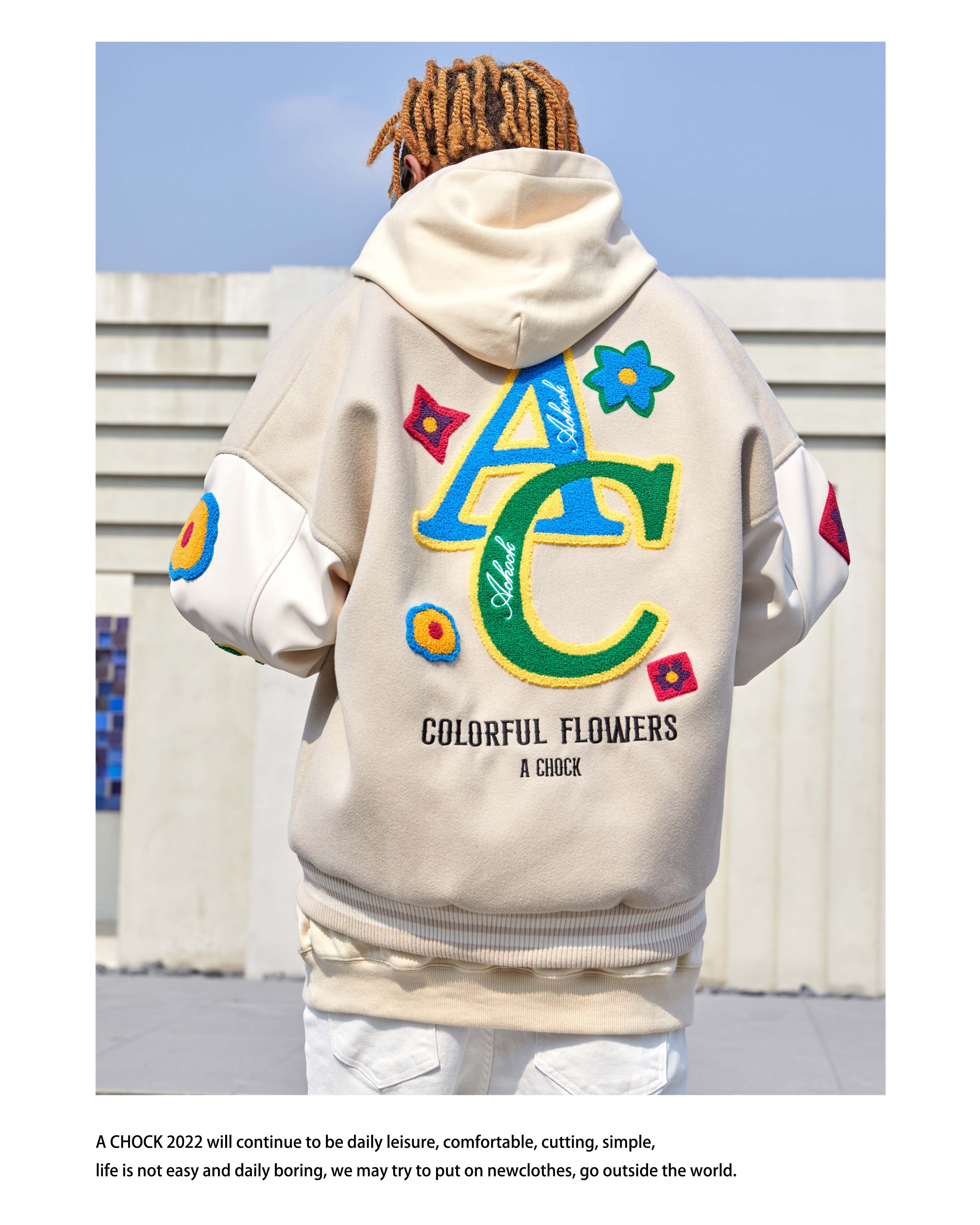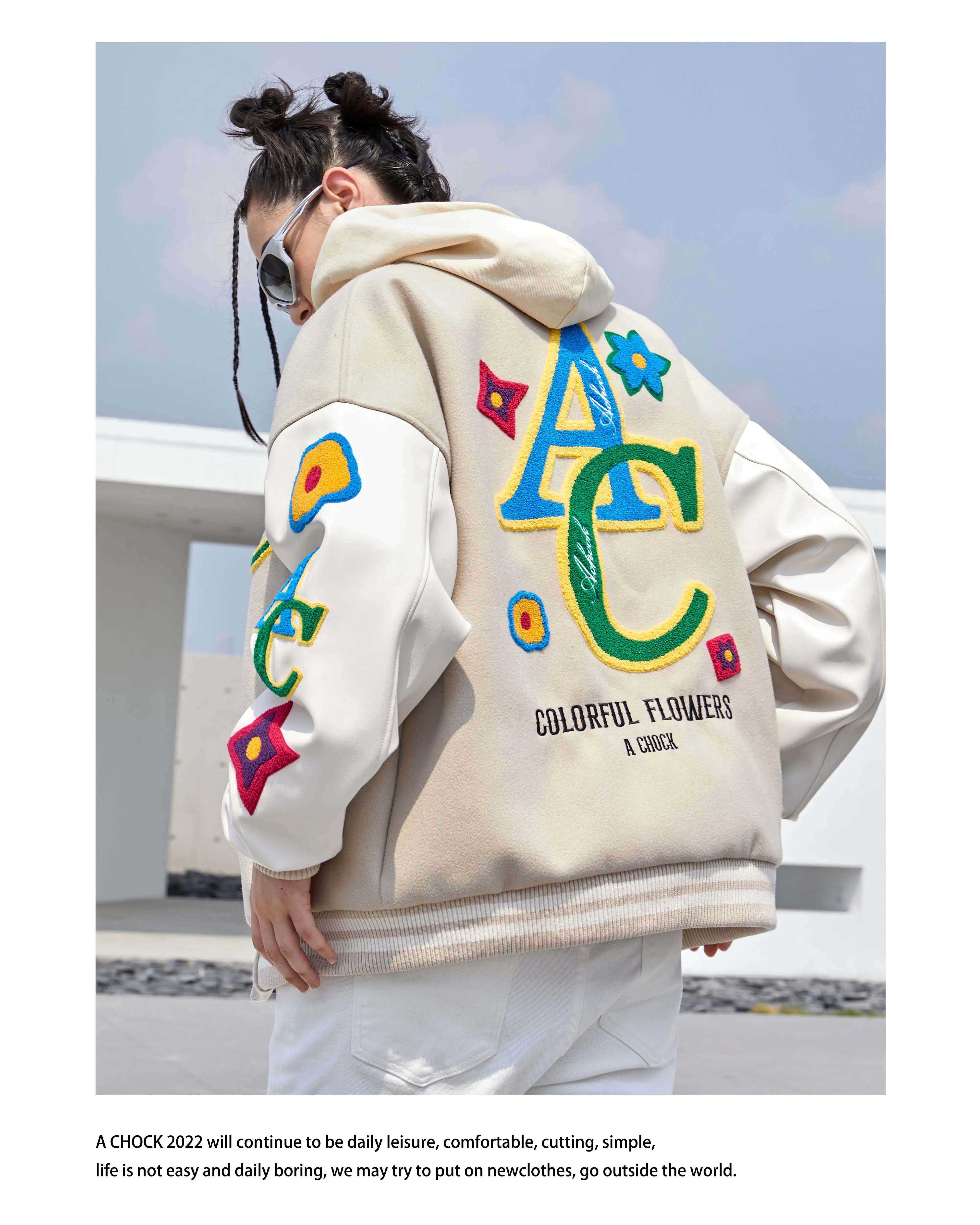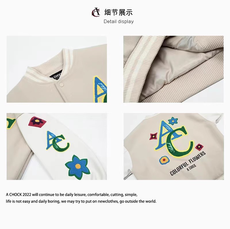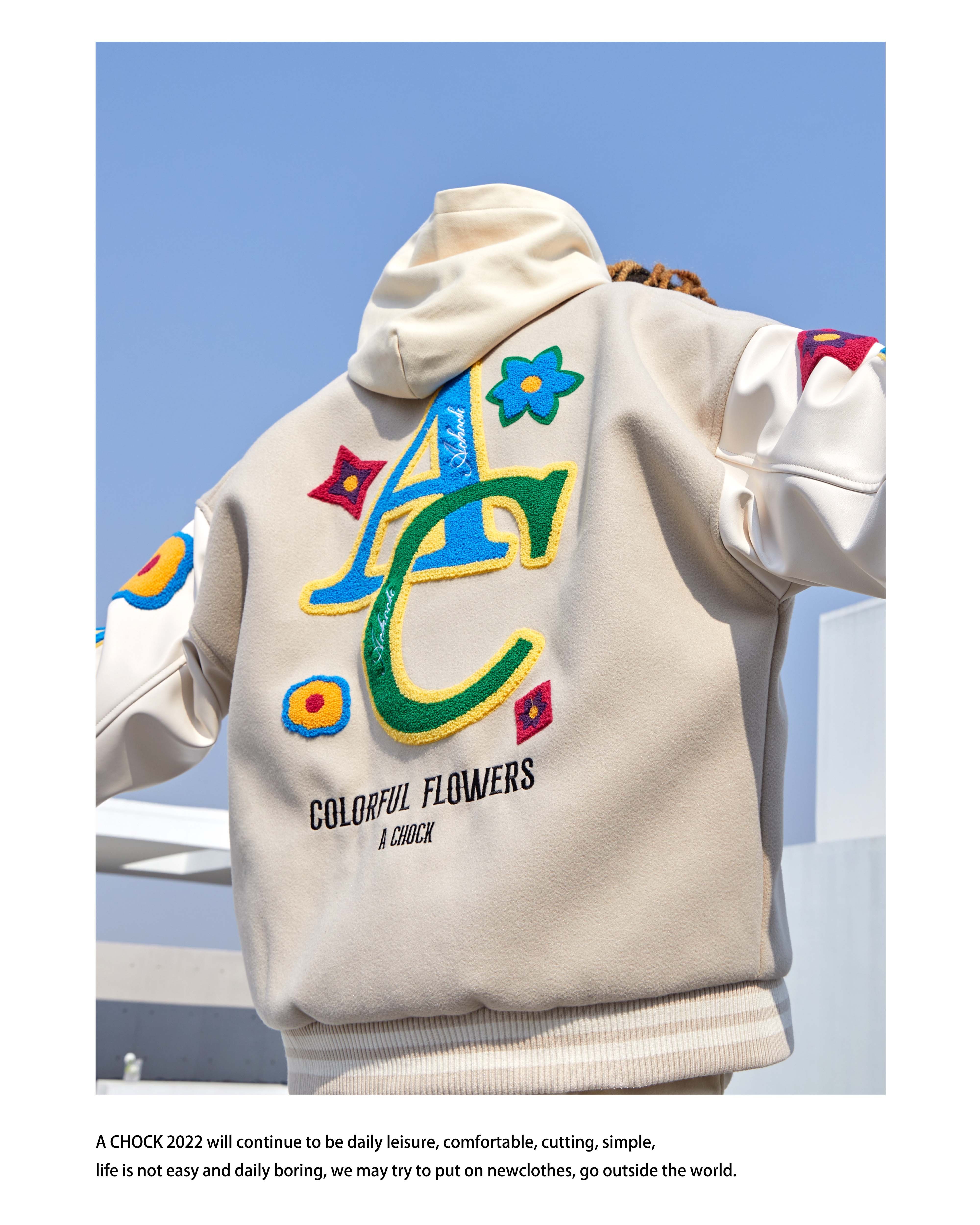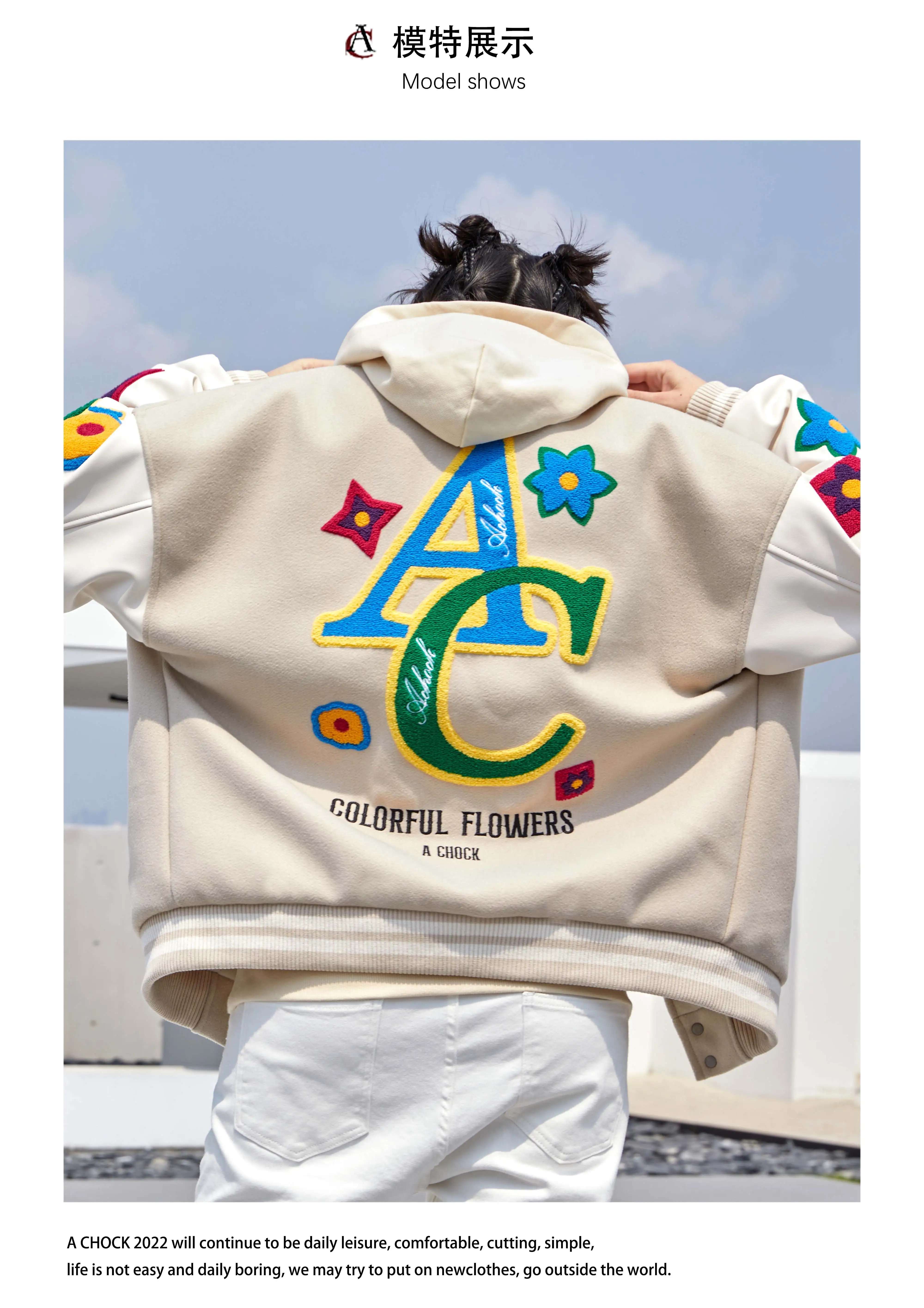 Achock美式休闲彩虹碎花系列毛巾绣植绒夹克潮牌杏色单排扣棒球服