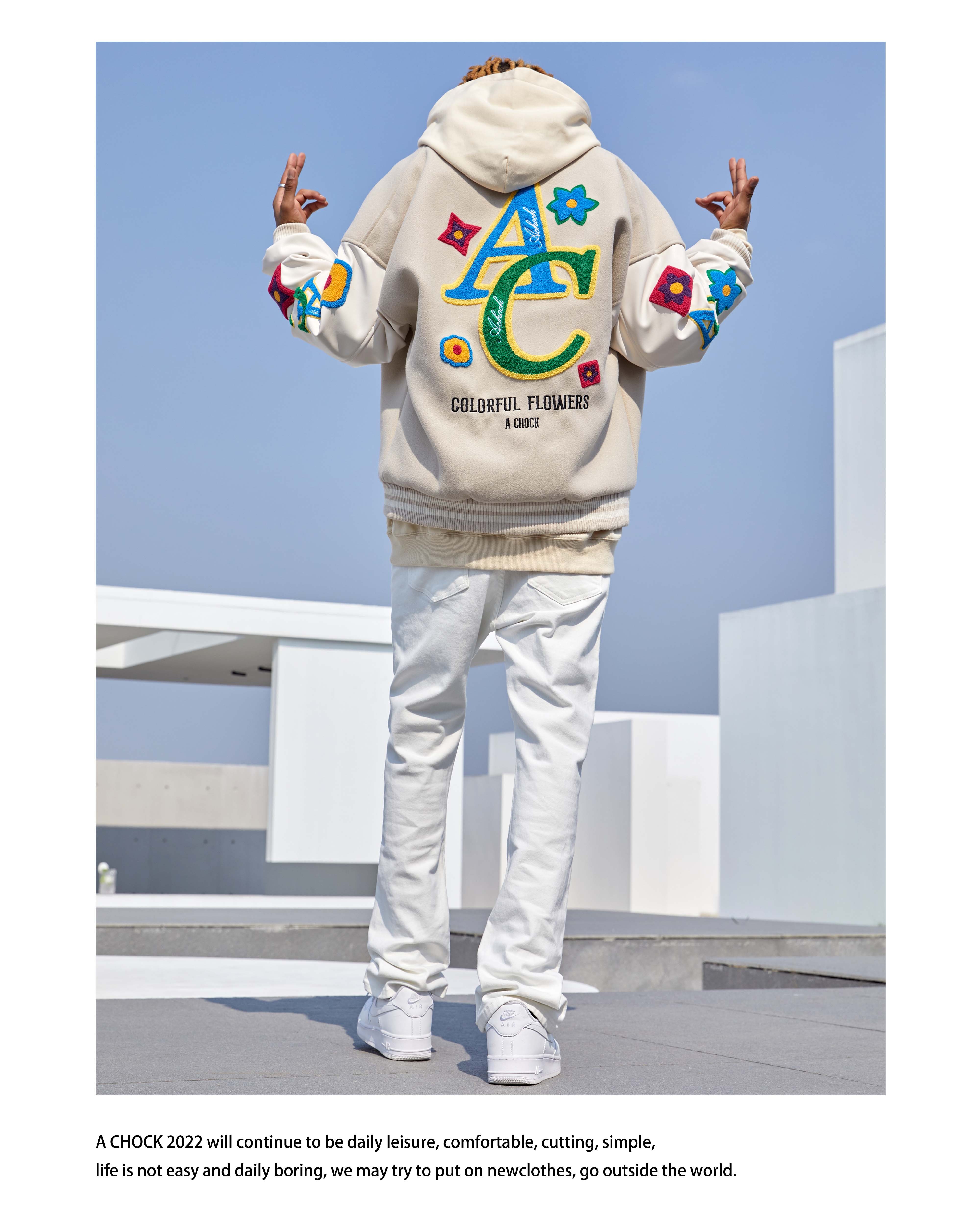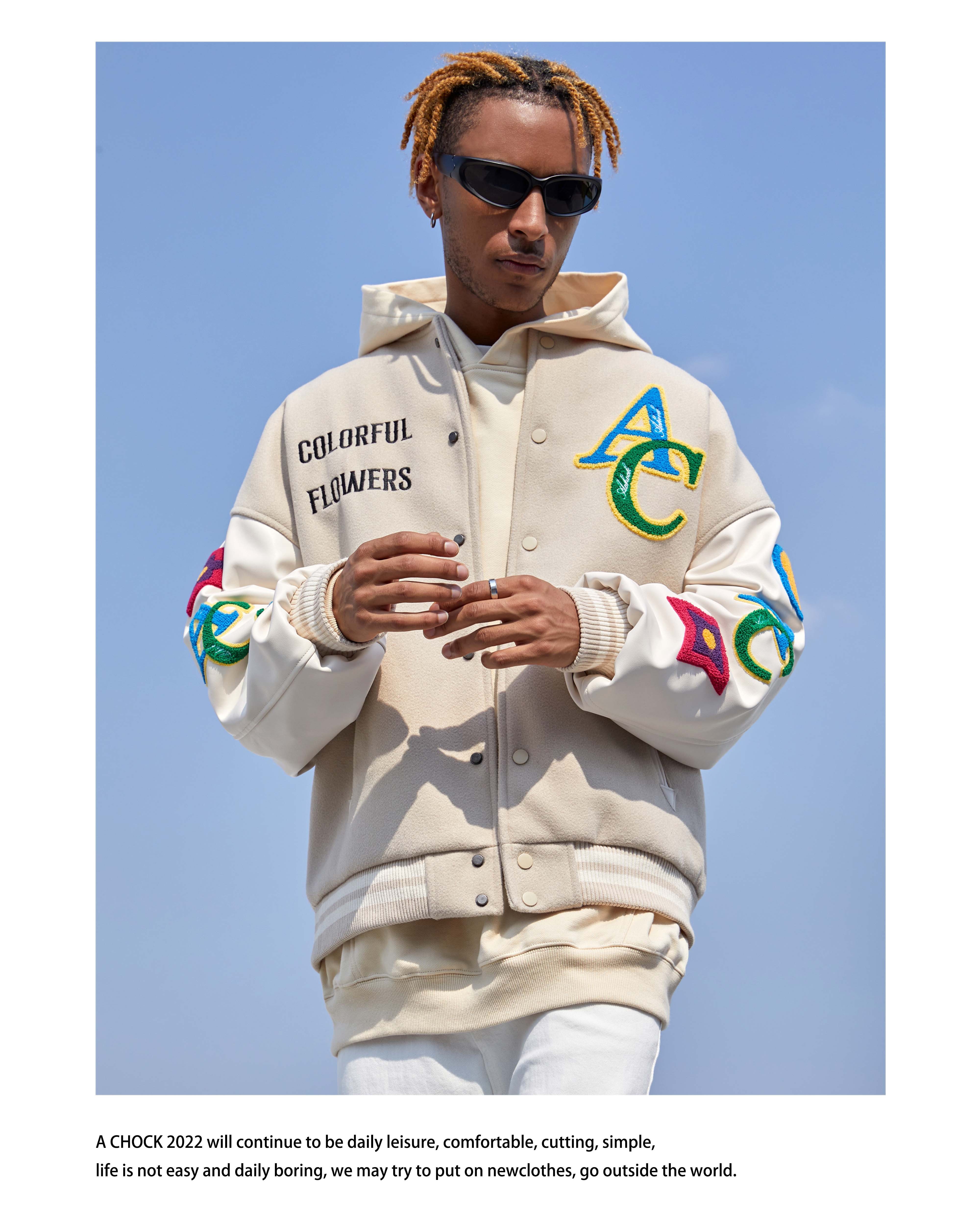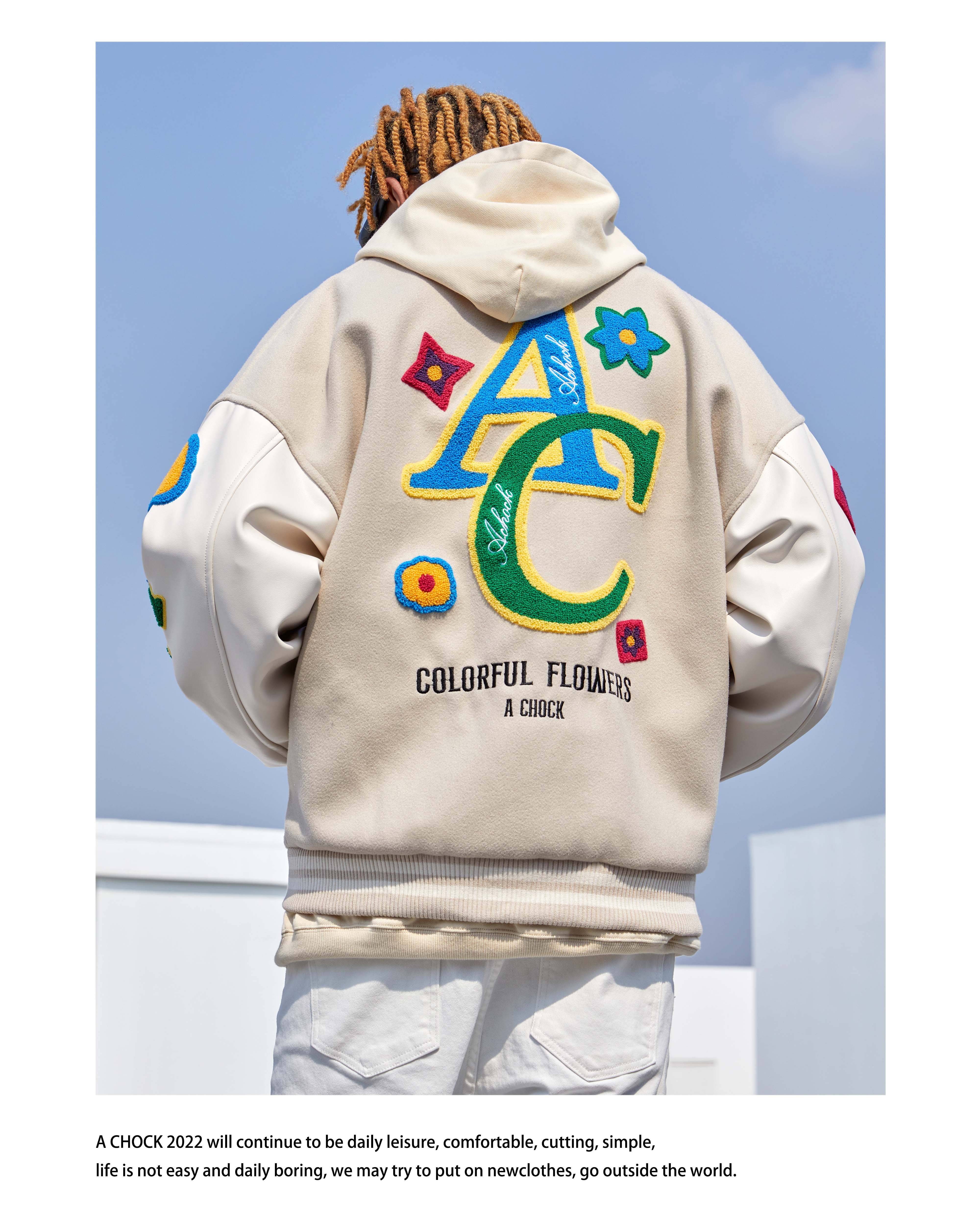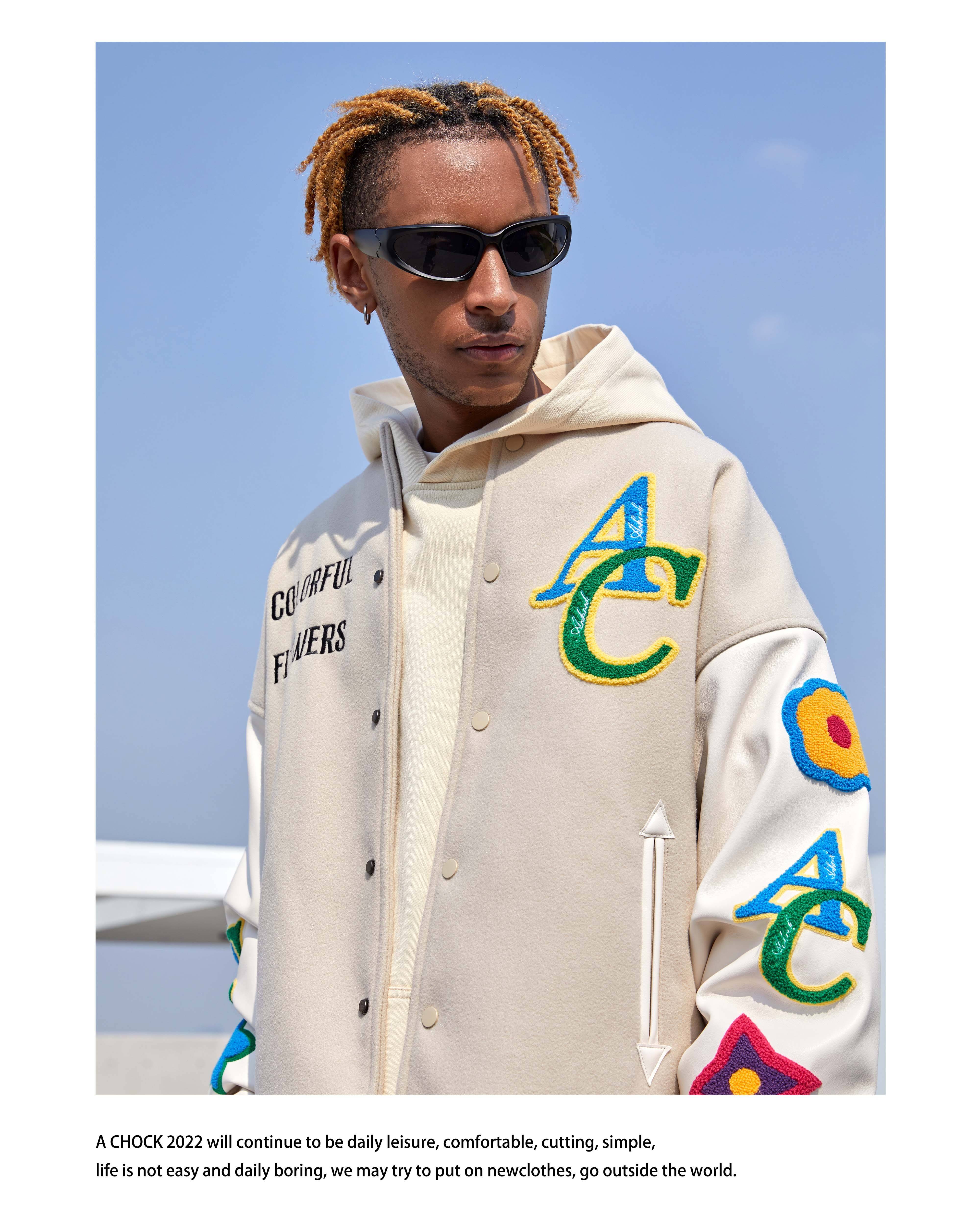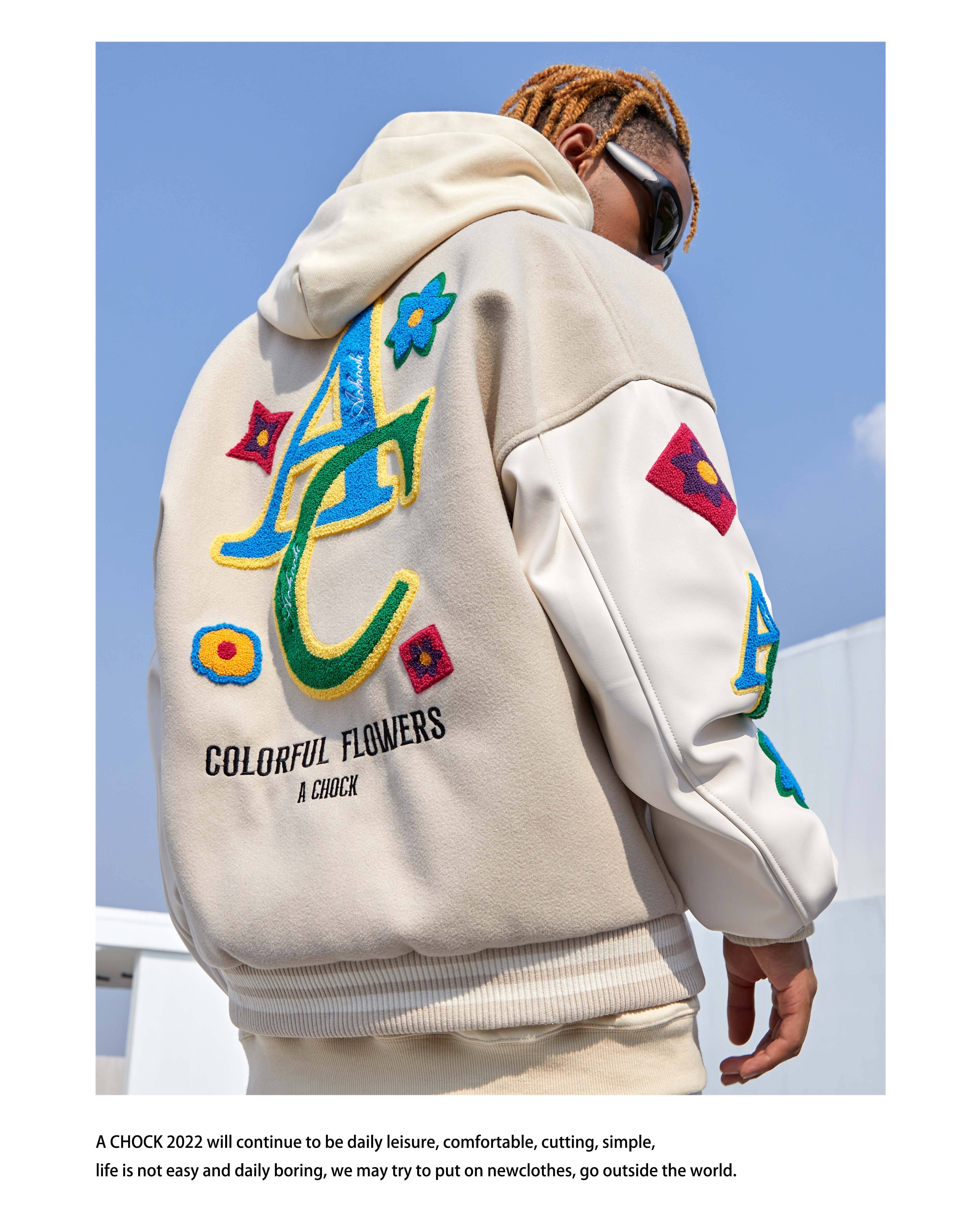 Achock美式休闲彩虹碎花系列毛巾绣植绒夹克潮牌杏色单排扣棒球服