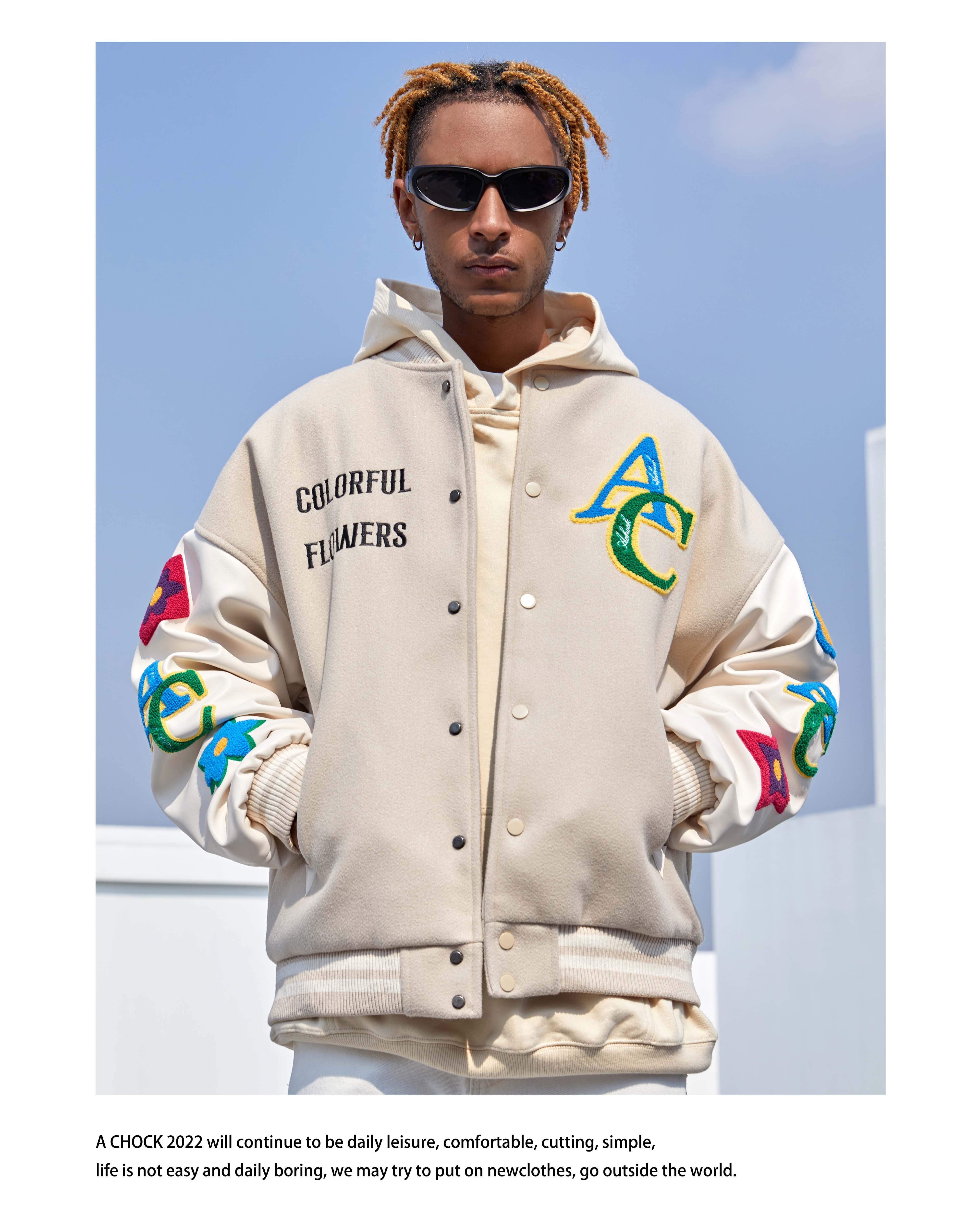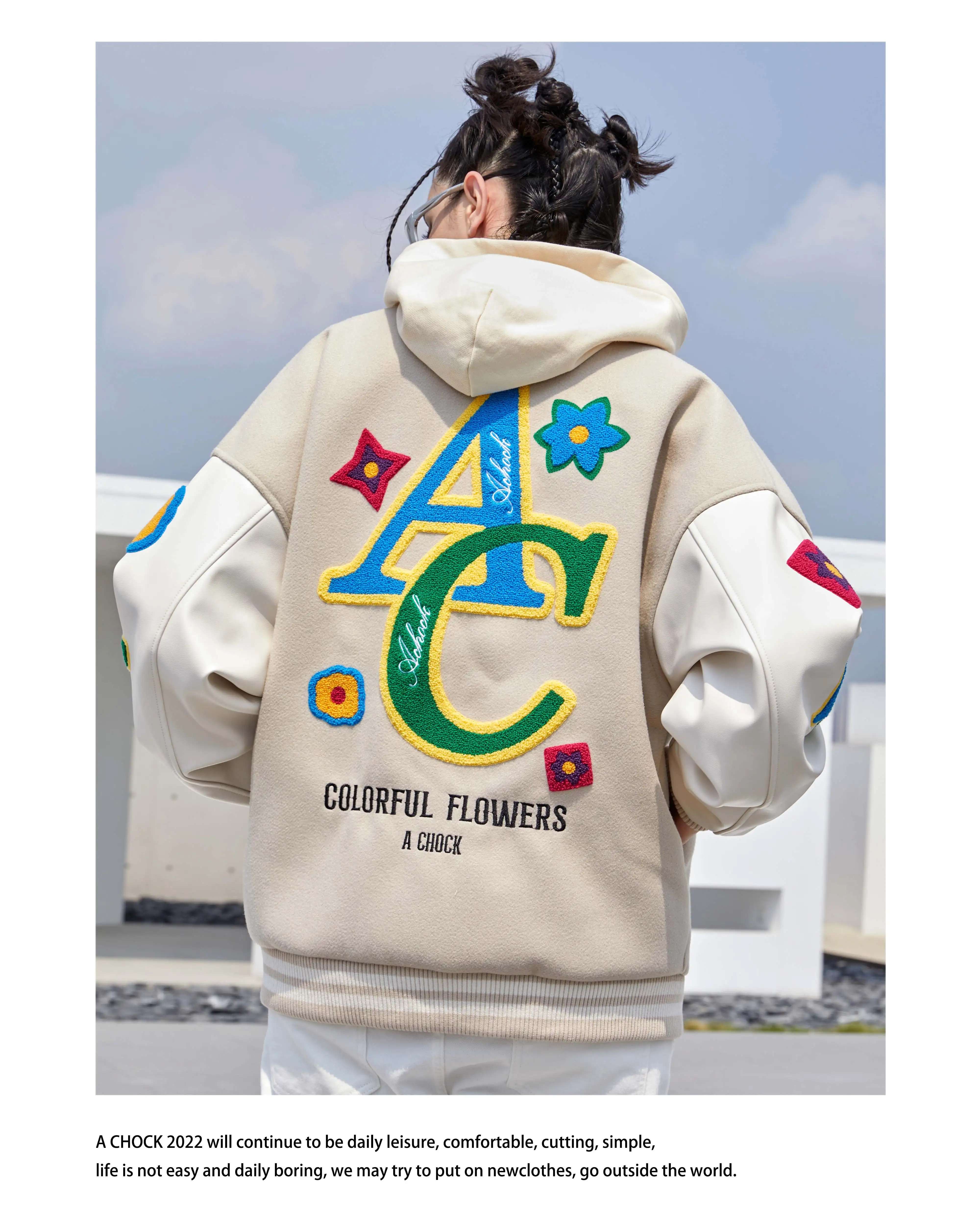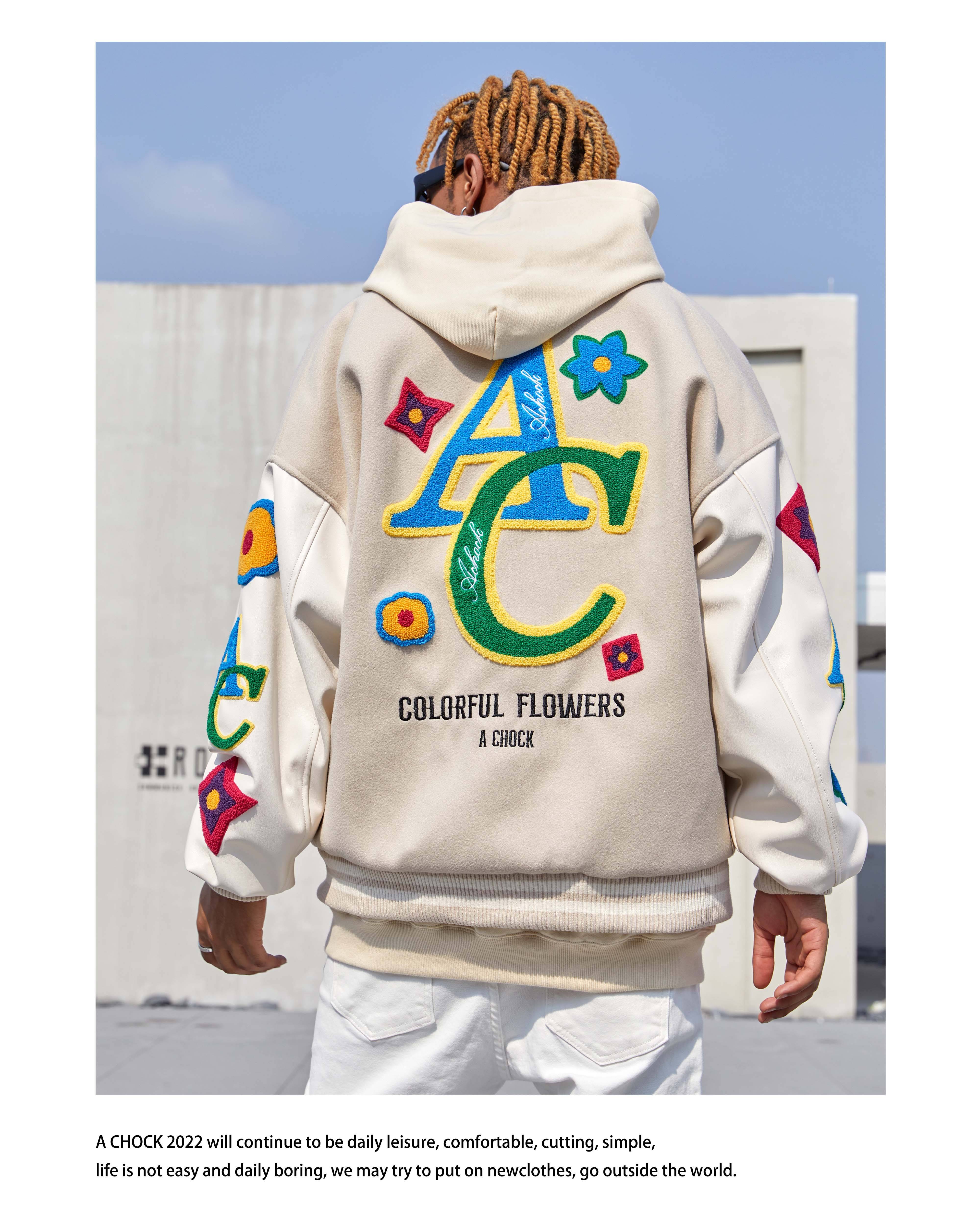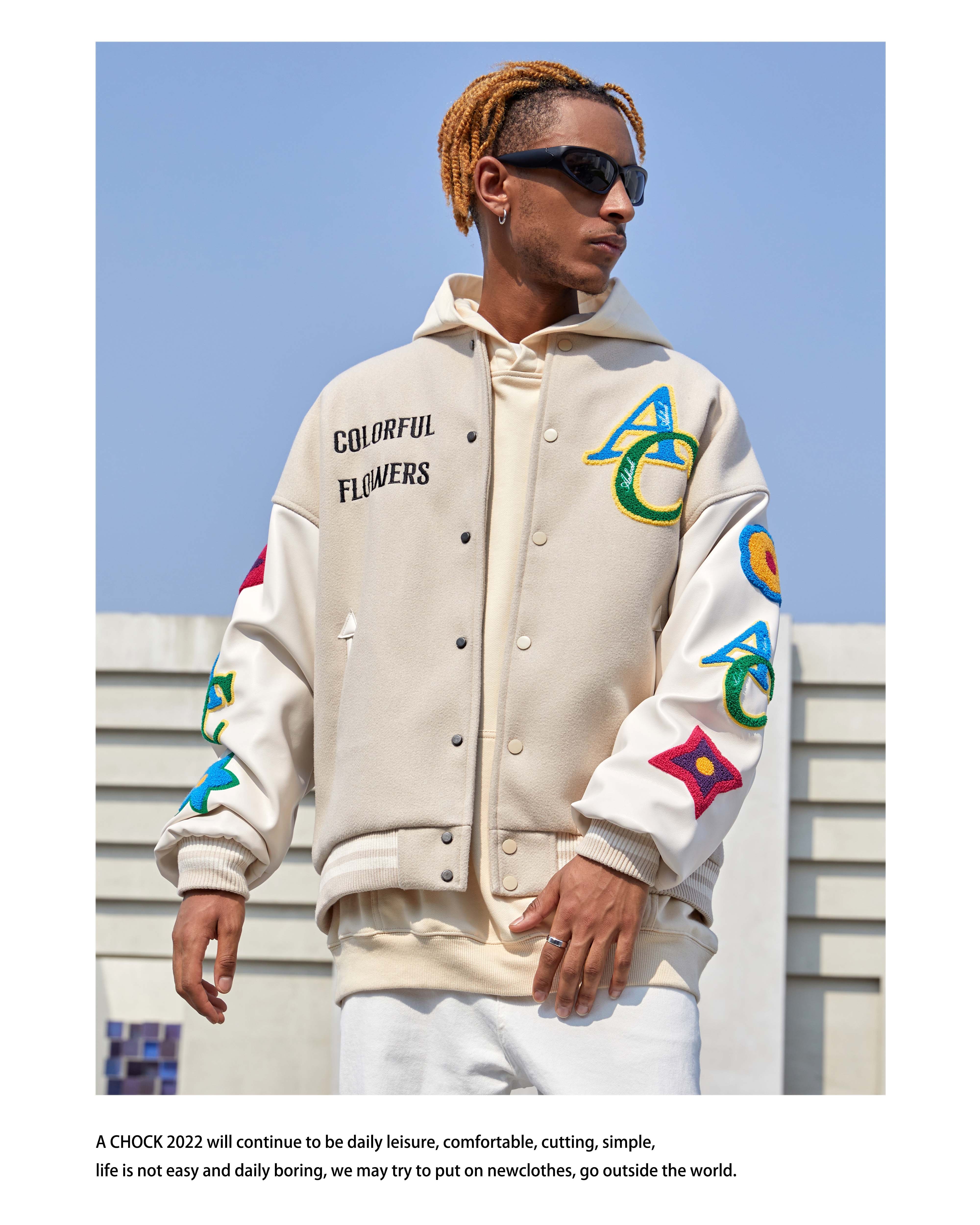 Achock美式休闲彩虹碎花系列毛巾绣植绒夹克潮牌杏色单排扣棒球服