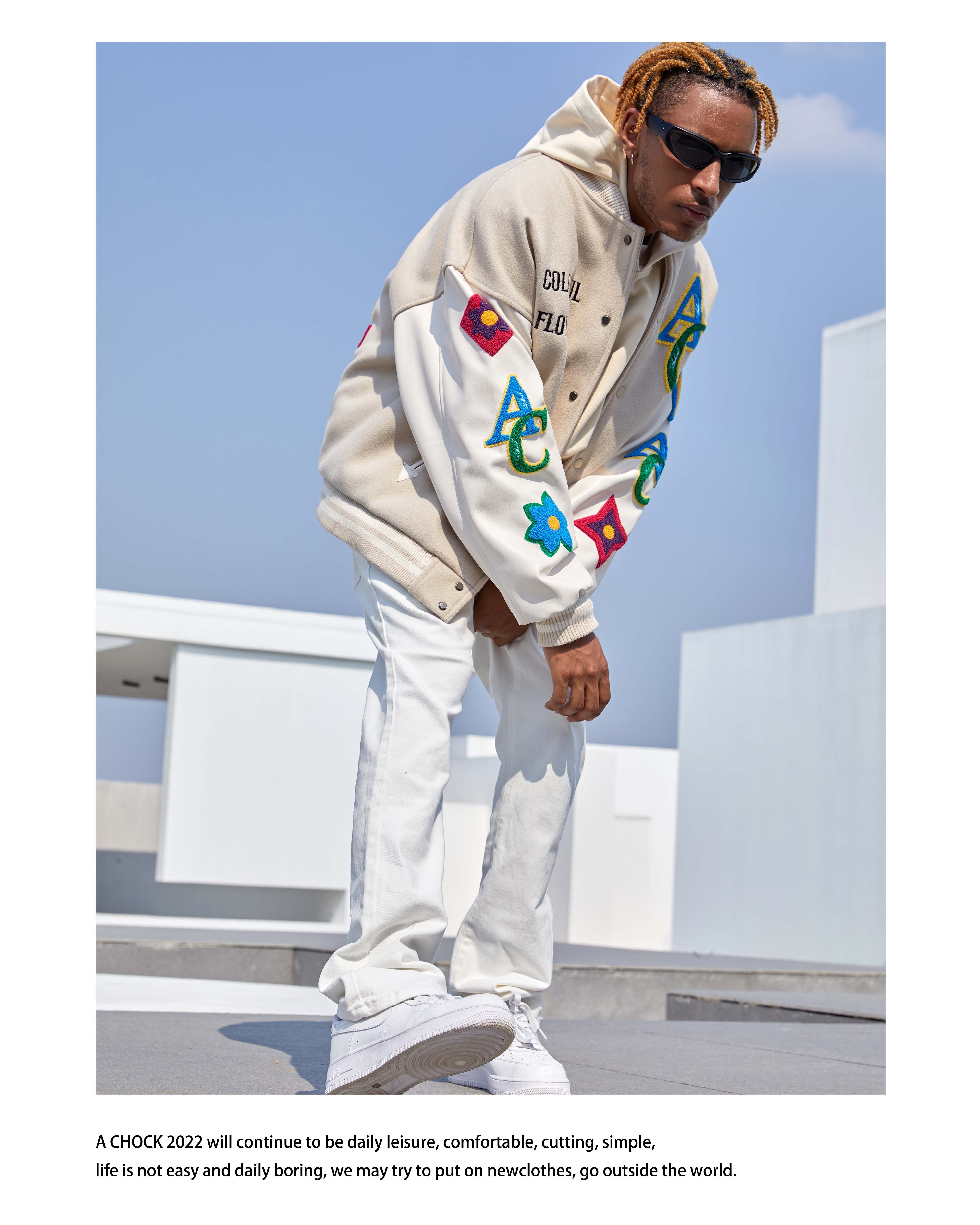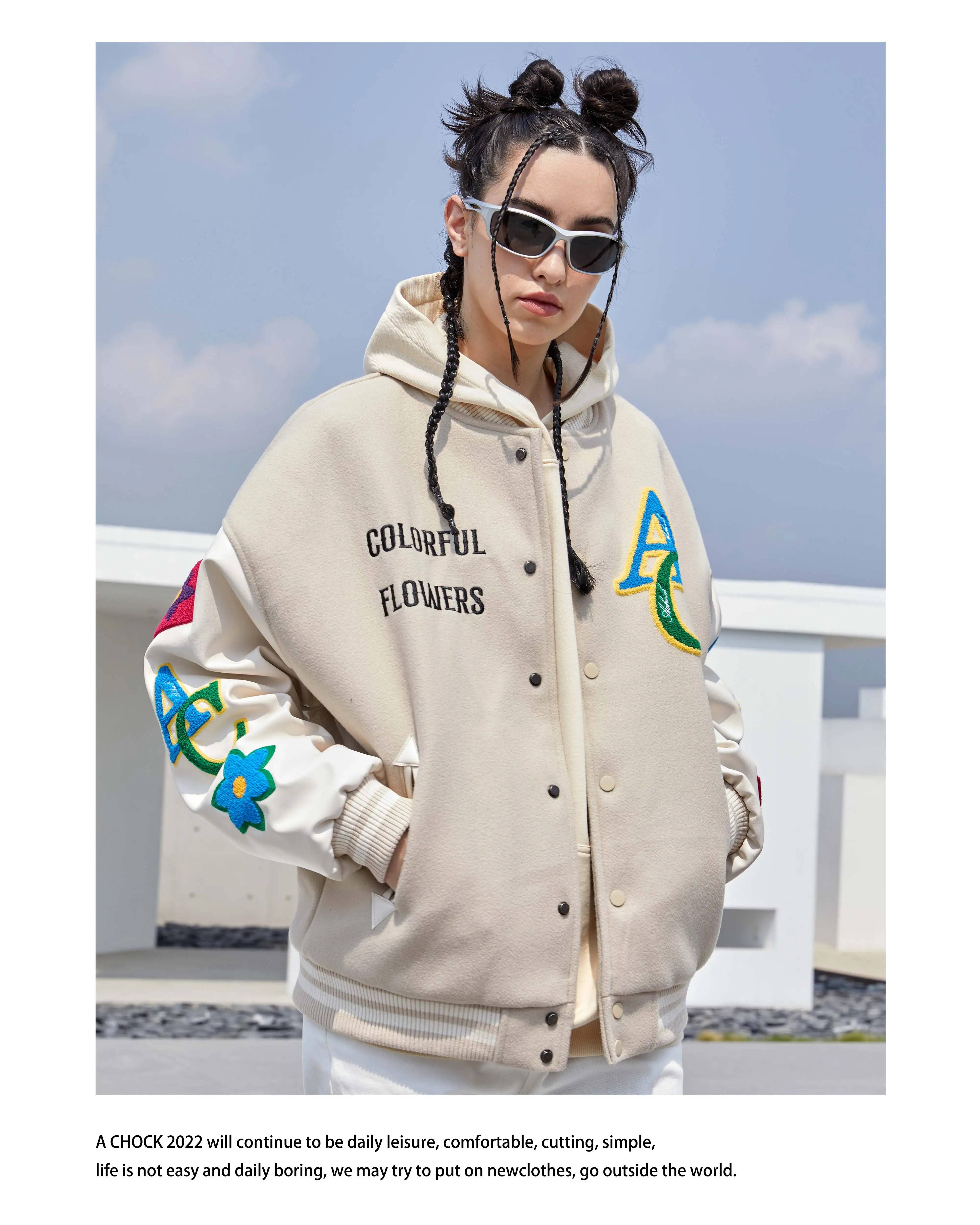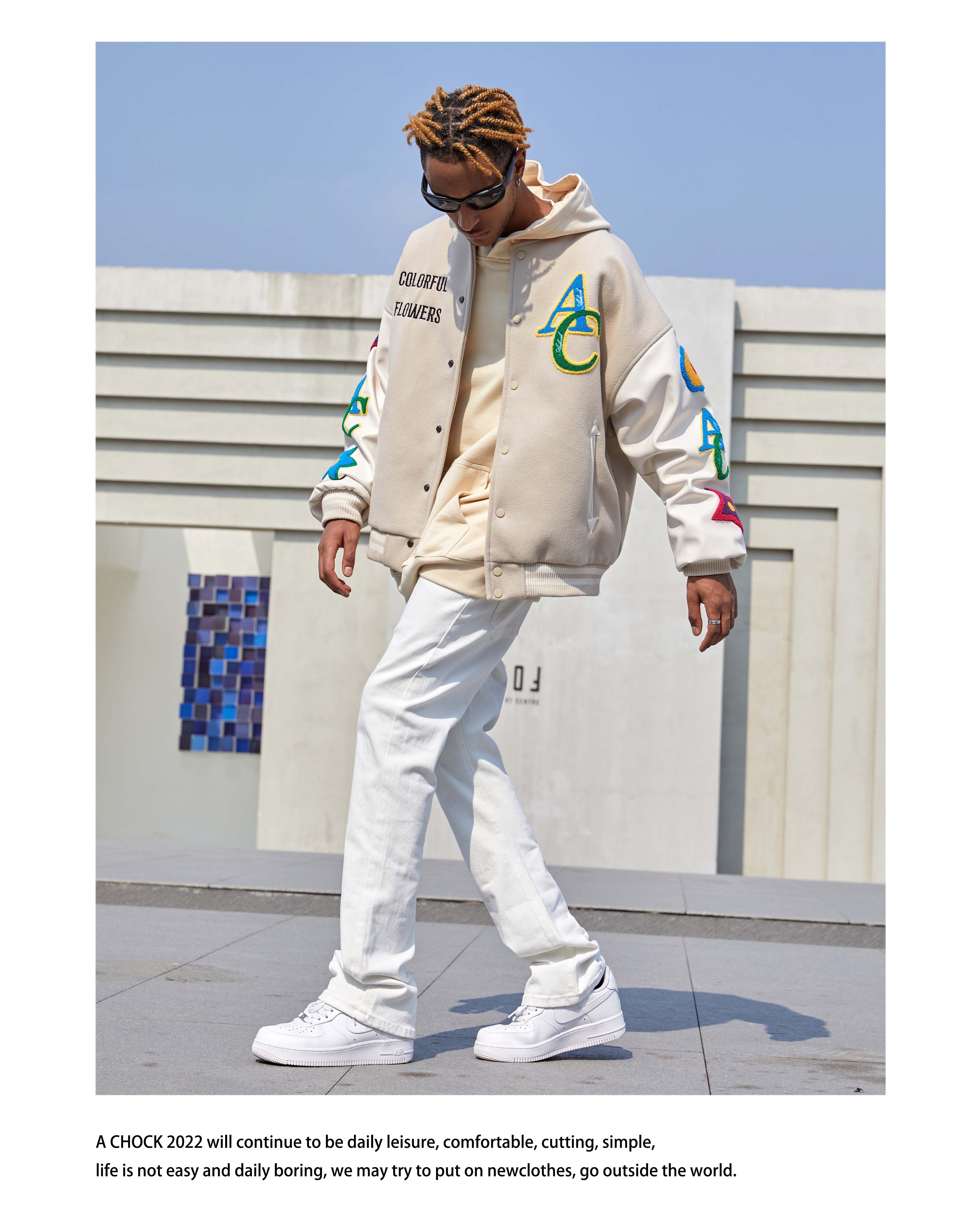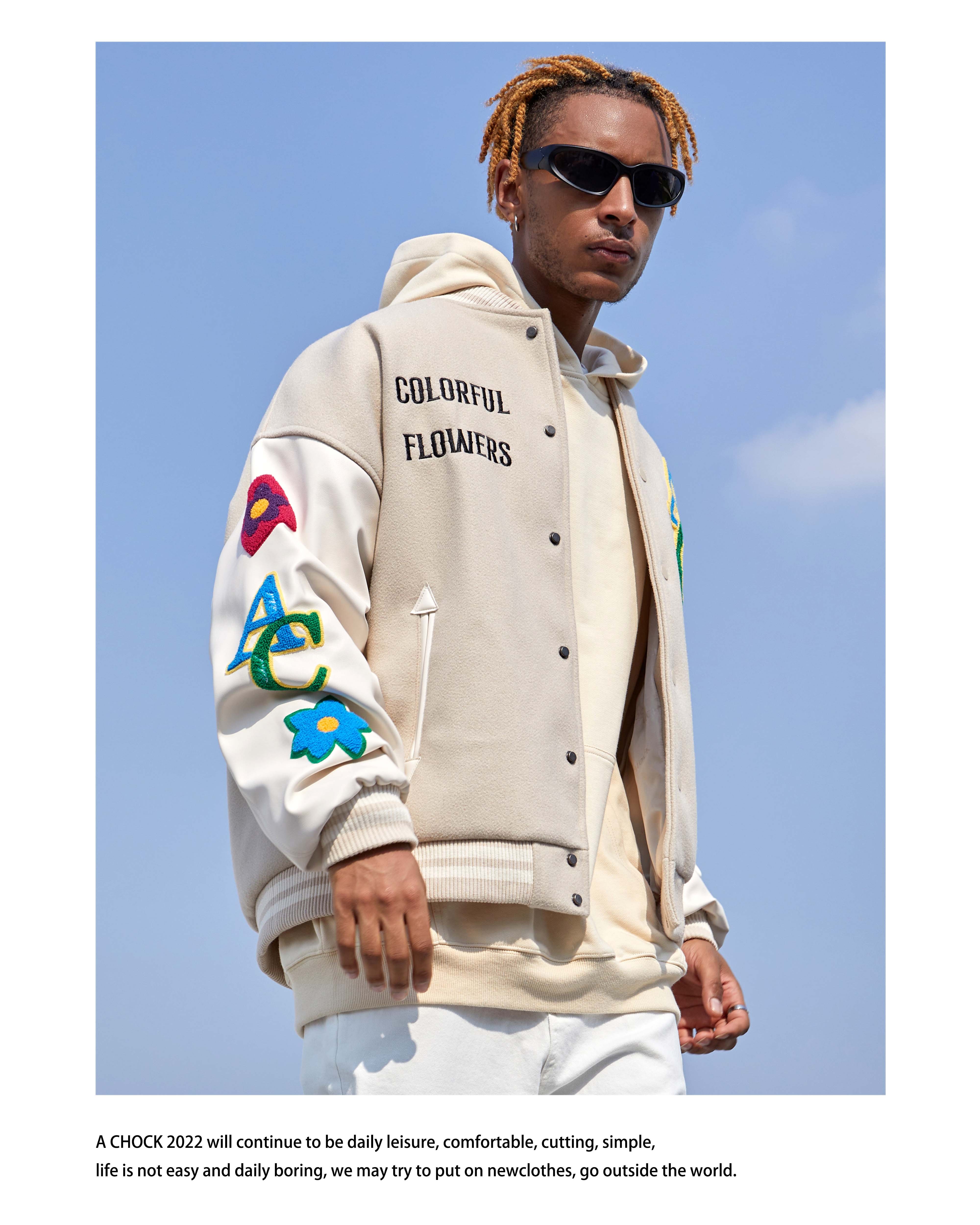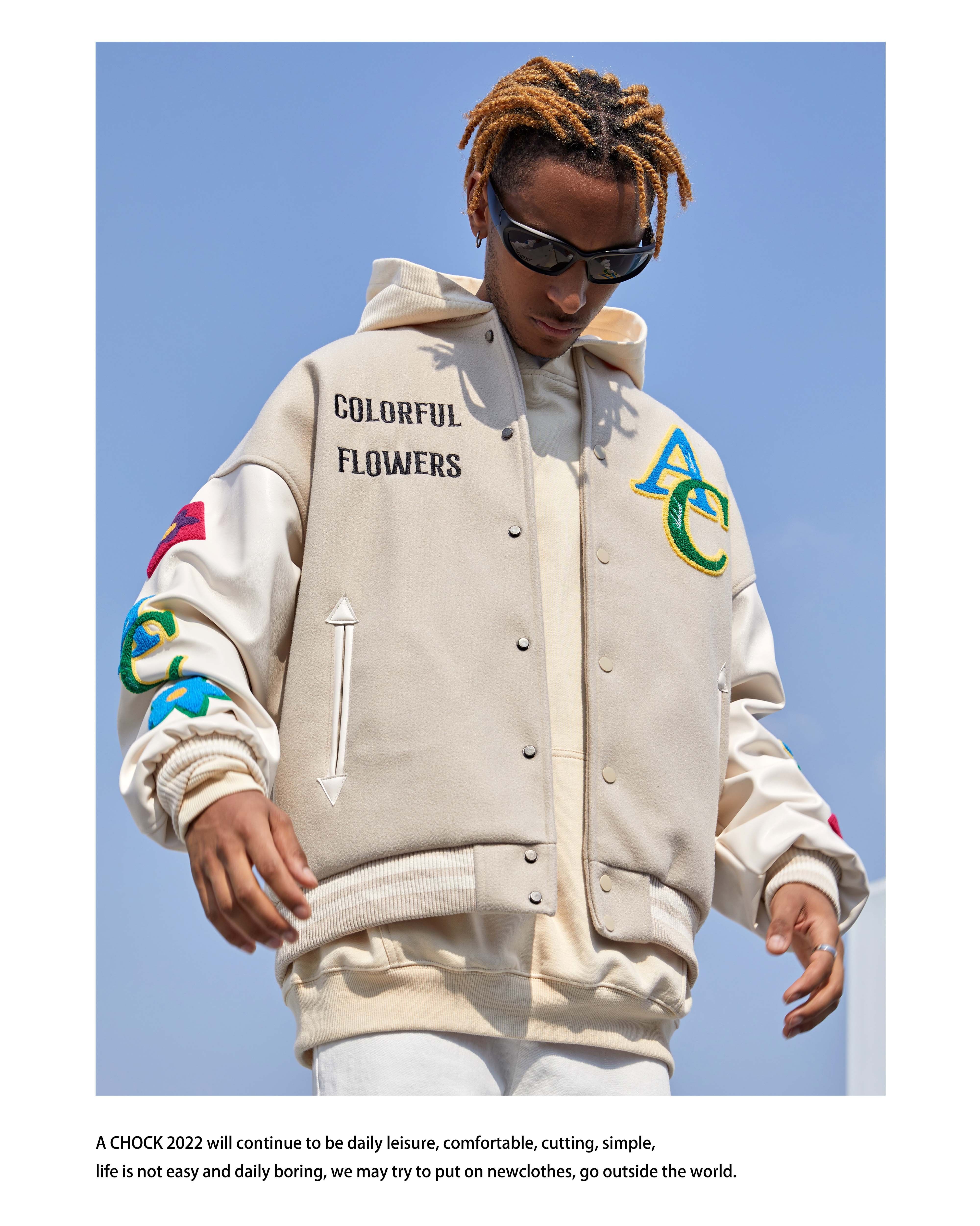 Achock美式休闲彩虹碎花系列毛巾绣植绒夹克潮牌杏色单排扣棒球服