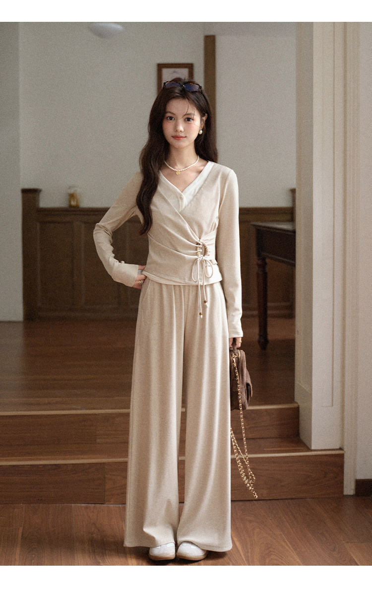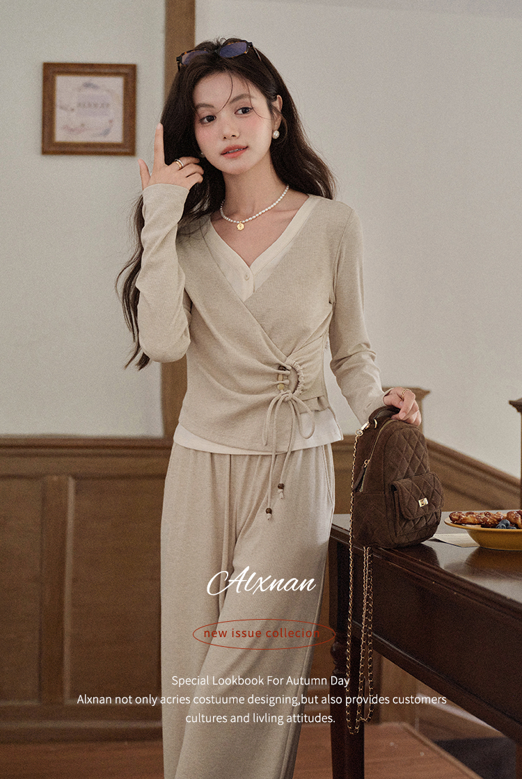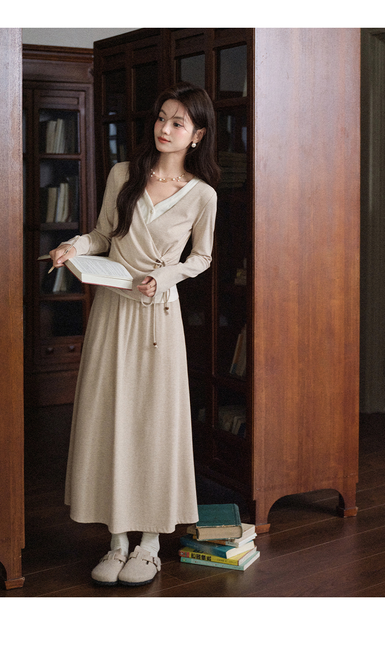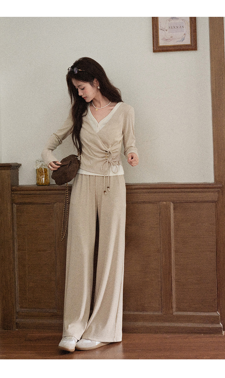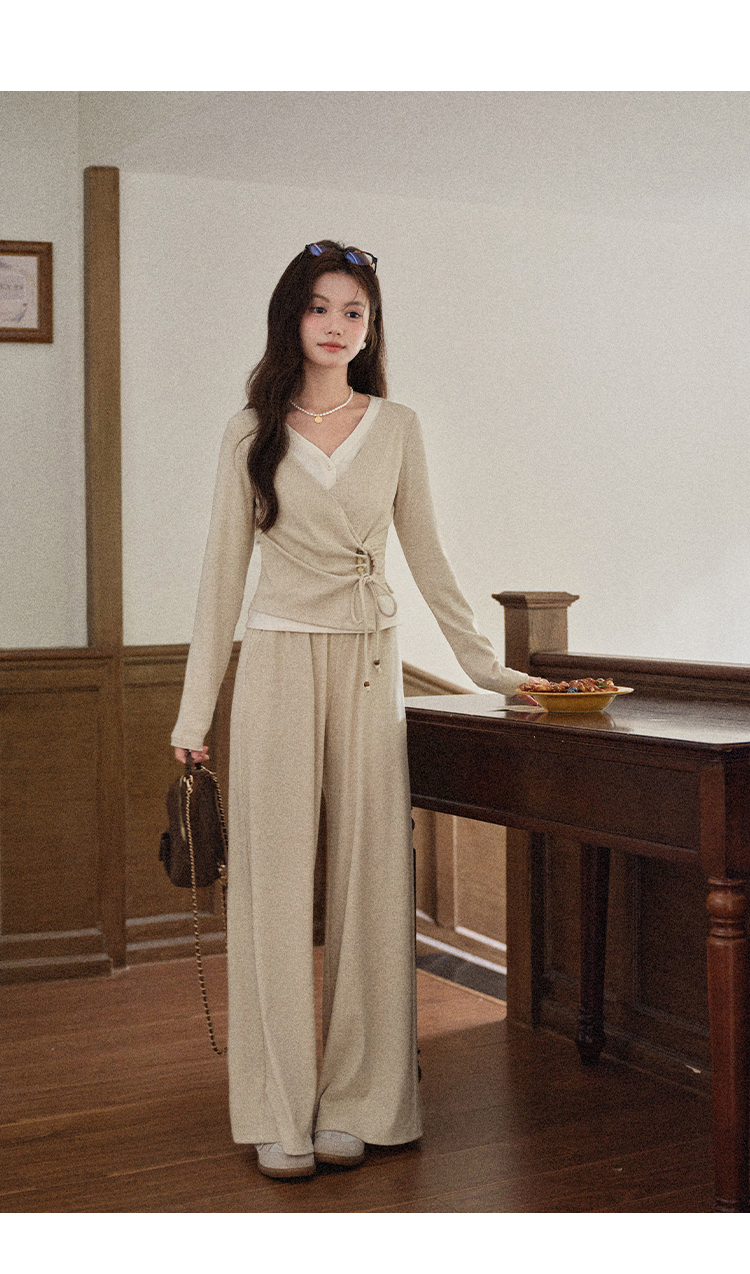 鹿向南「油画风铃」假两件设计感燕麦色长袖T恤女秋收腰显瘦上衣