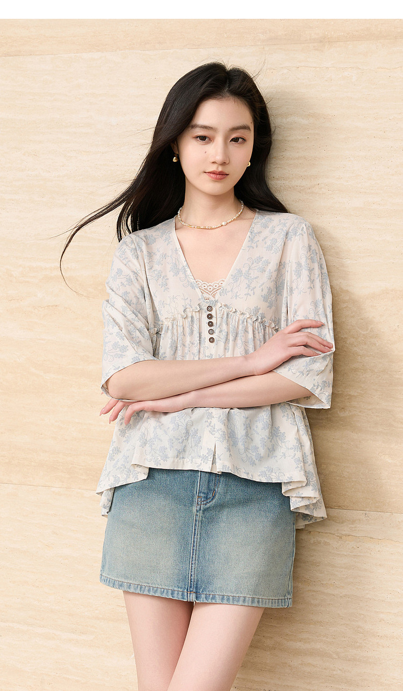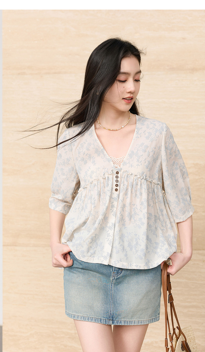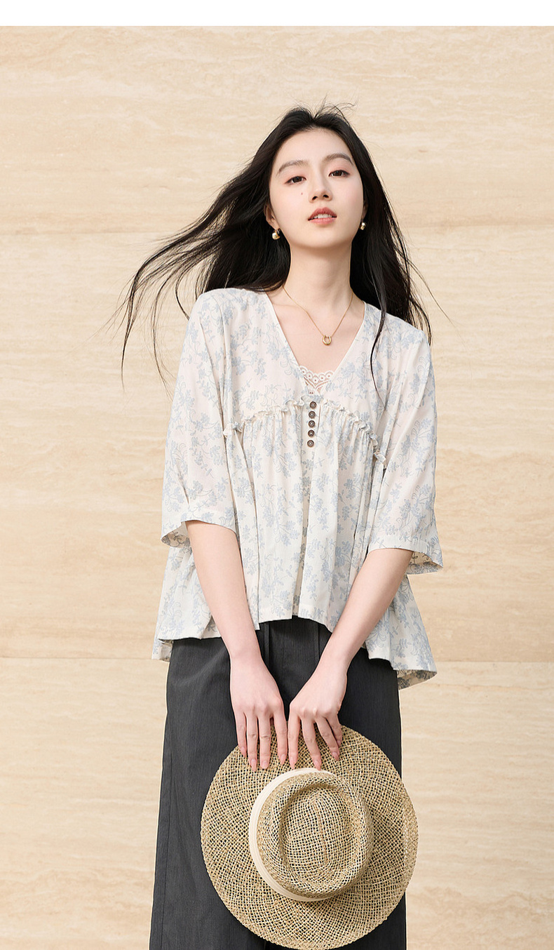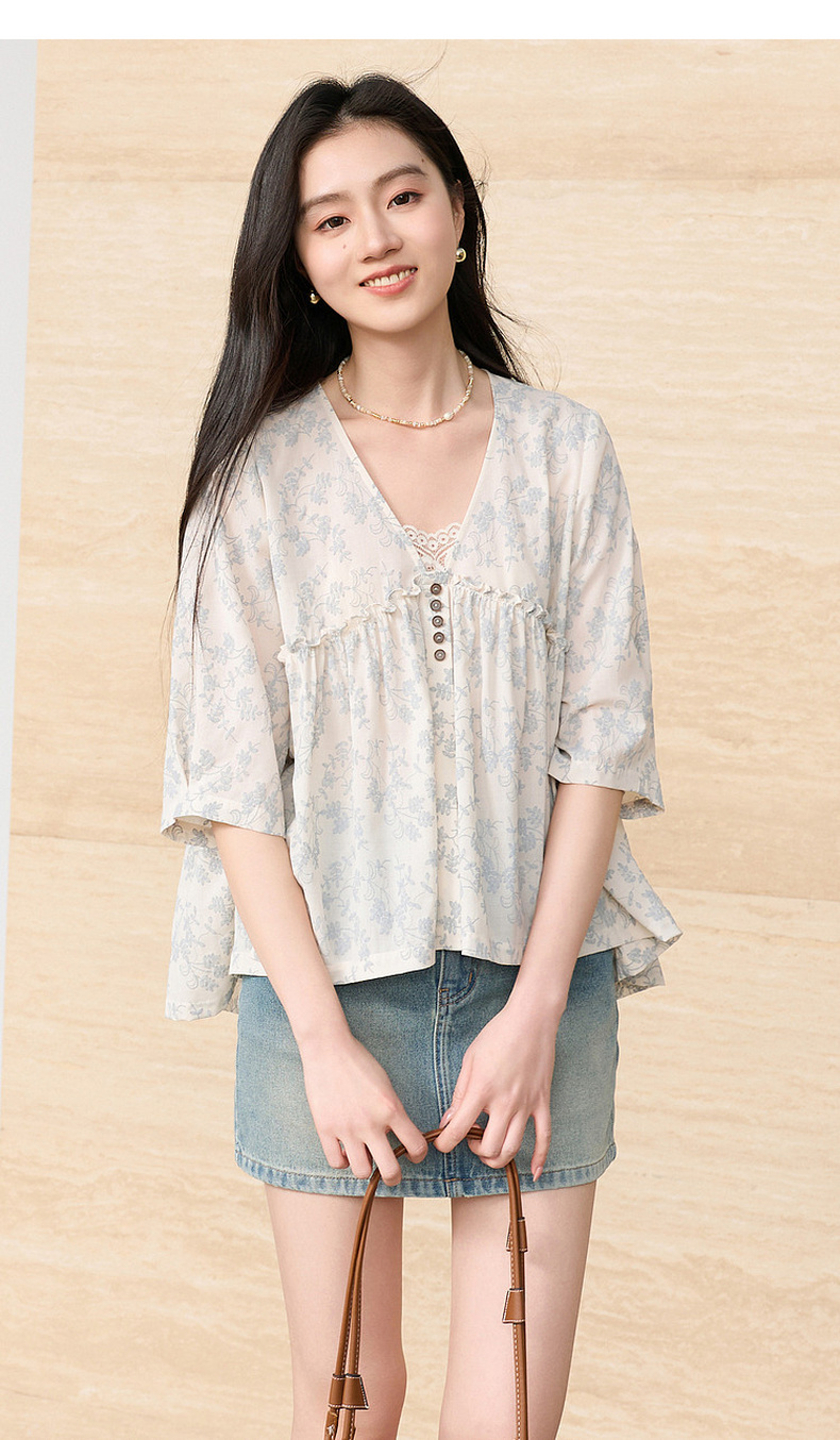 三彩2026春季新款V领七分袖衬衣宽松套头娃娃衫碎花清新上衣S