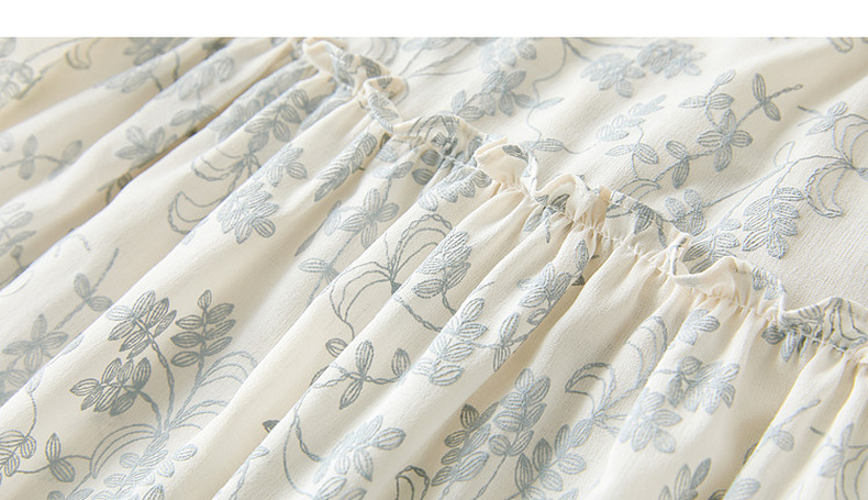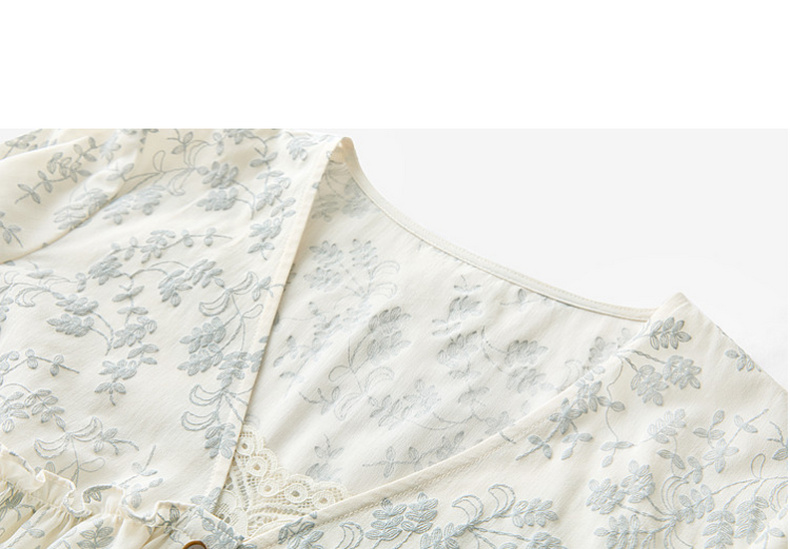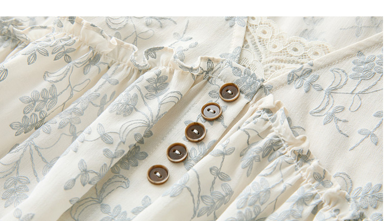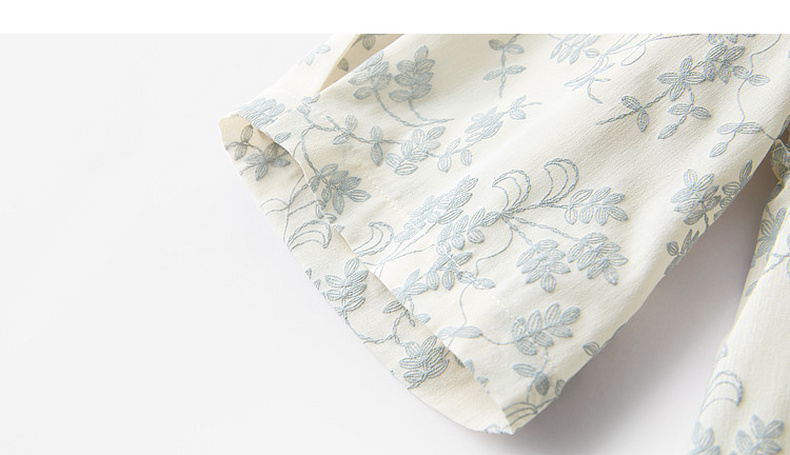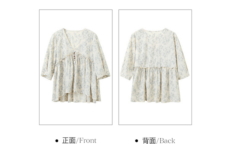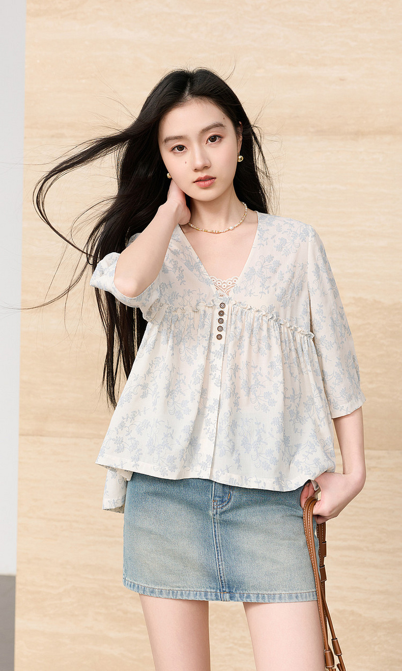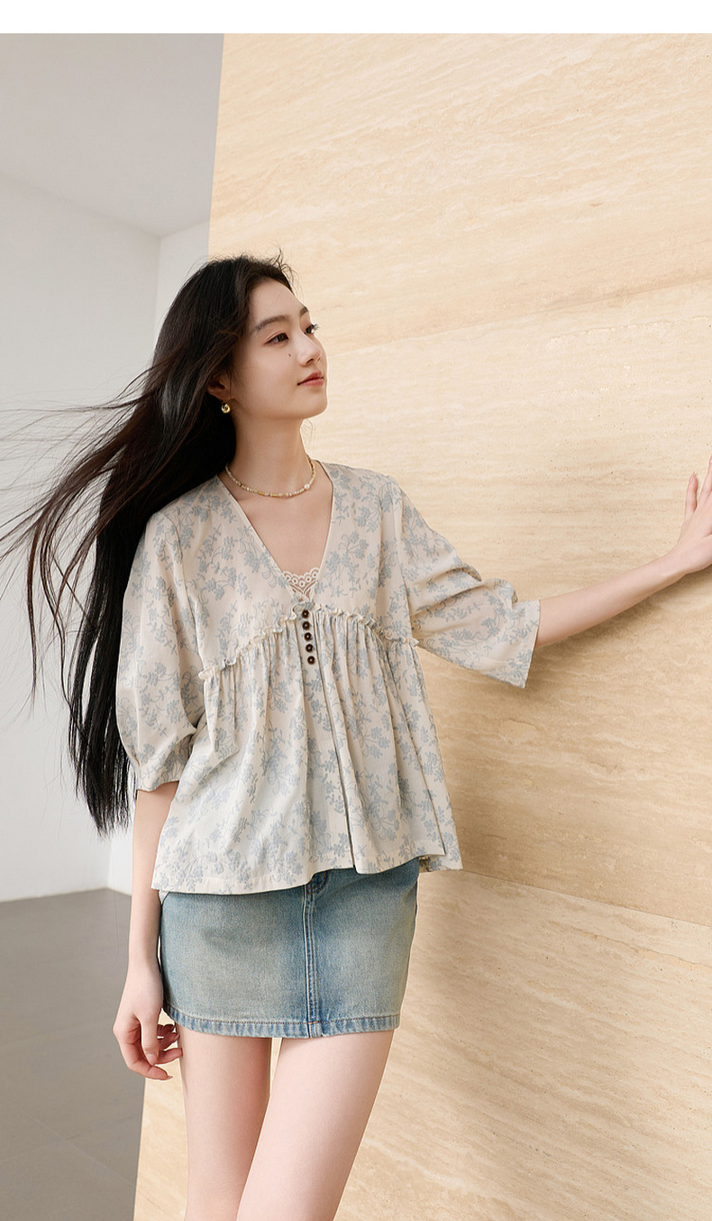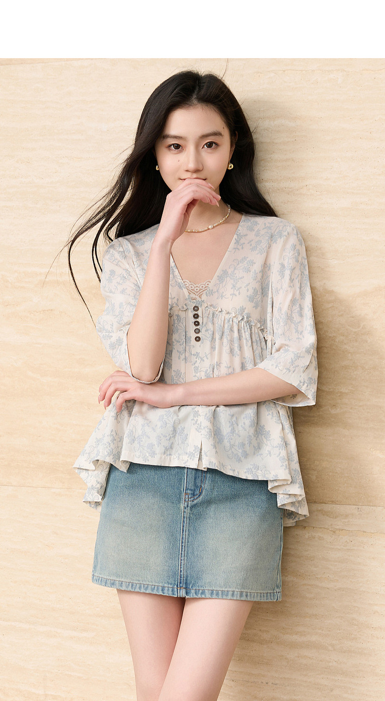 三彩2026春季新款V领七分袖衬衣宽松套头娃娃衫碎花清新上衣S