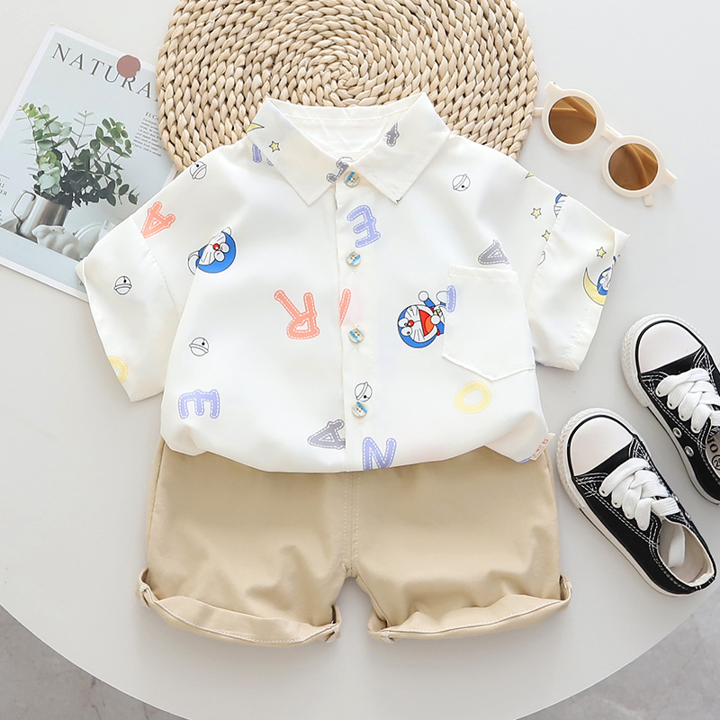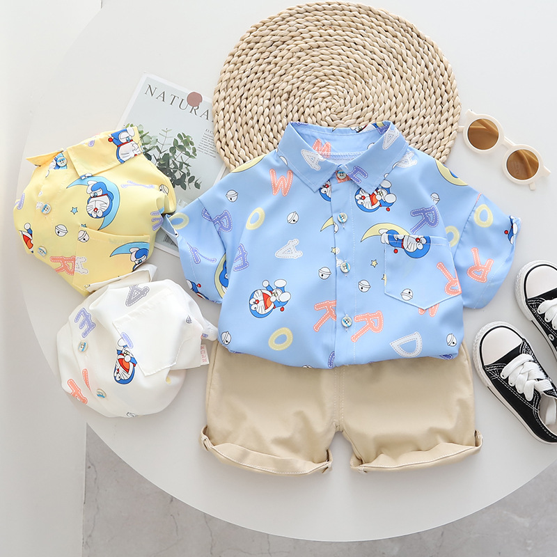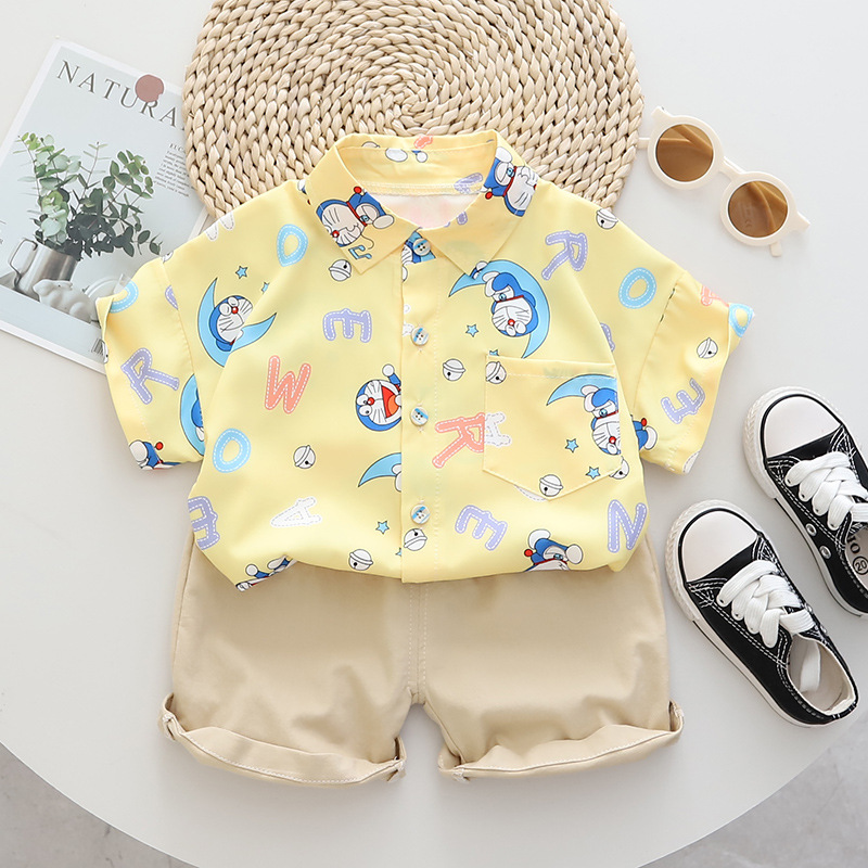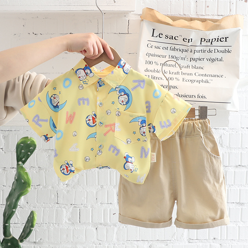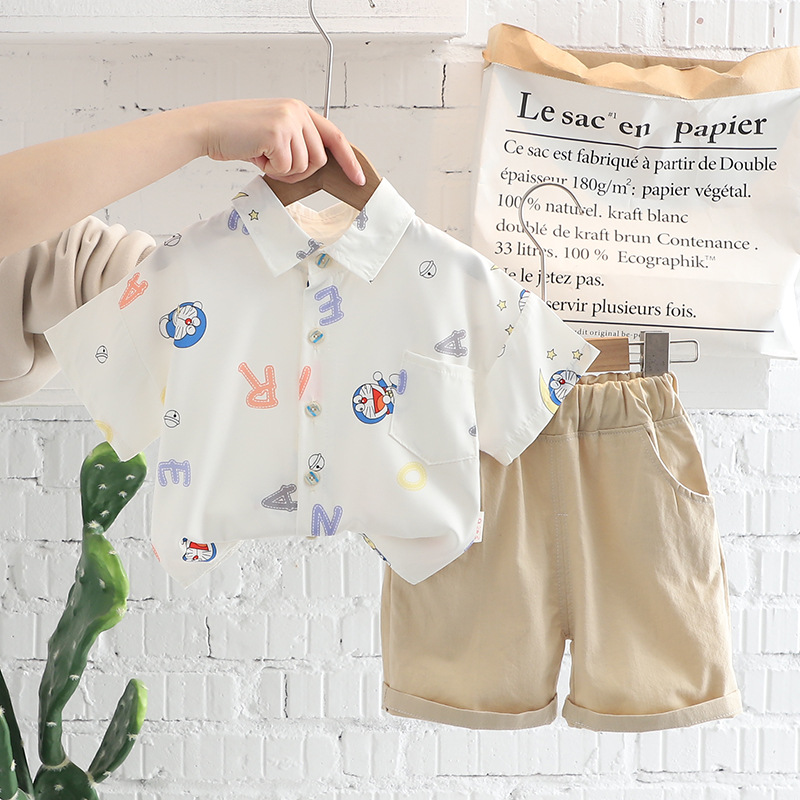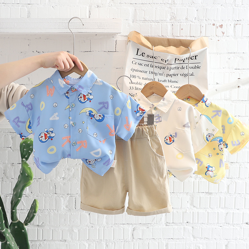 夏季新款叮当猫印花衬衫休闲中裤百搭潮流儿童两件套童装