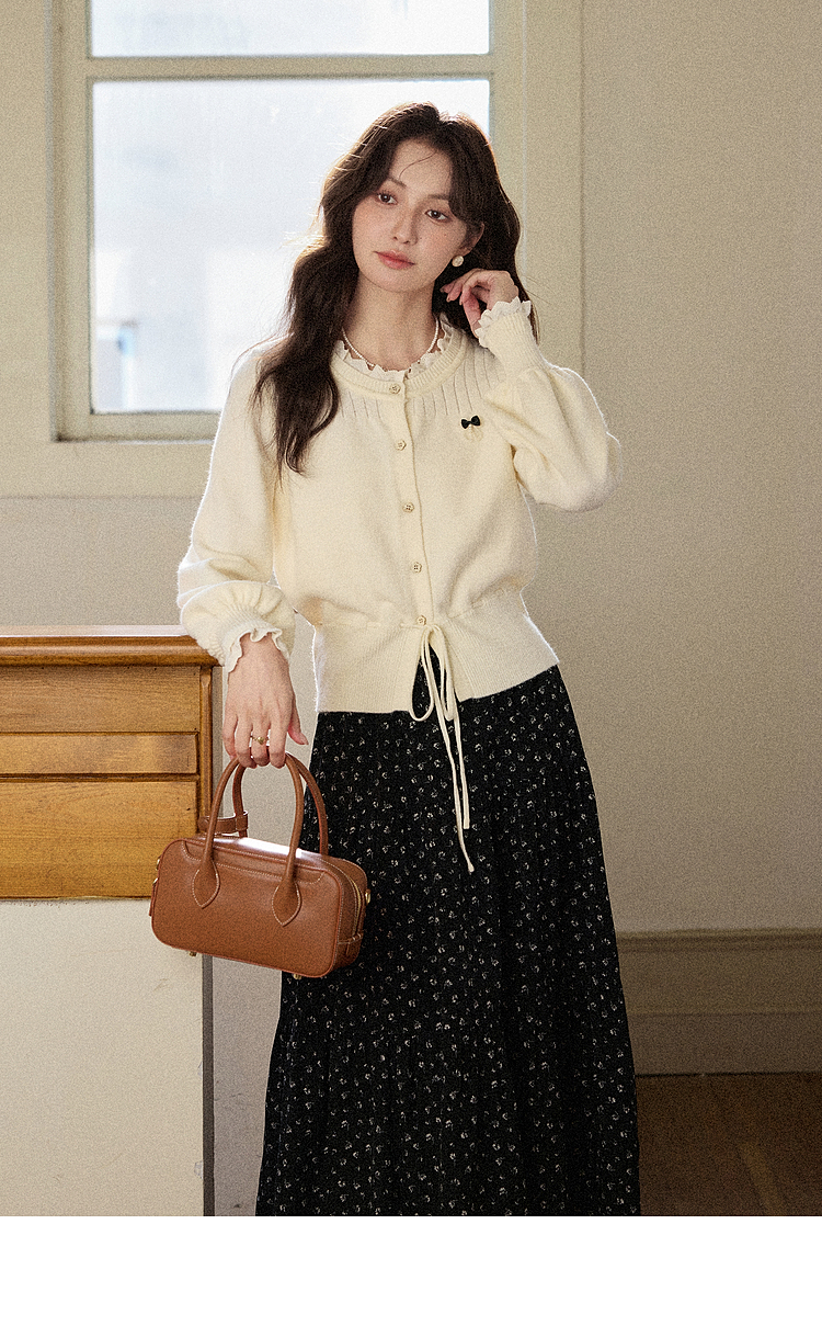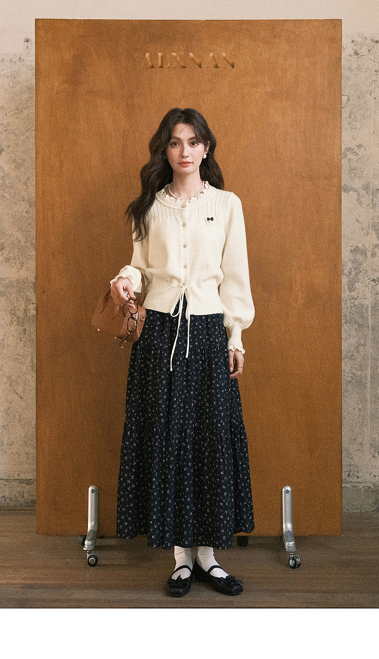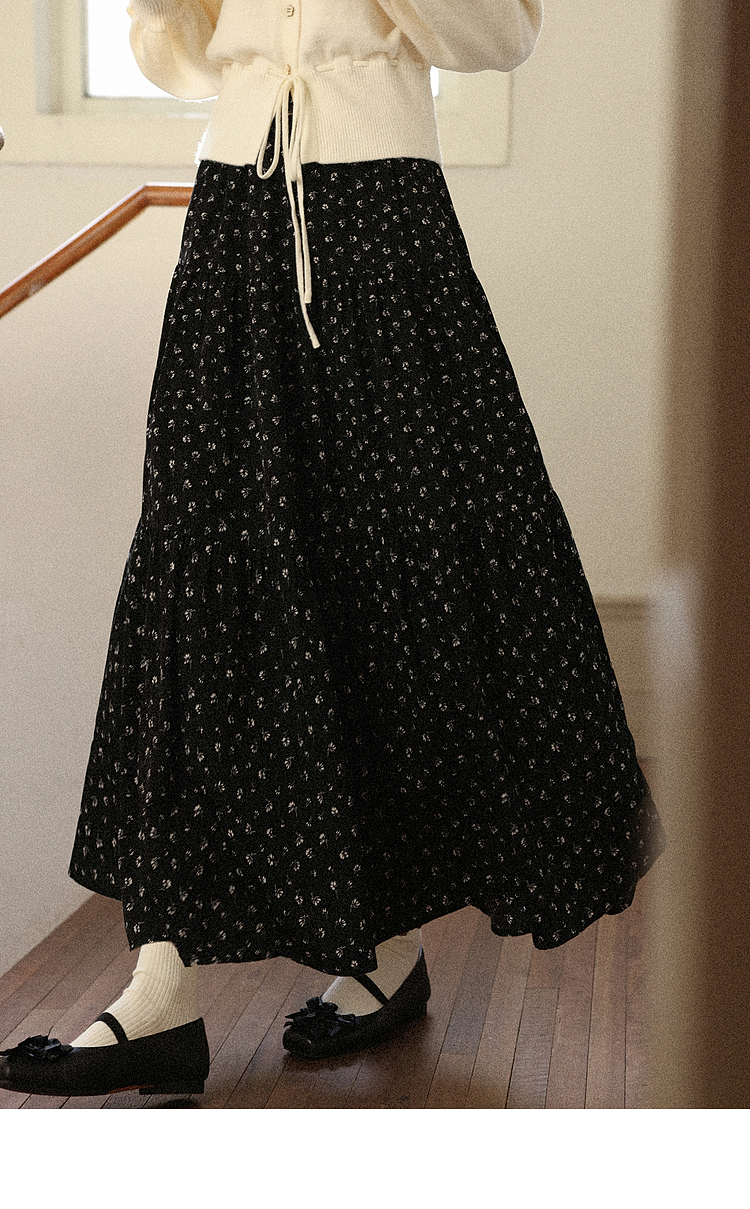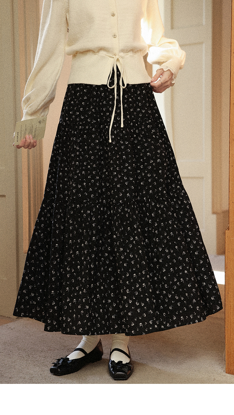 鹿向南「馥郁晚香」黑色高腰碎花半身裙女初秋A字百褶裙显瘦长裙