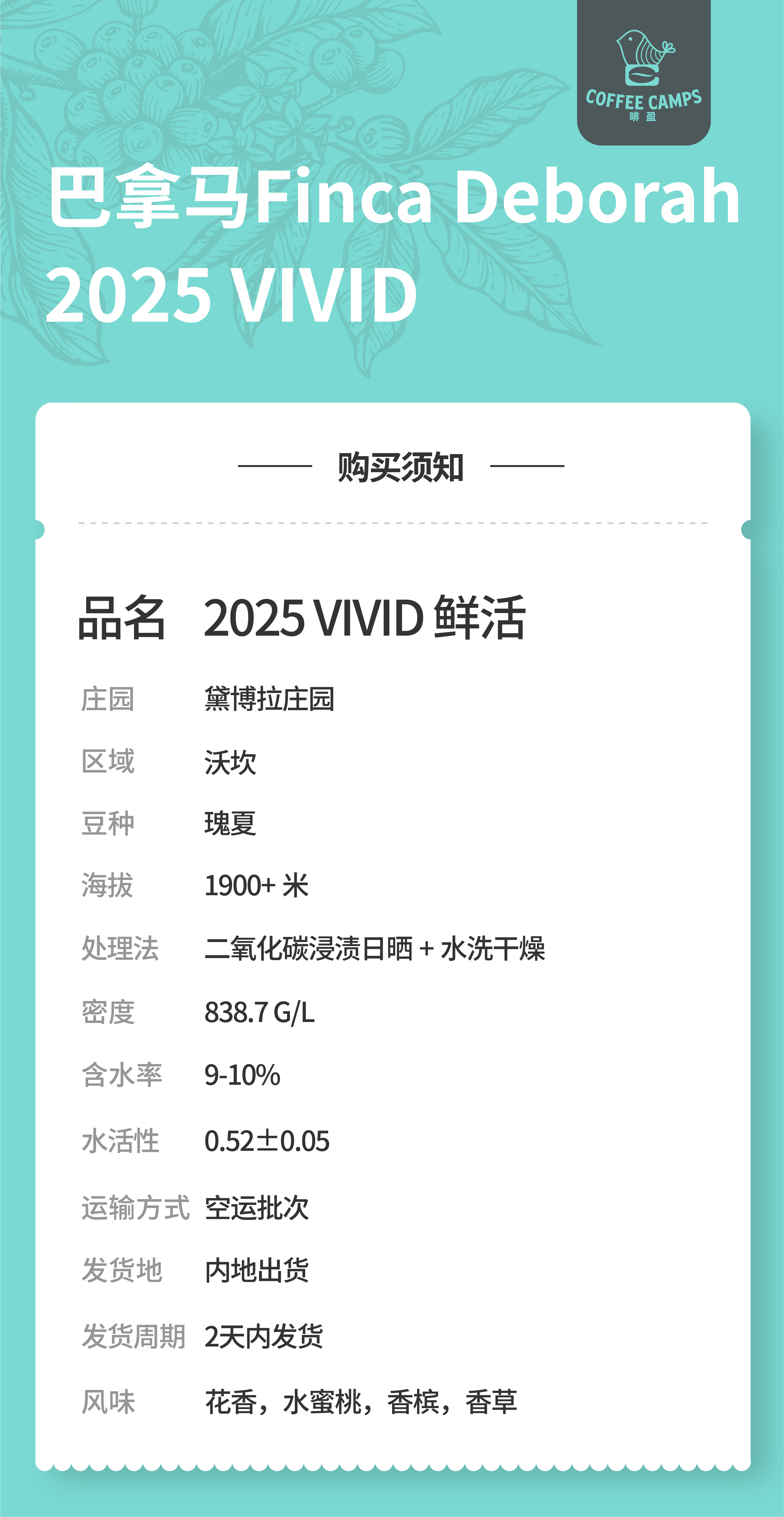 25产季 巴拿马 黛博拉 Finca Deborah 鲜活 VIVID 瑰夏 二氧化碳浸渍日晒 + 水洗干燥(生豆)空运批次