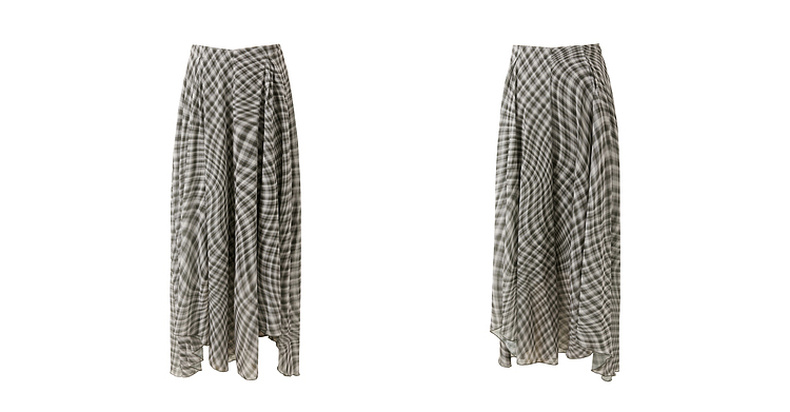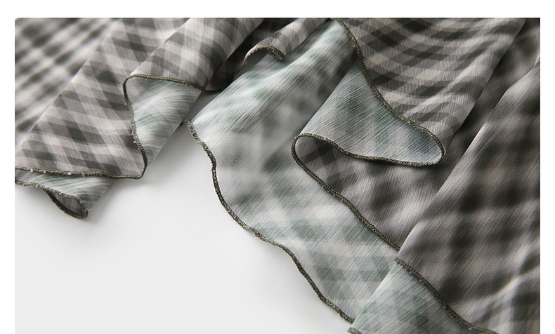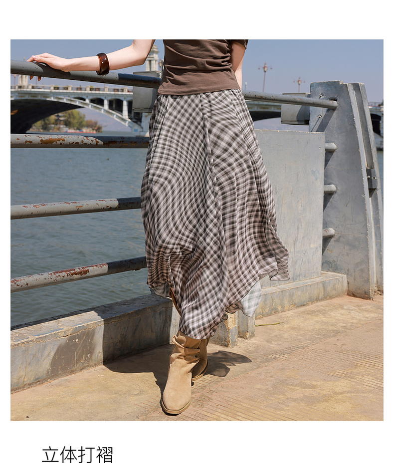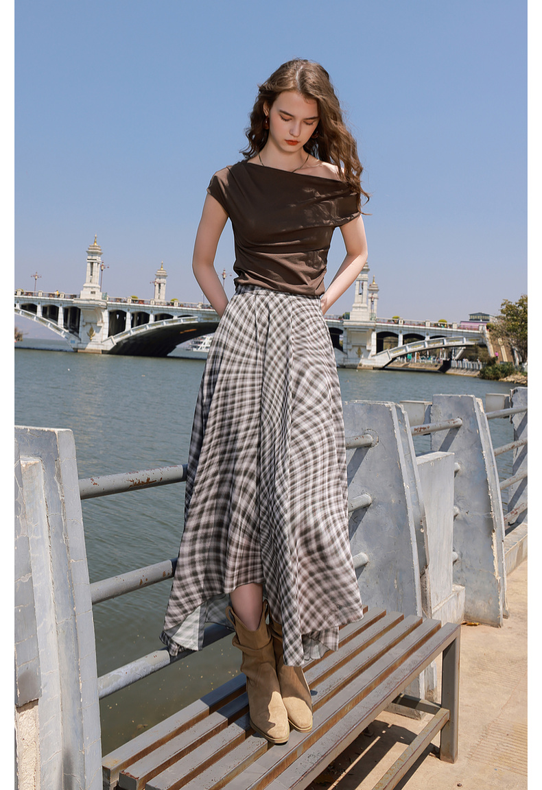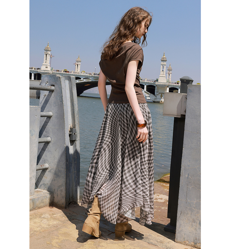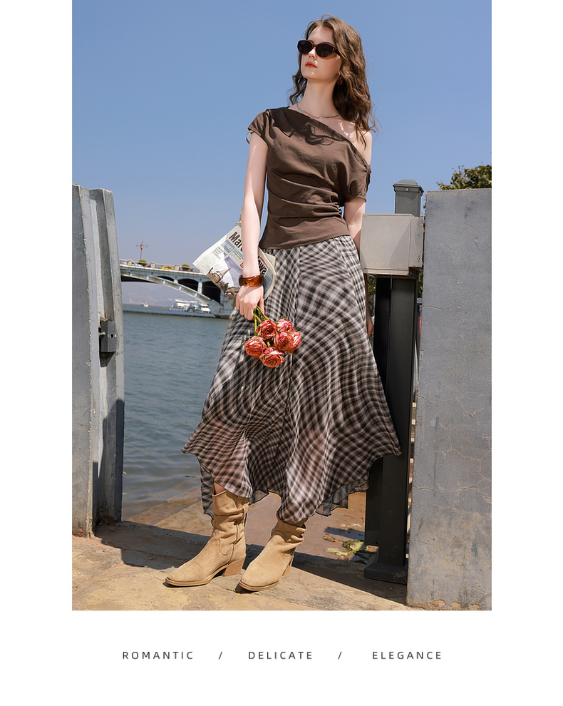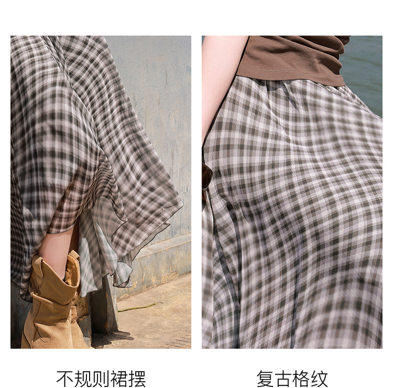 三彩2025夏季新款格纹半身裙飘逸不规则A字裙长裙设计感M