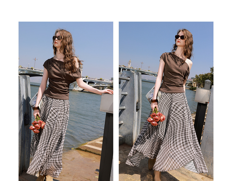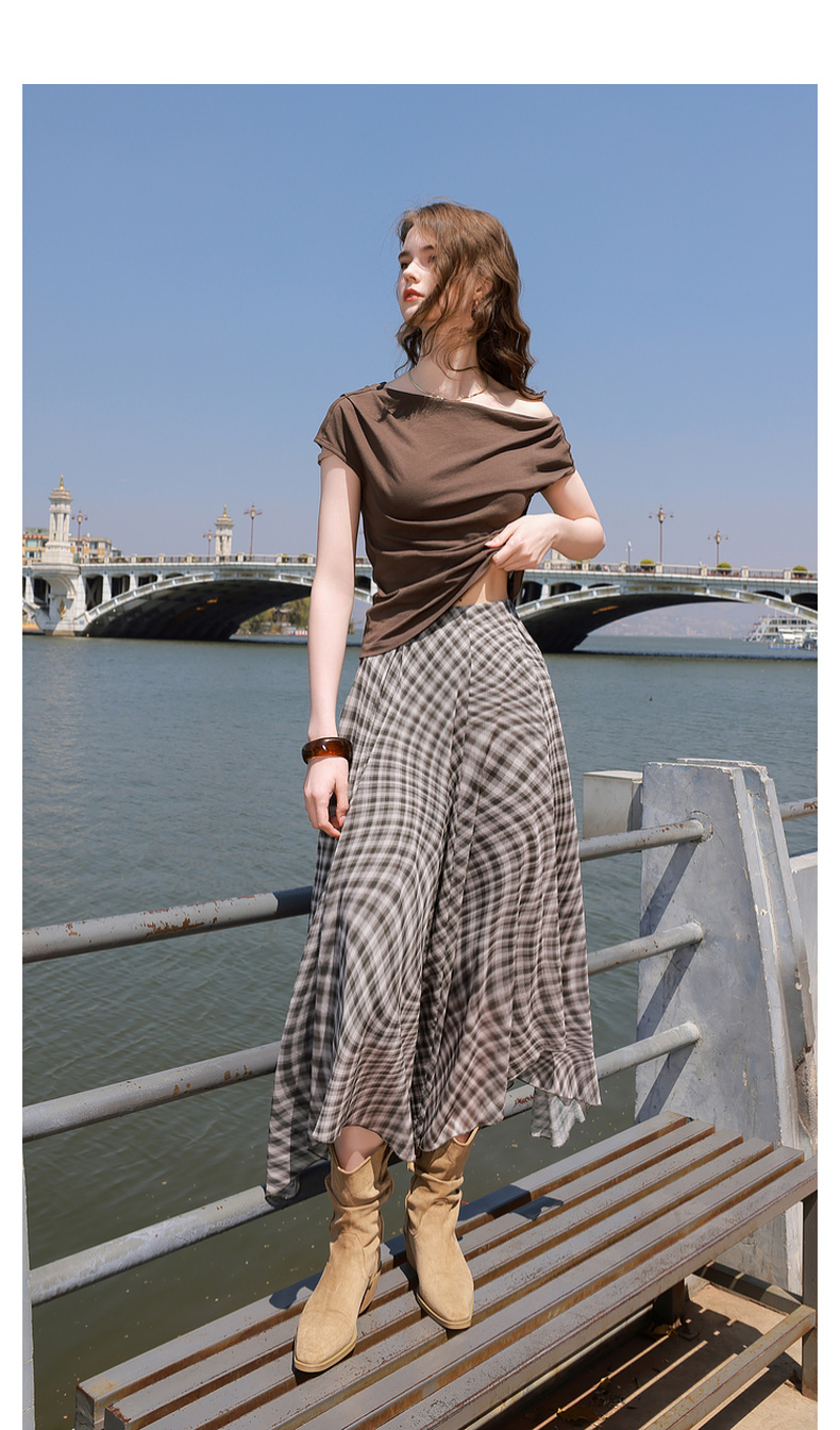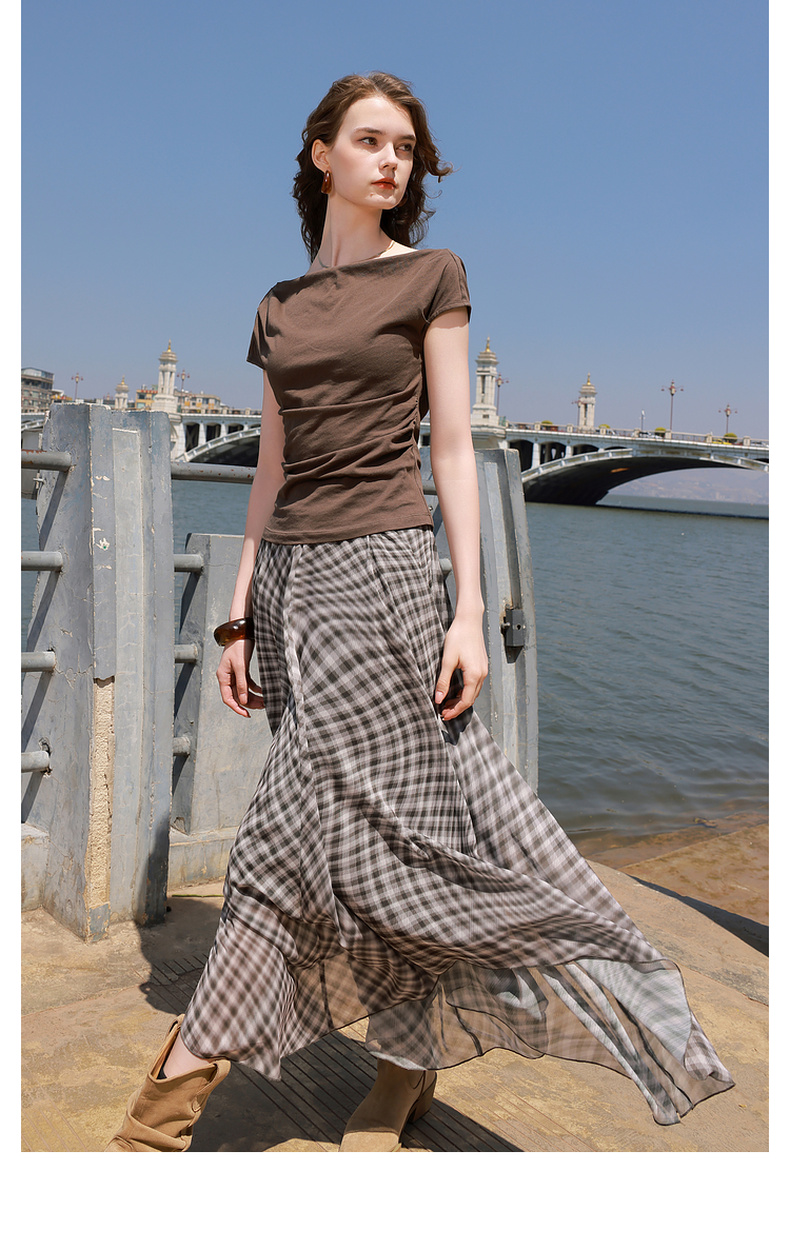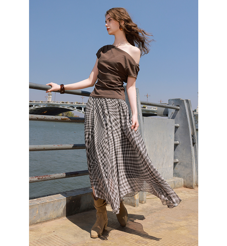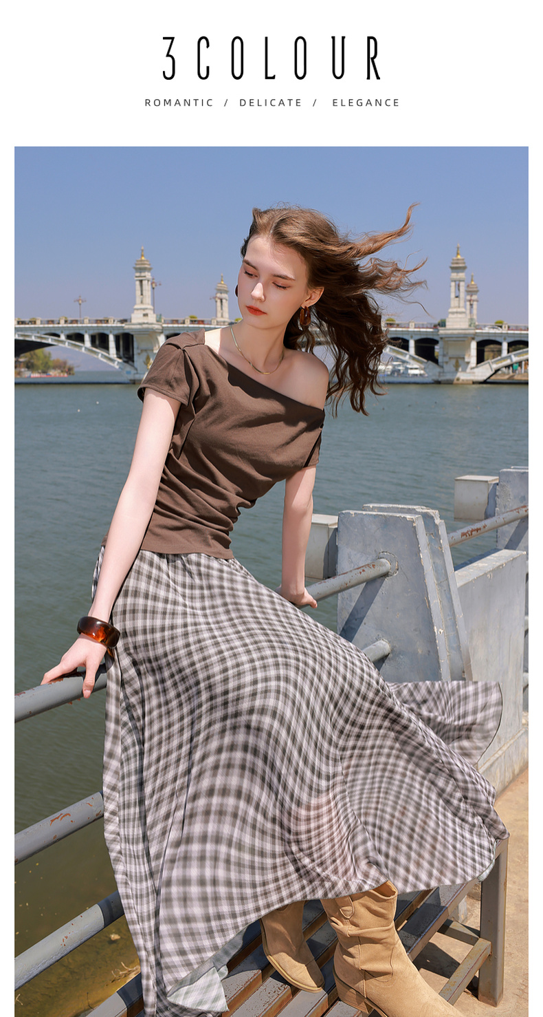 三彩2025夏季新款格纹半身裙飘逸不规则A字裙长裙设计感M