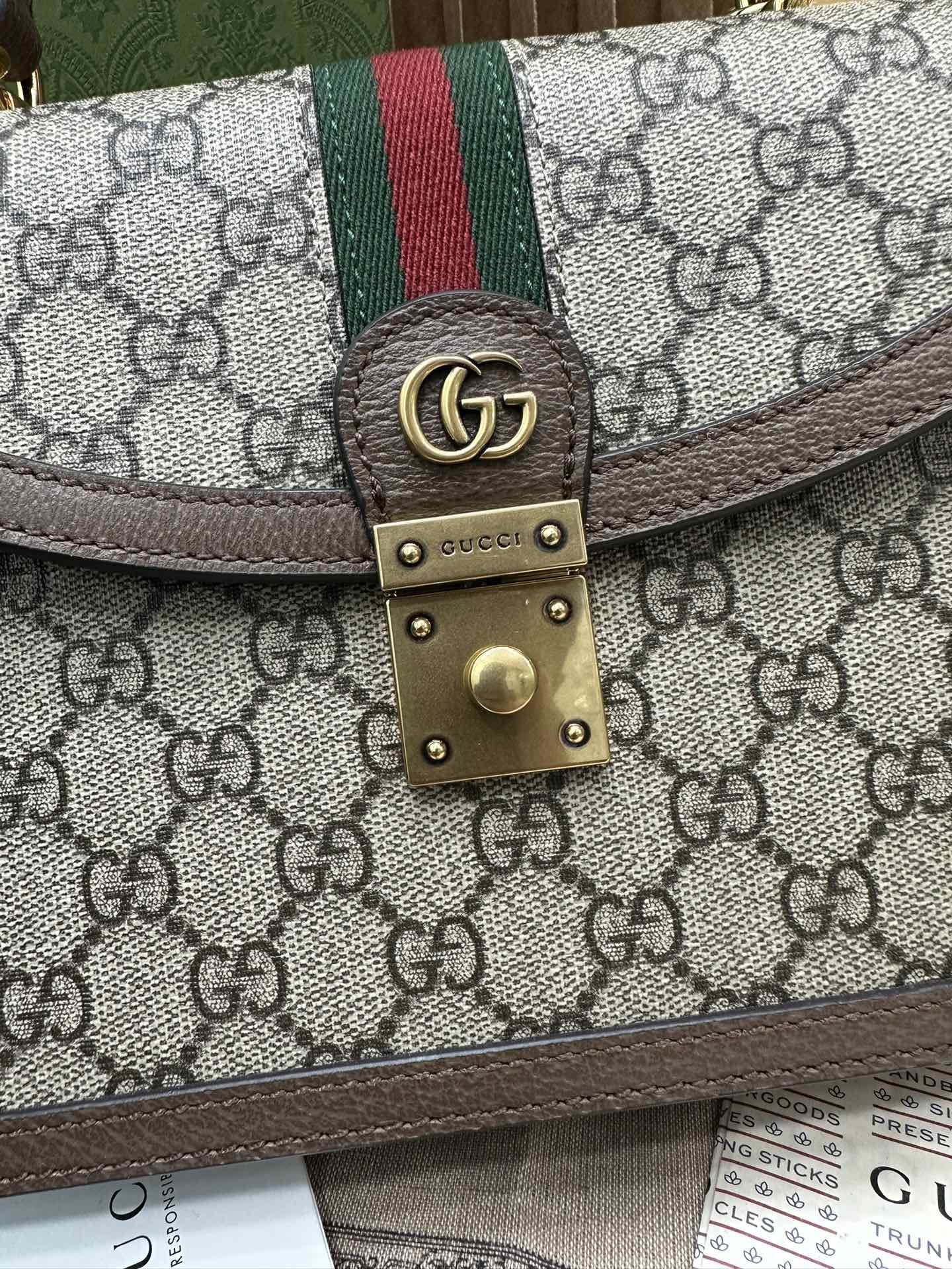 古驰 Ophidia 闪亮金色调配件品牌经典织带 帆布拼皮革 单肩斜挎手提包 小号 女款(LZ)