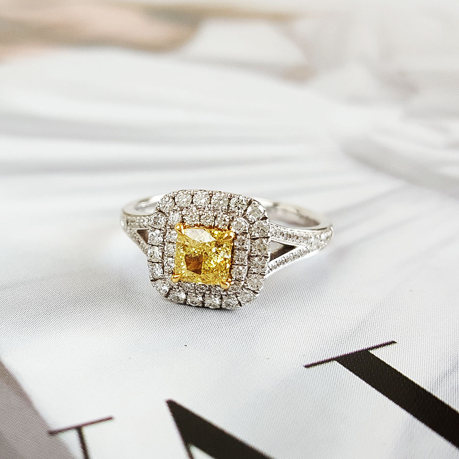 款式 | AU750白金百搭时尚设计师款垫型0.51克拉浓彩黄黄钻戒指 |