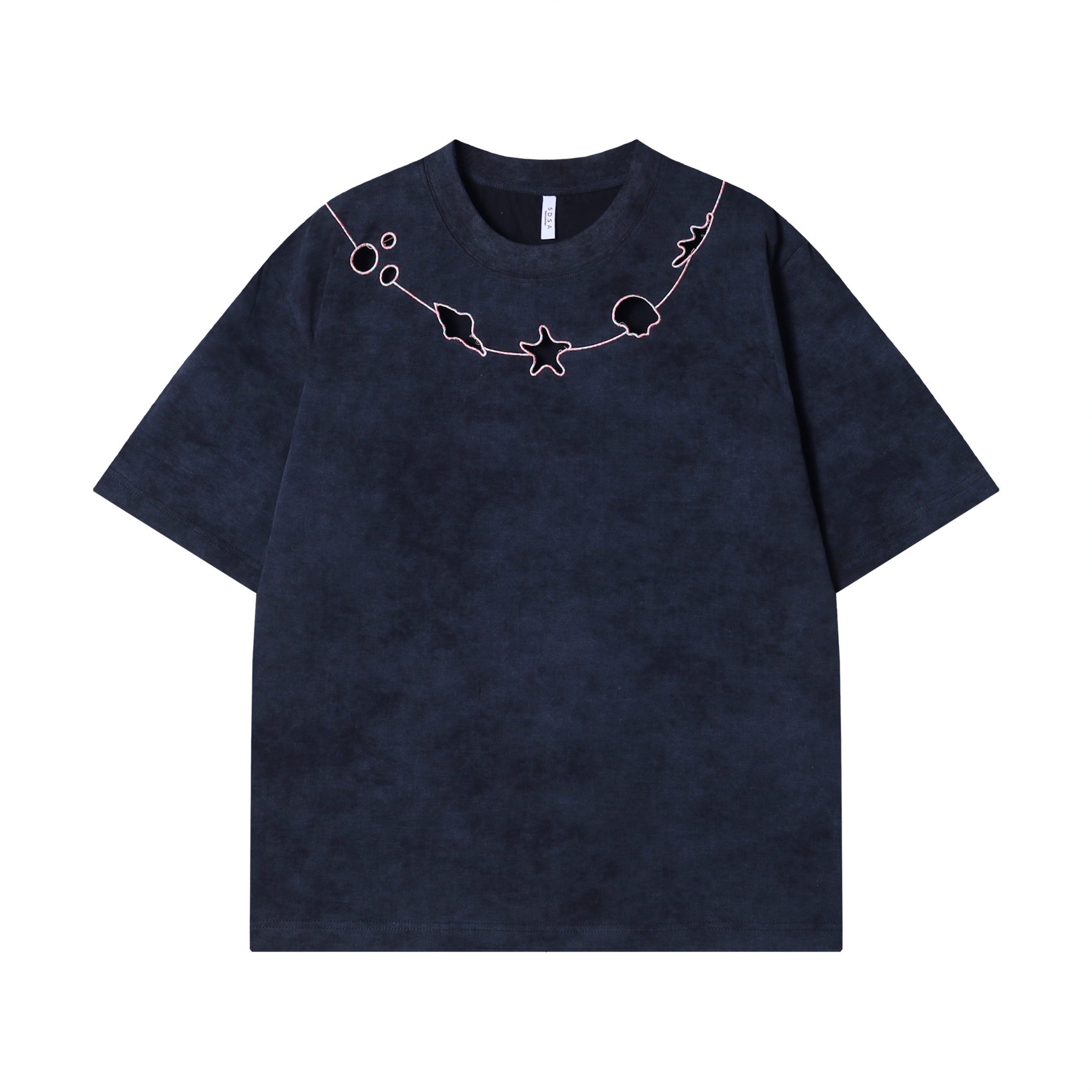 T2246春夏新款时尚个性扎染撞色刺绣镂空圆领短袖T恤百搭情侣套头上衣