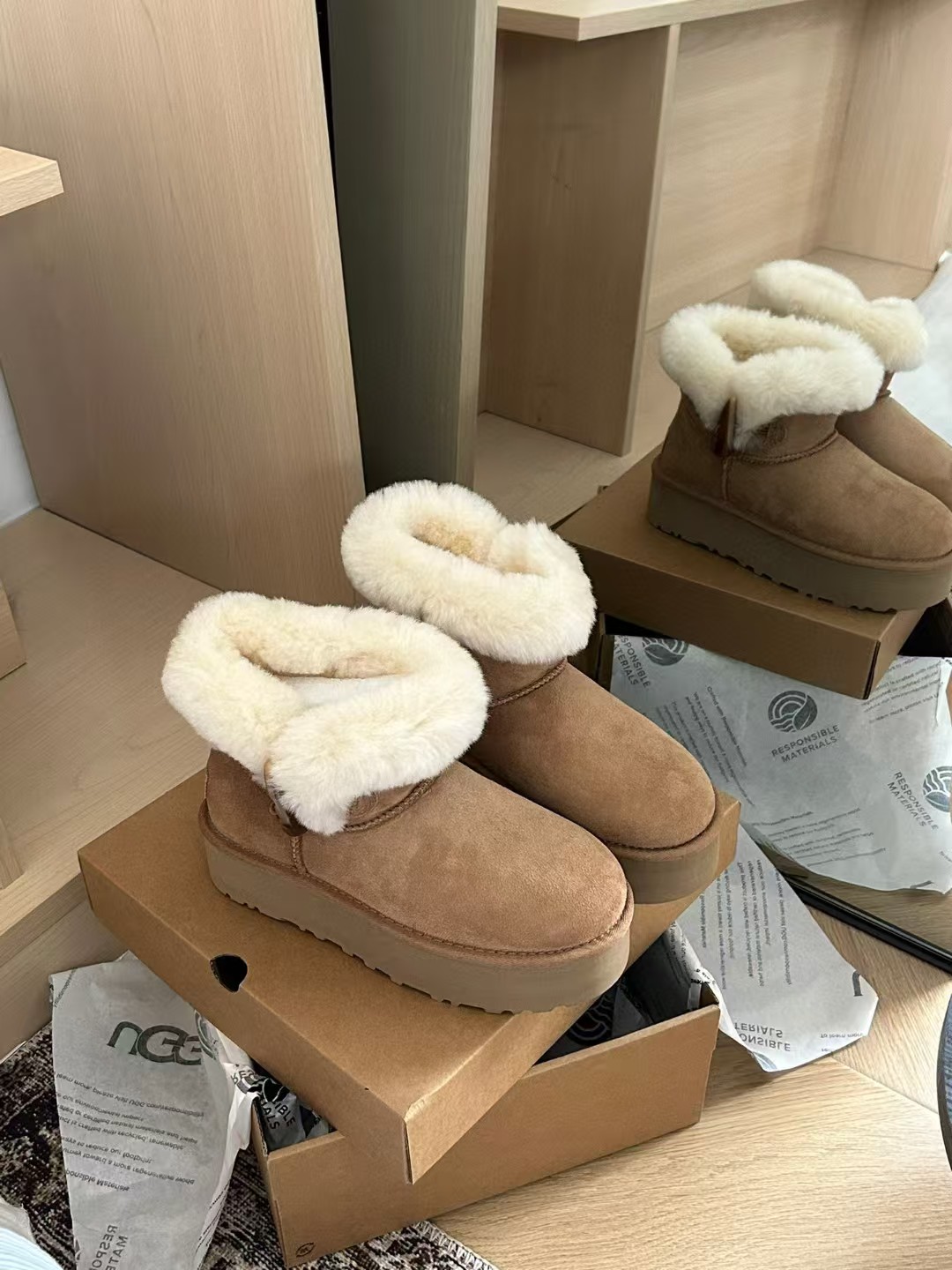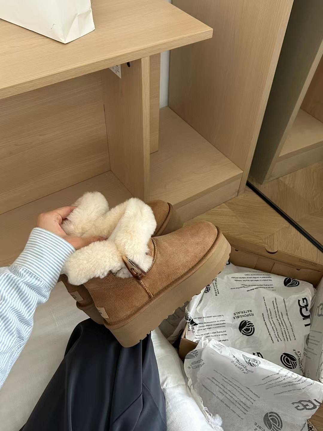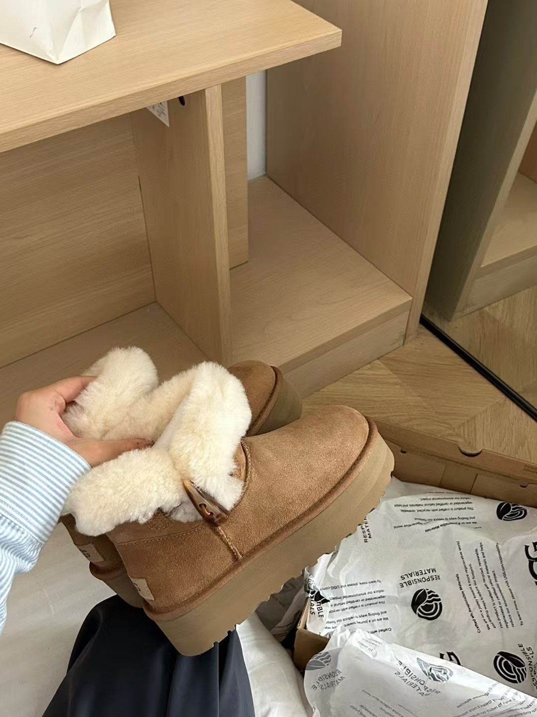 采用高品质a级隆丰皮毛一体。鞋口外翻毛口设计牛角扣搭配,时髦百搭!