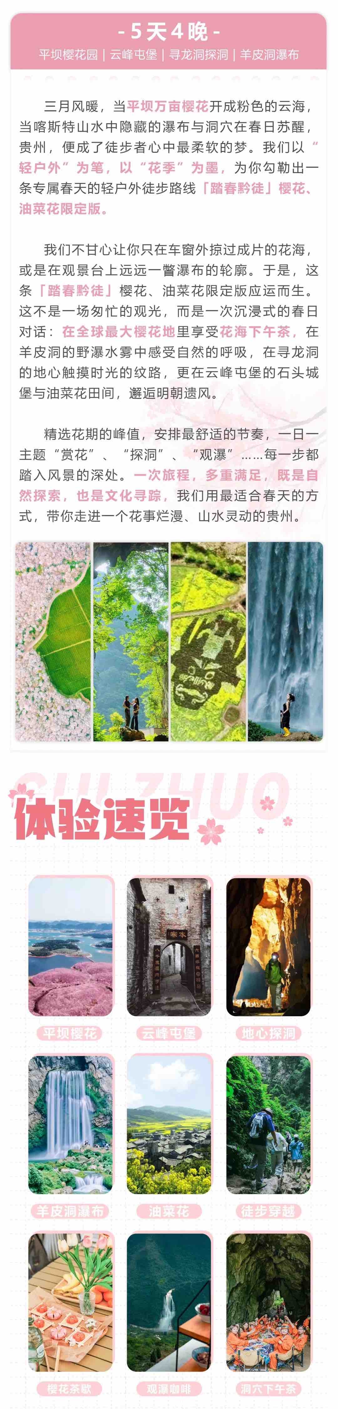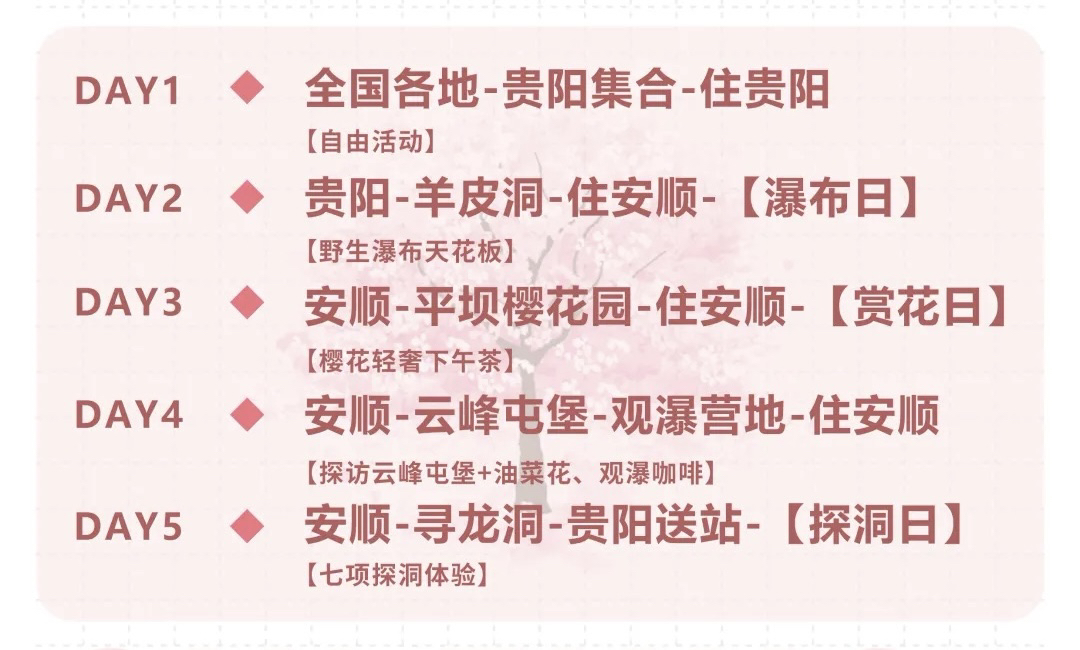 贵州|3.14-3.18春季限定一年一度赏樱花5天4晚,更多排期:3.21-3.25,3.28-4.1,樱花下午茶、云峰屯堡、寻龙洞、羊皮洞,踏春黔徒精致小团