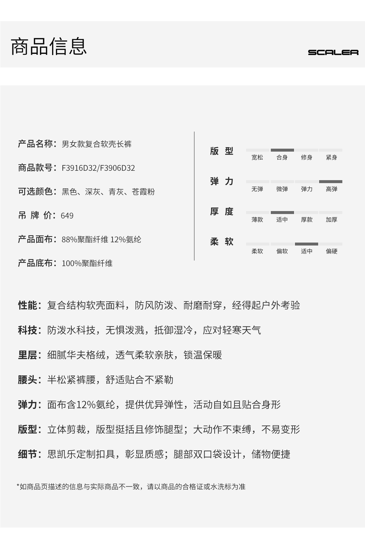 【男女款软壳裤】SCALER/思凯乐 复合软壳长裤防泼水防风透气亲肤裤子 F3916D32/F3906D32