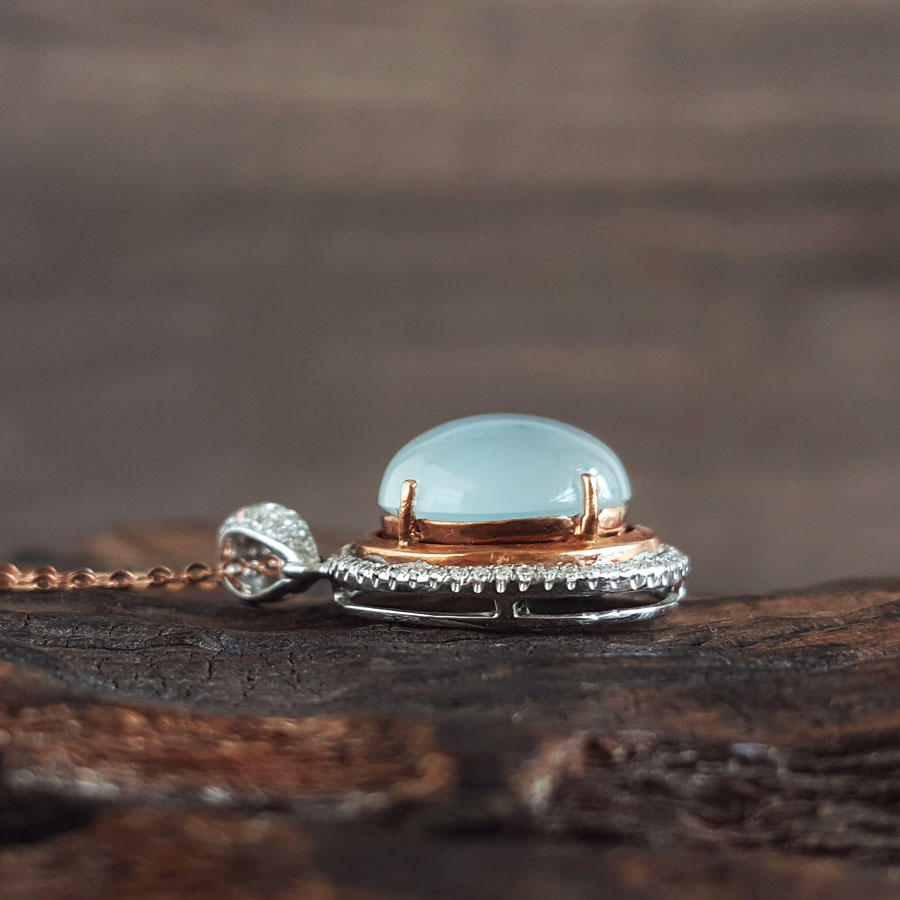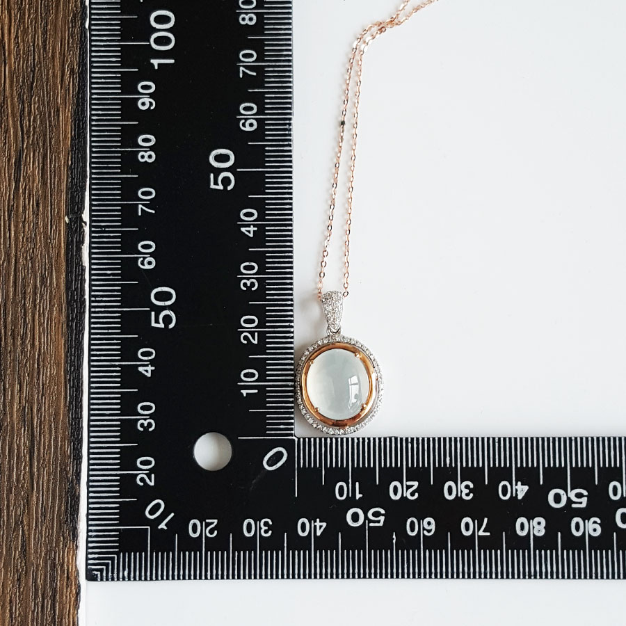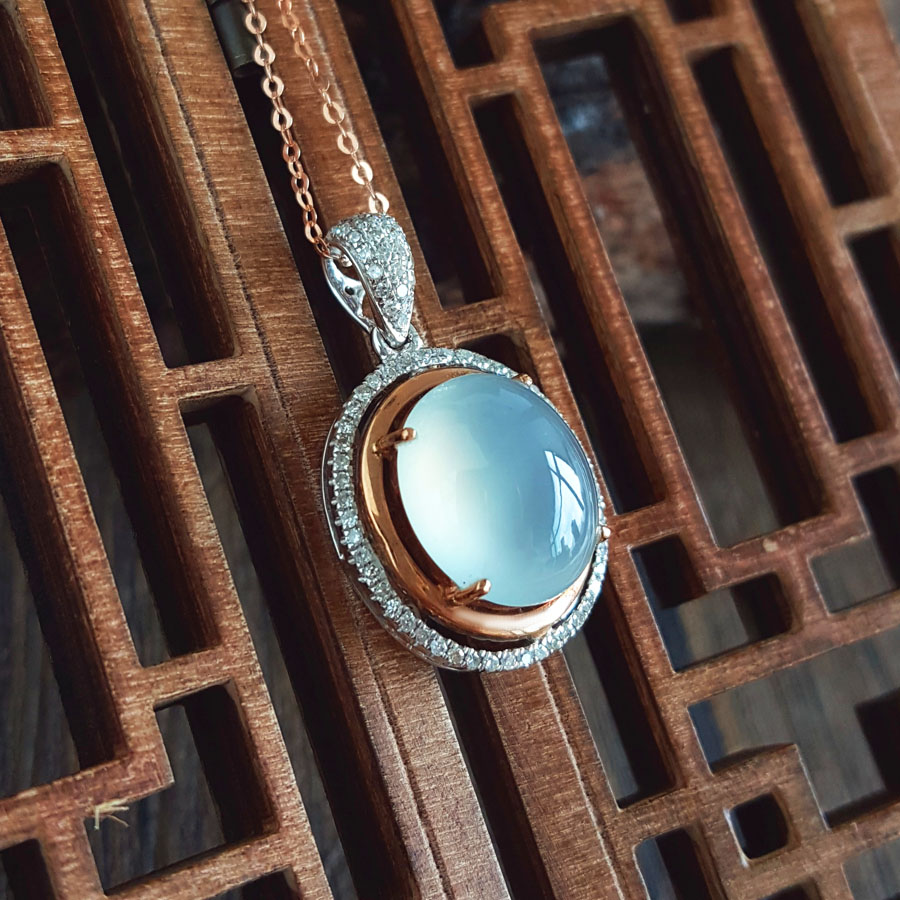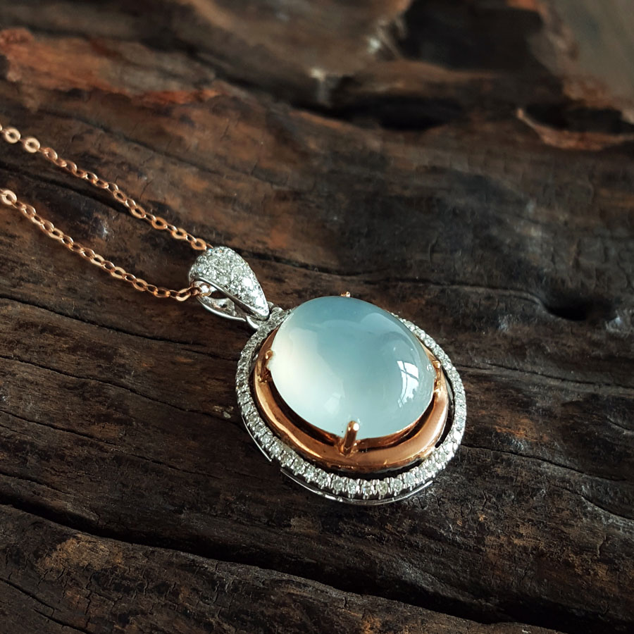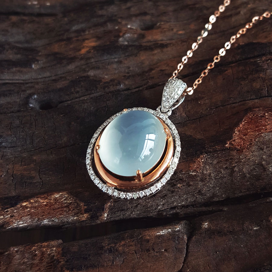 名称 | AU750双色金镶钻镶天然细腻高冰种蛋面翡翠吊坠项链 |