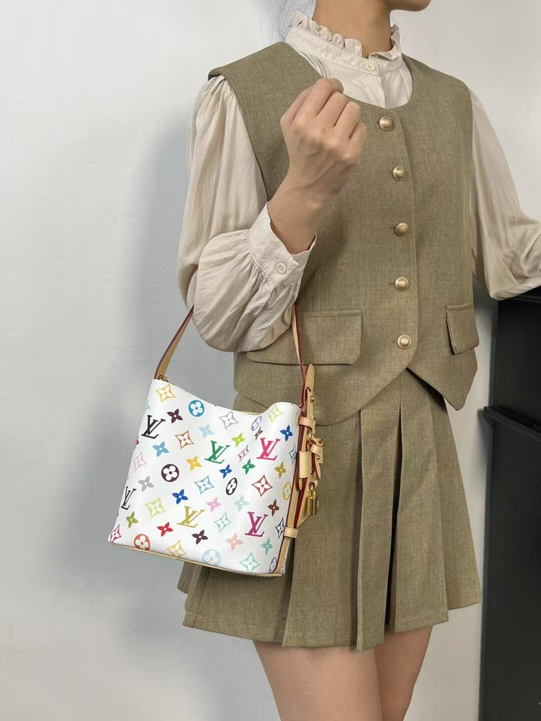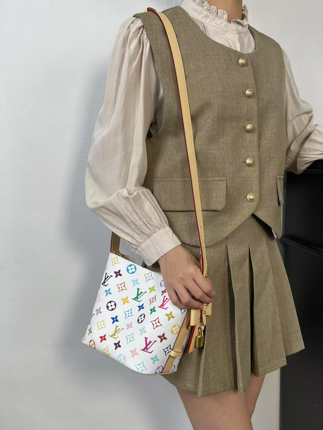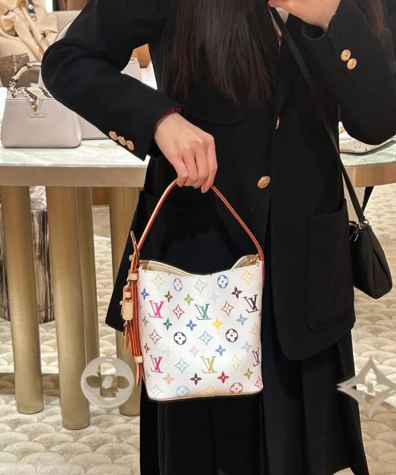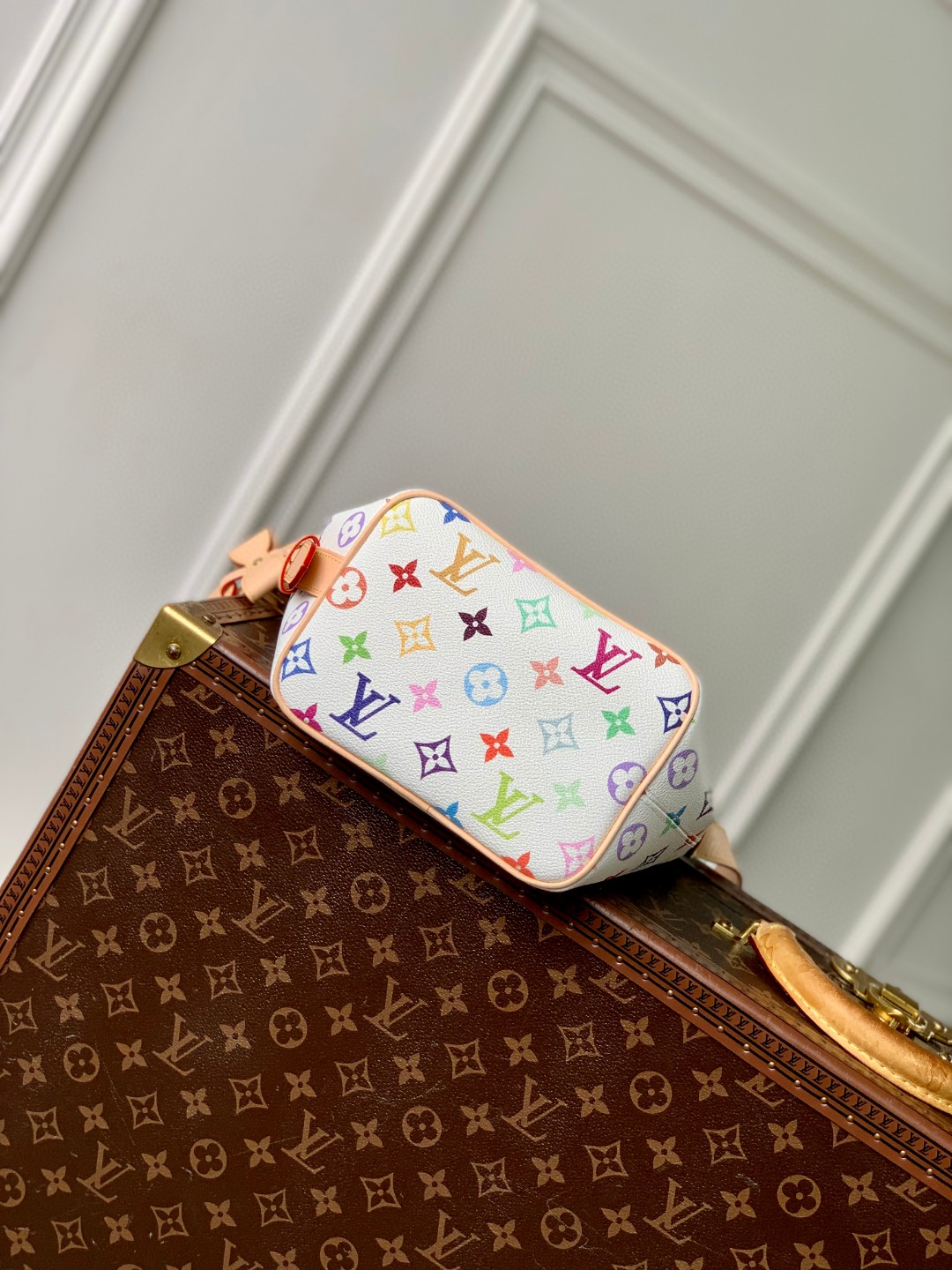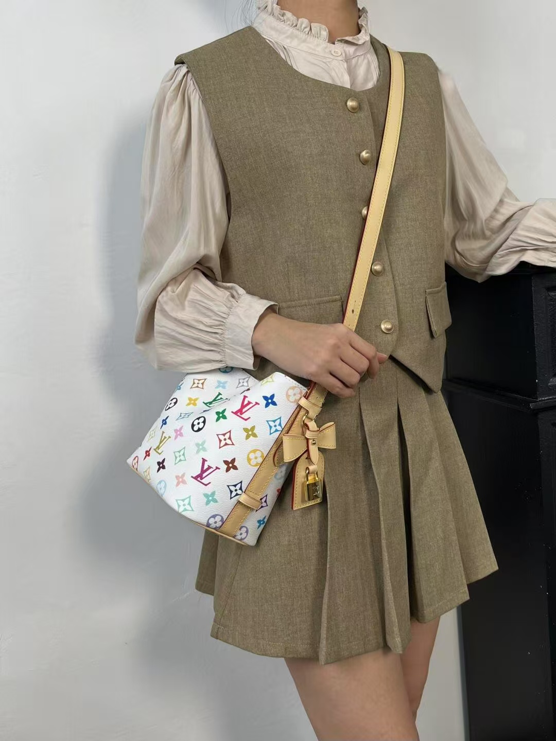 本款 All In BB 手袋以灵动细节传递路易威登 x 村上隆再版系列的玩趣格调。Monogram 涂层帆布呈现艺术家笔下斑斓的彩虹色调,名牌融入蝴蝶结和挂锁装饰。巧用可调节牛皮革手柄和皮革肩带,手提、肩背和斜挎随心而换。