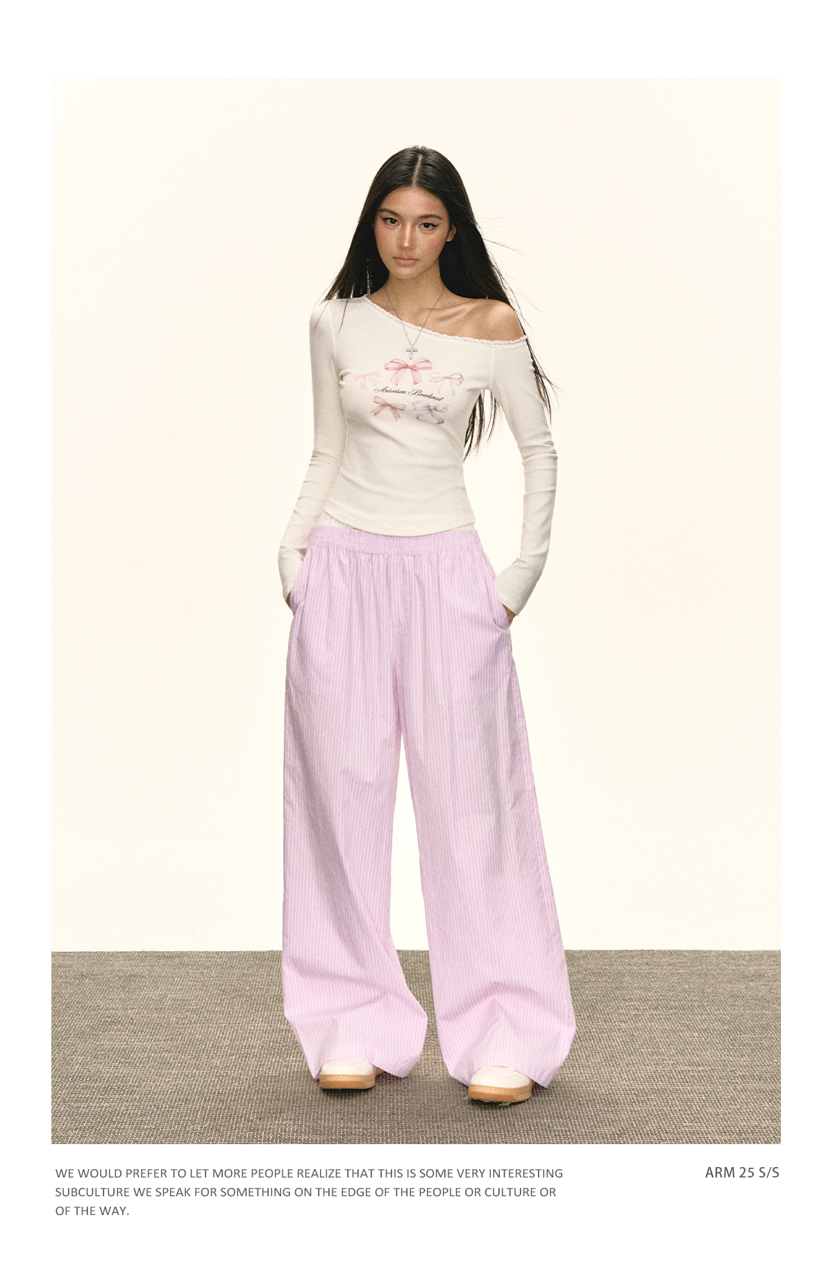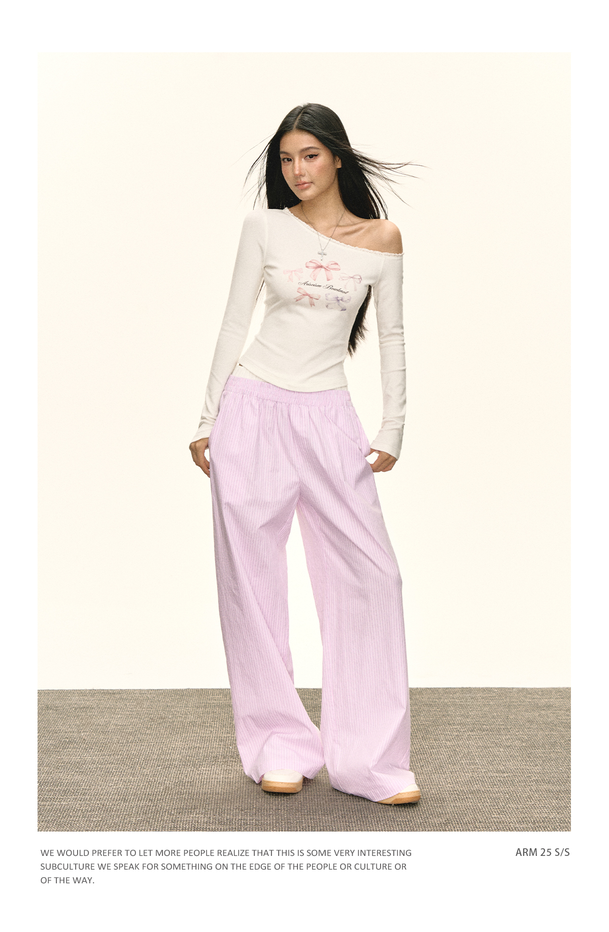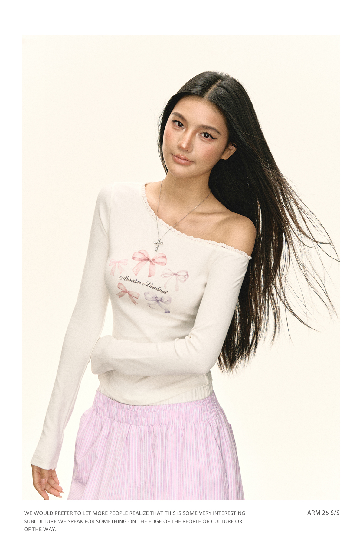 Ariseism 美式复古斜肩蝴蝶结印花长袖T恤女秋季新款修身上衣