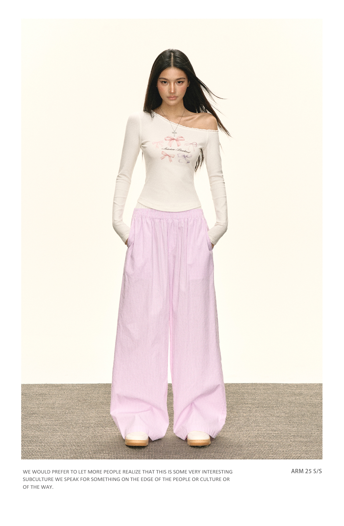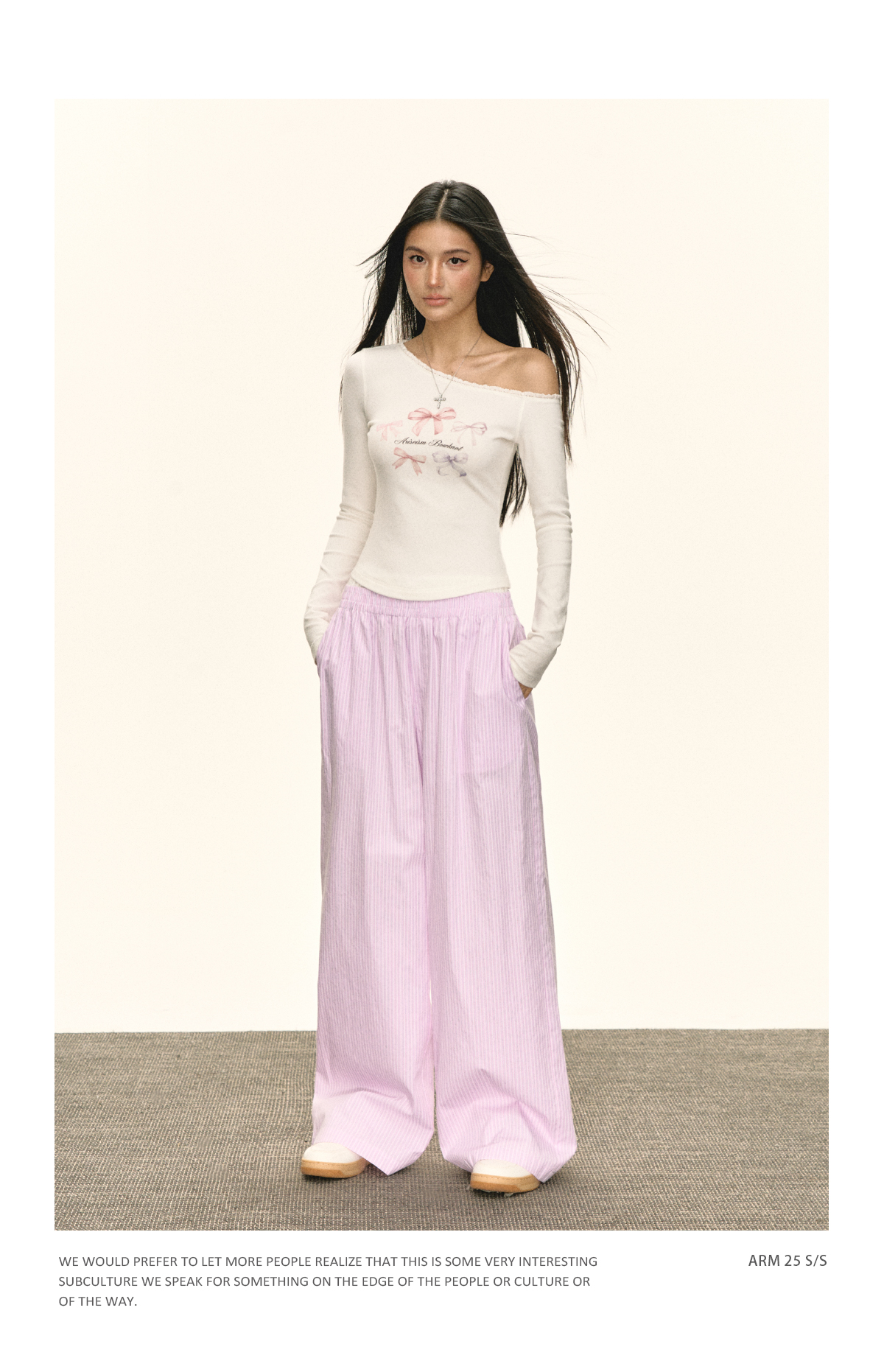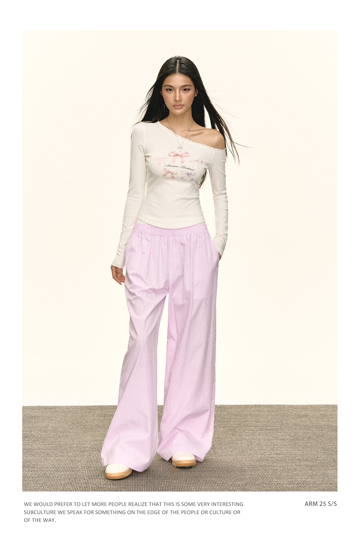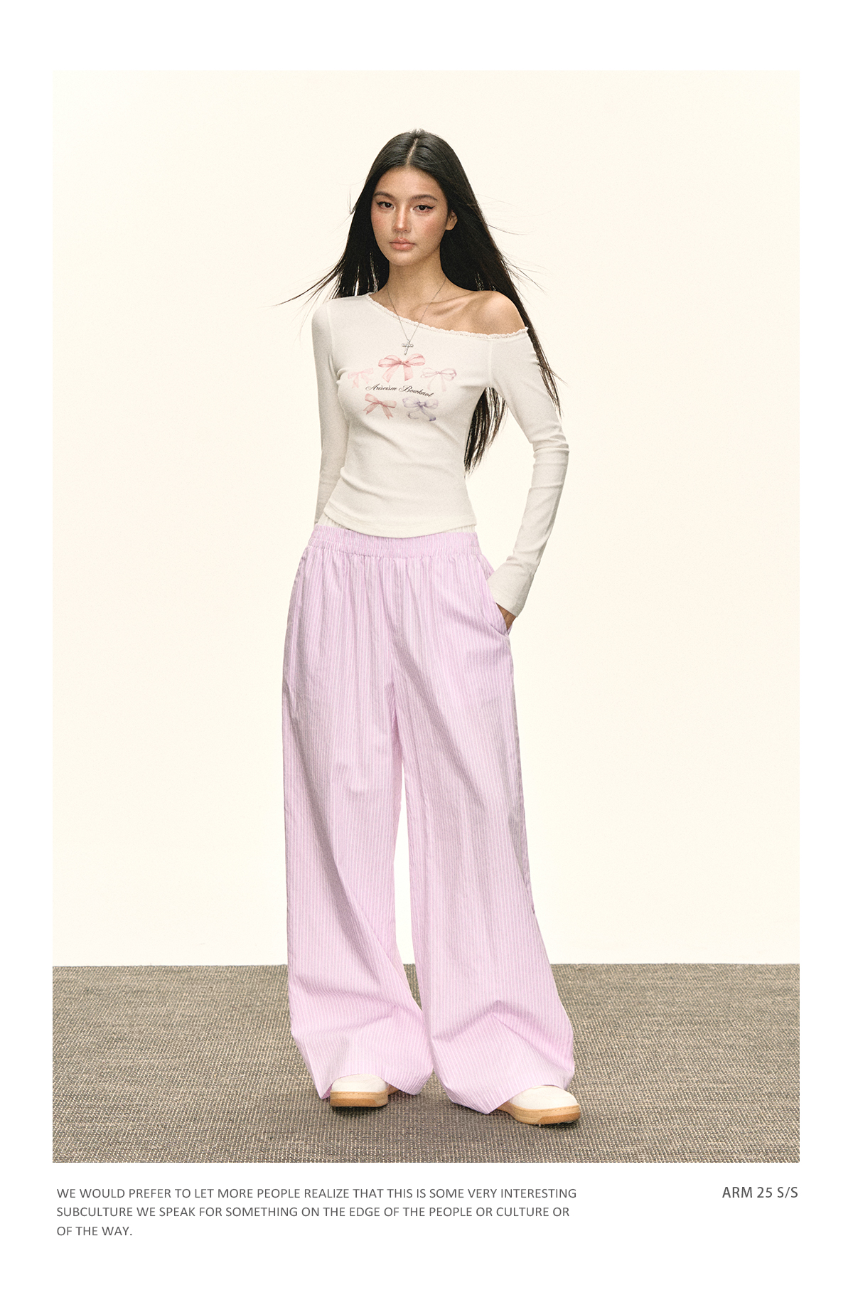 Ariseism 美式复古斜肩蝴蝶结印花长袖T恤女秋季新款修身上衣