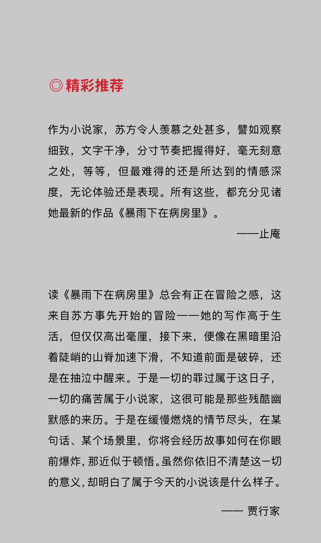 ★ 深切入骨地写出失衡年代,人间乱象。爱着的人都成了病人,一间间屋檐都是病房。不爱的人却失去了症状,疯狂地健康。黑暗中的笑声,各怀心事的人,那些手持地图的迷路者,和那一双双视若无睹的眼睛。