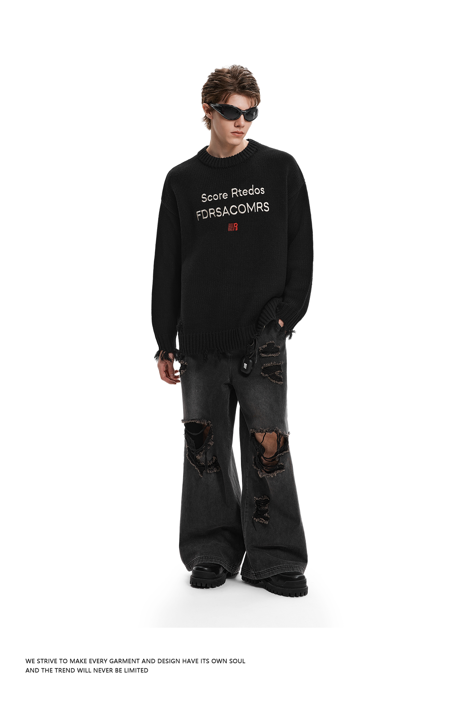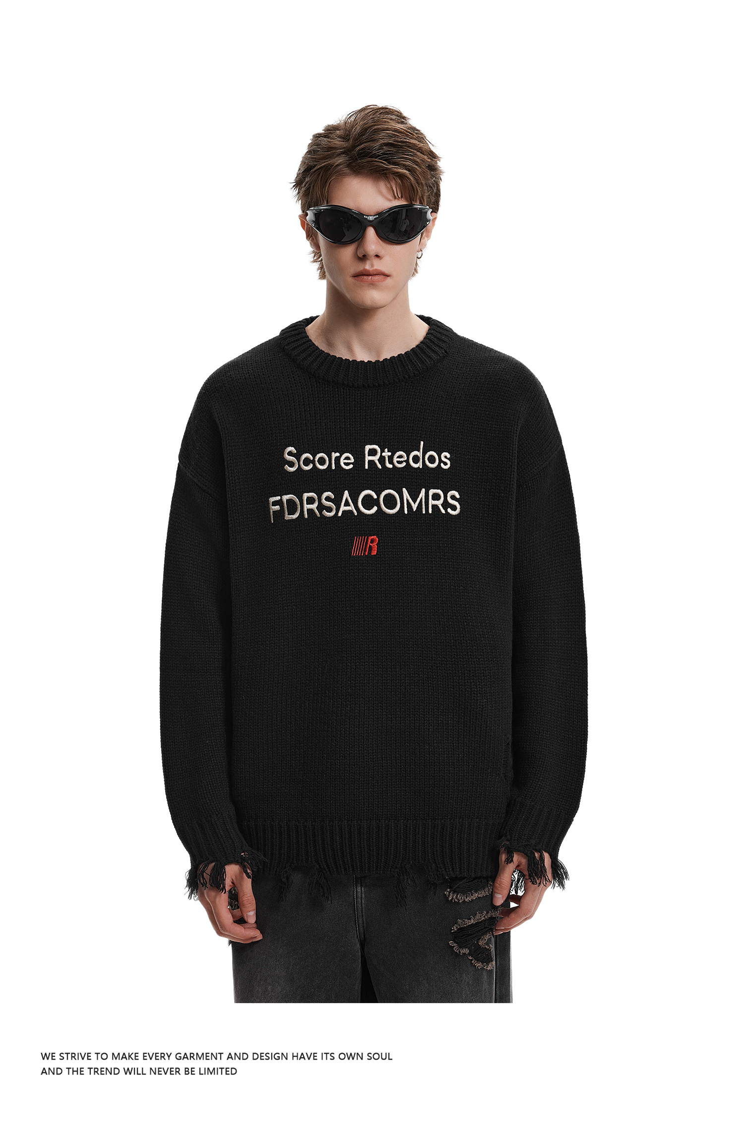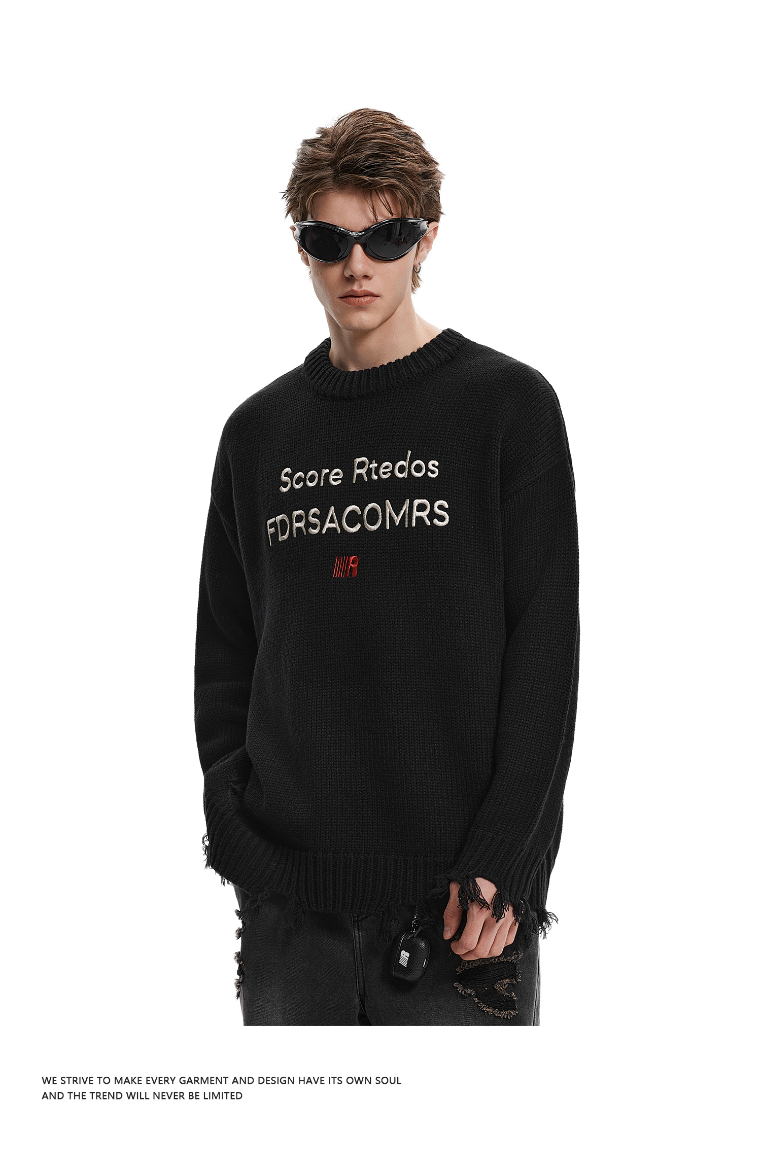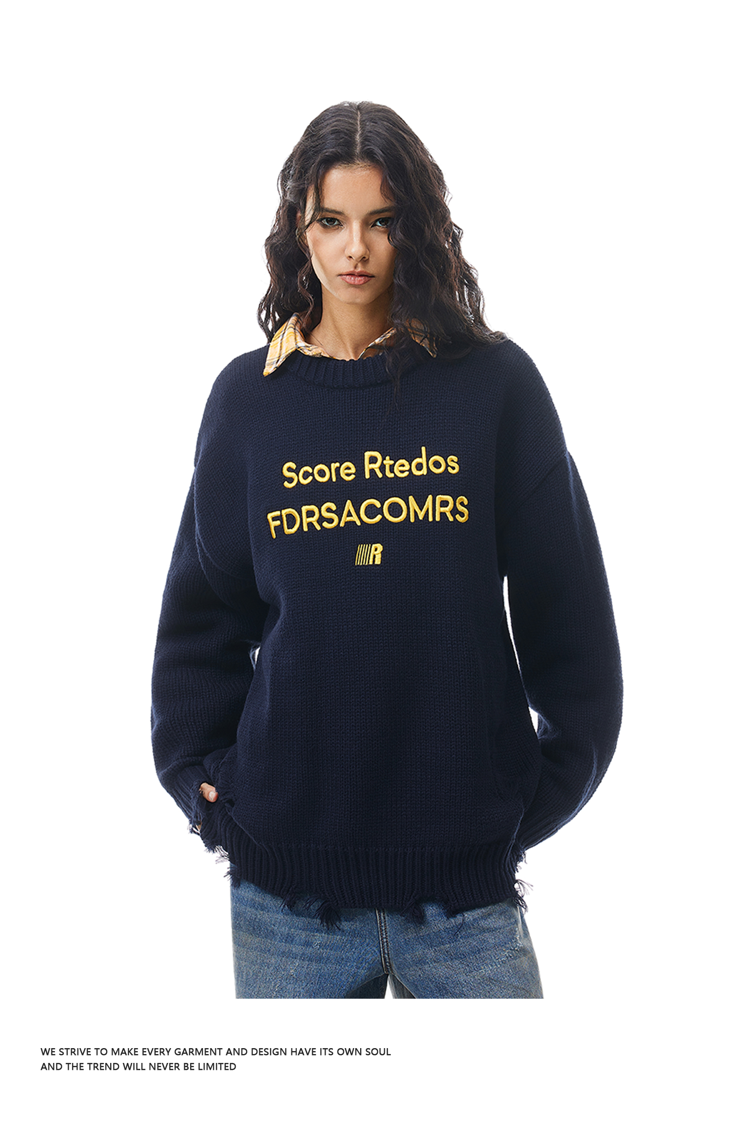 FDR官方店 基础磨破绣花毛衣男女秋冬季情侣美式运动宽松圆领上衣