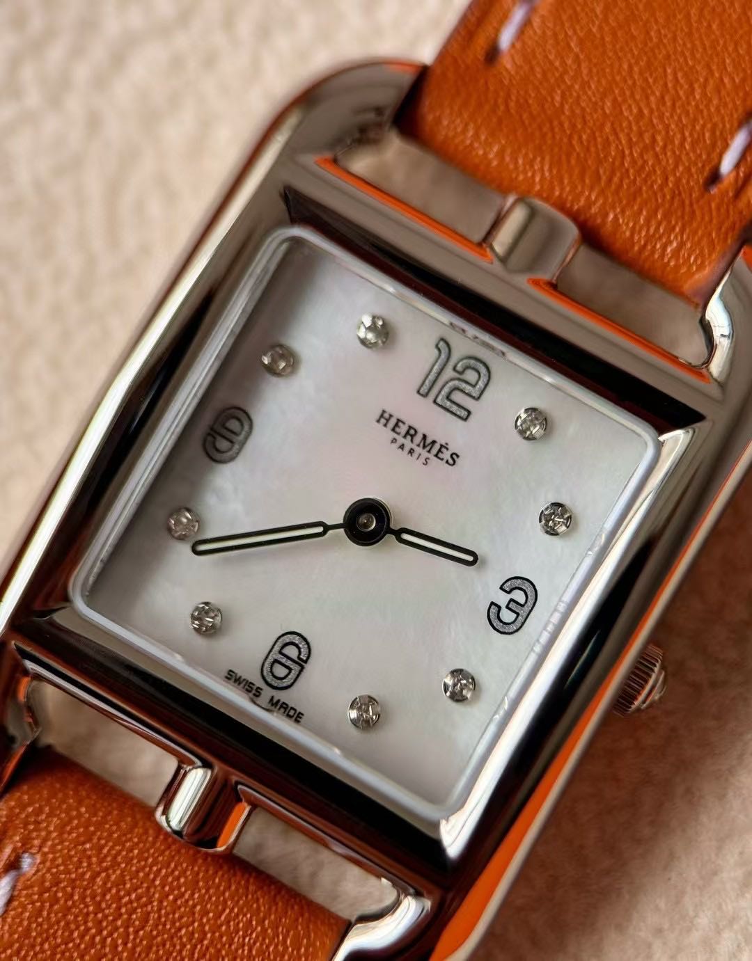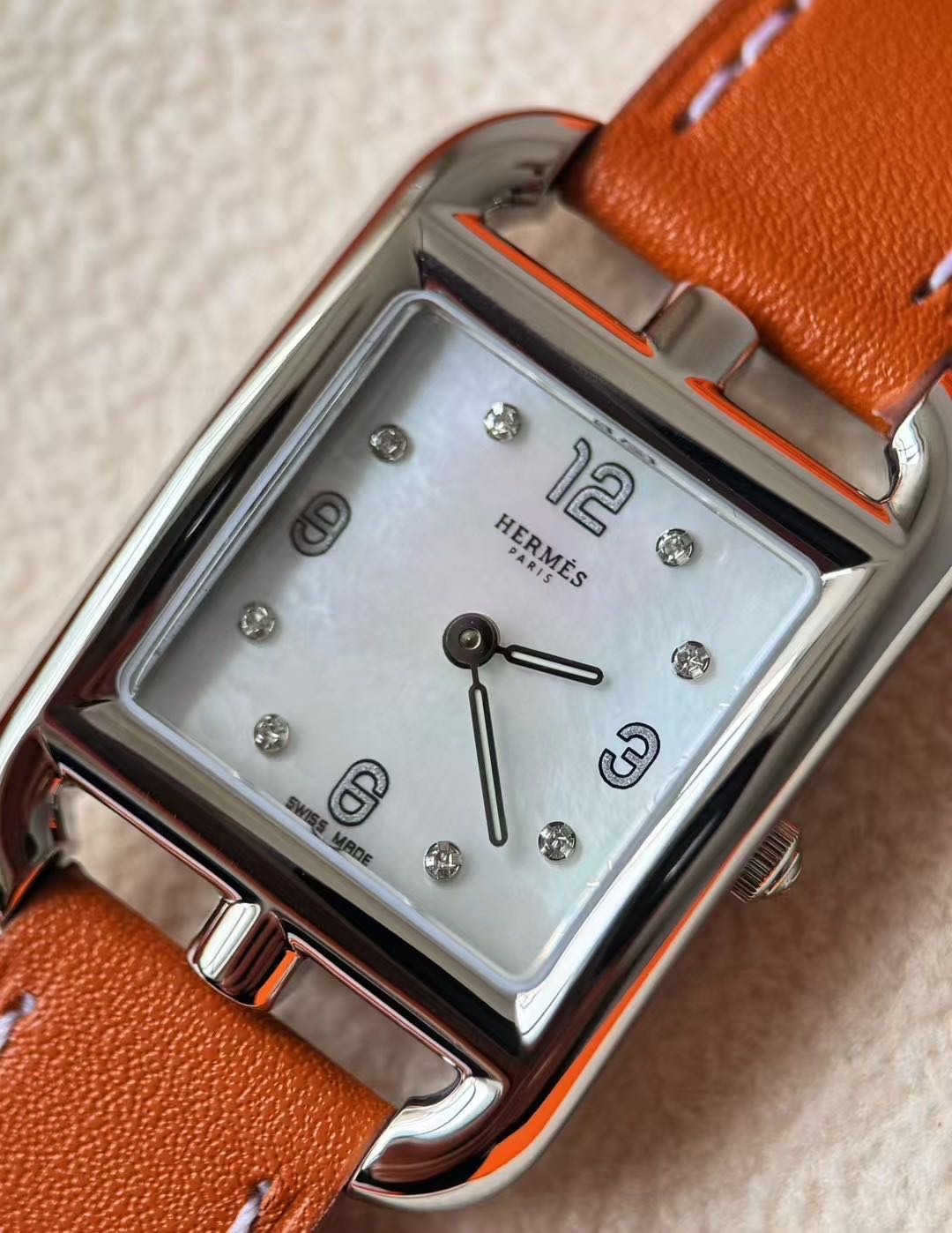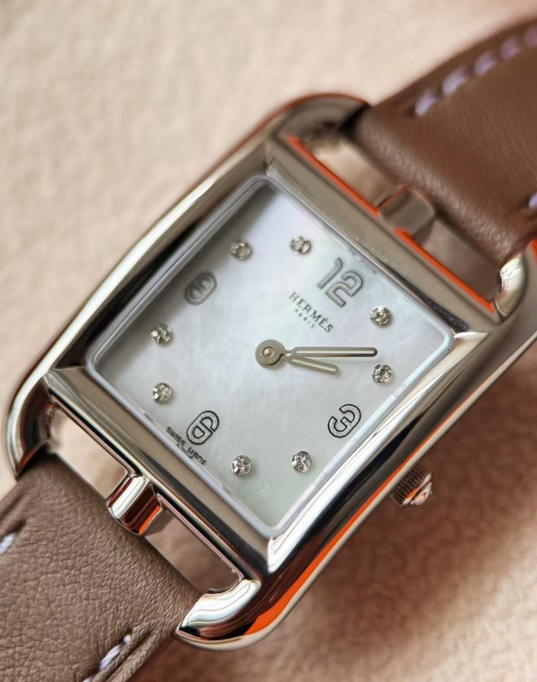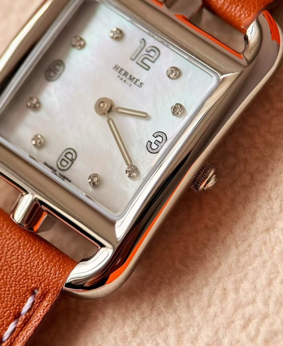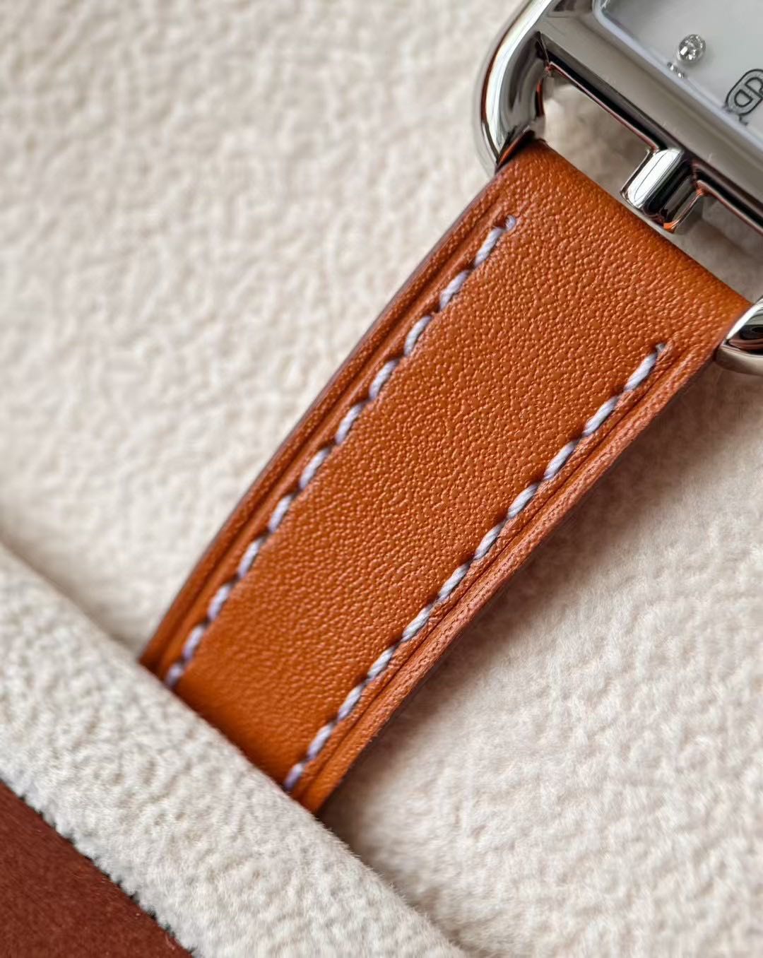 长方形猪鼻子表壳中嵌入正方形表盘,其表壳形状及表盘字体灵感汲取自“锚链”图案,非常特别,个性十足。白色天然珍珠贝母盘面镶8颗1.0真钻,低调奢华感十足,H经典swift牛皮材质,质感细腻、柔韧~