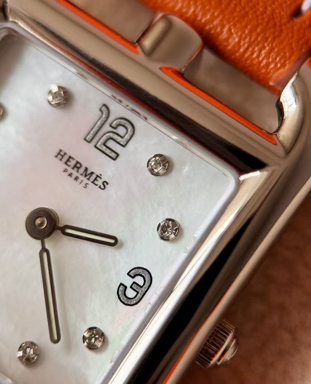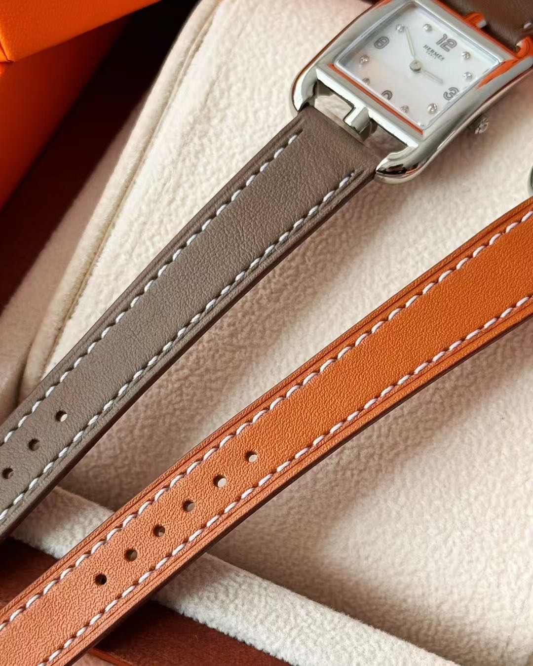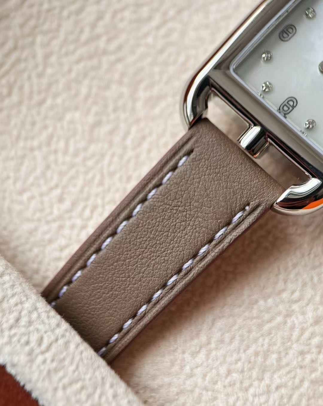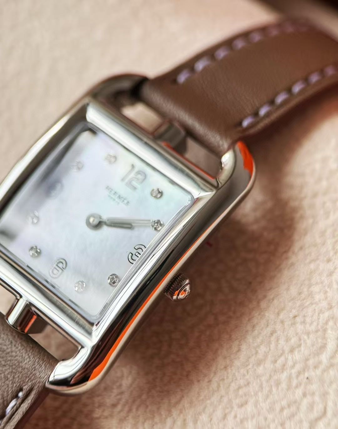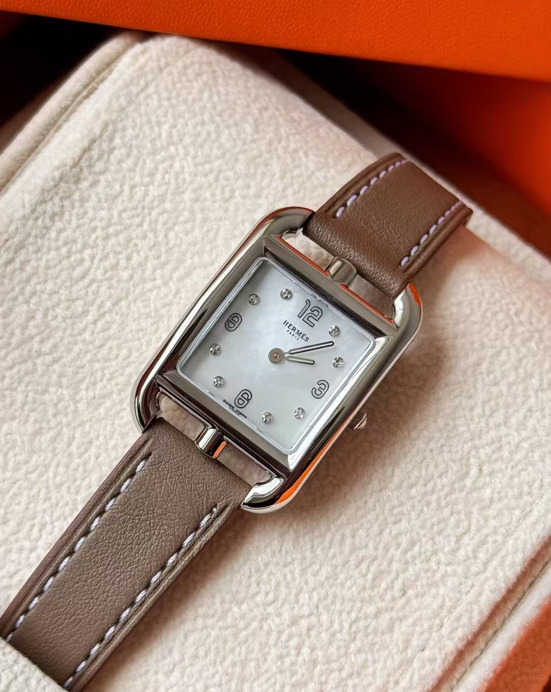长方形猪鼻子表壳中嵌入正方形表盘,其表壳形状及表盘字体灵感汲取自“锚链”图案,非常特别,个性十足。白色天然珍珠贝母盘面镶8颗1.0真钻,低调奢华感十足,H经典swift牛皮材质,质感细腻、柔韧~