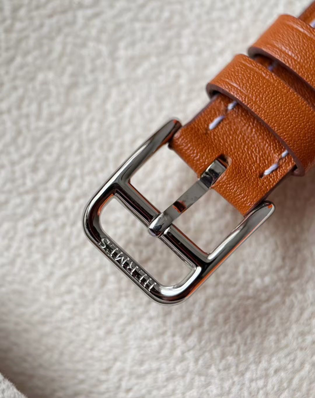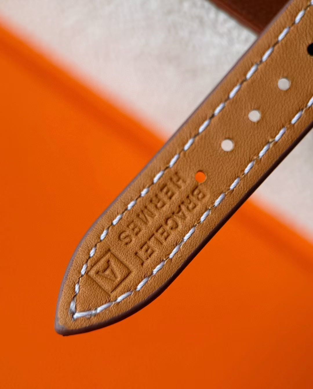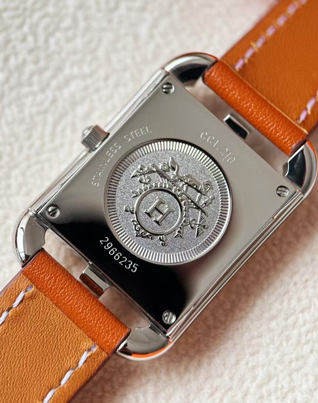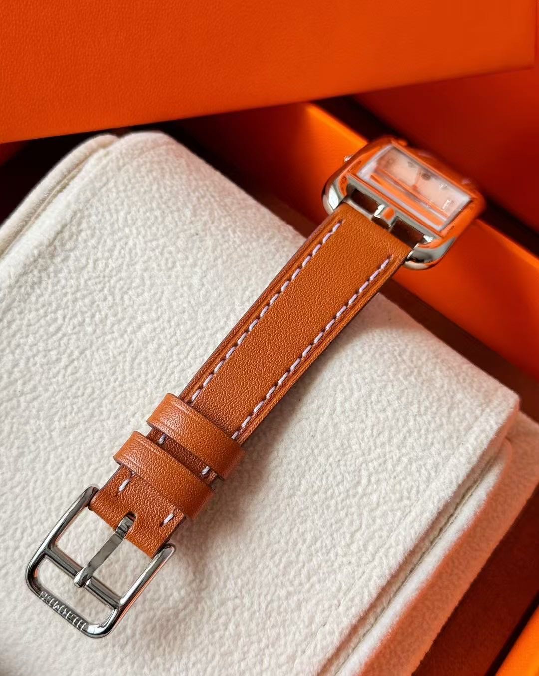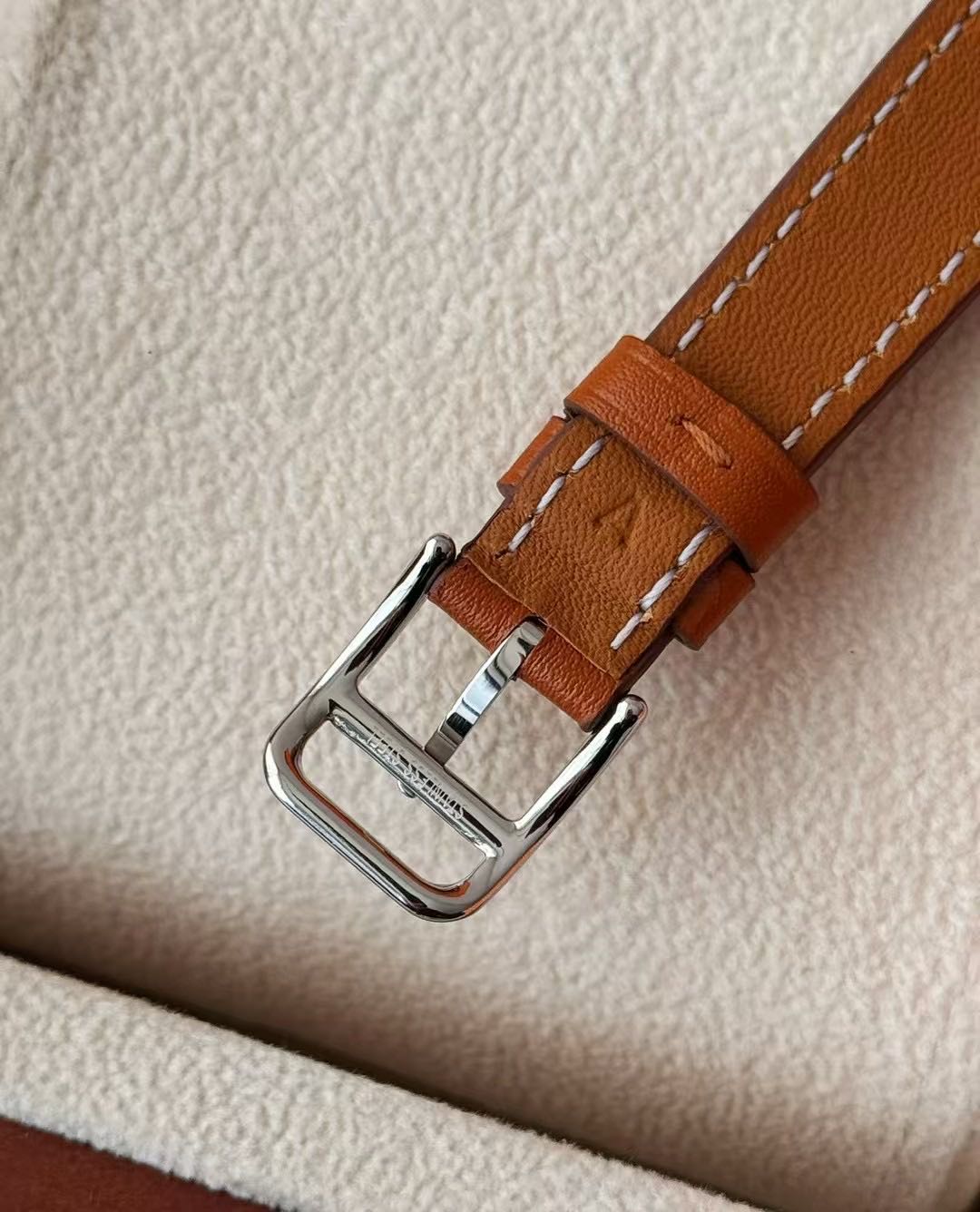 长方形猪鼻子表壳中嵌入正方形表盘,其表壳形状及表盘字体灵感汲取自“锚链”图案,非常特别,个性十足。白色天然珍珠贝母盘面镶8颗1.0真钻,低调奢华感十足,H经典swift牛皮材质,质感细腻、柔韧~