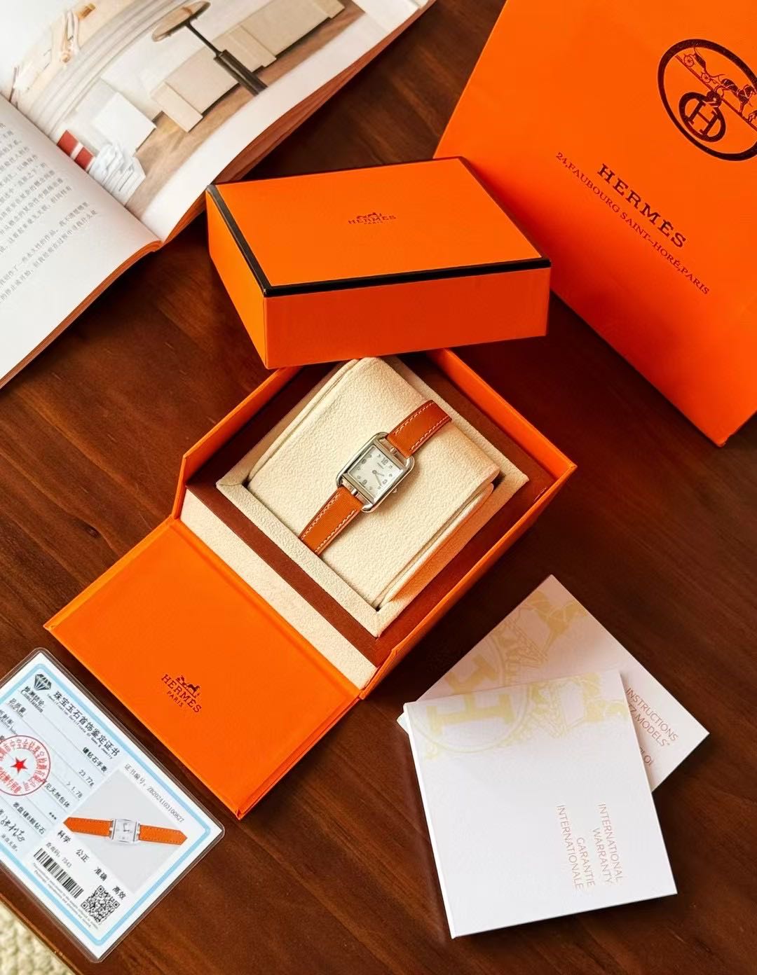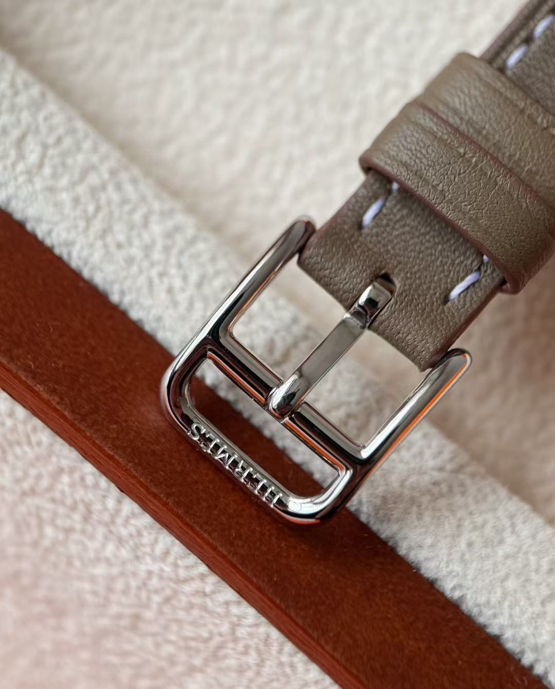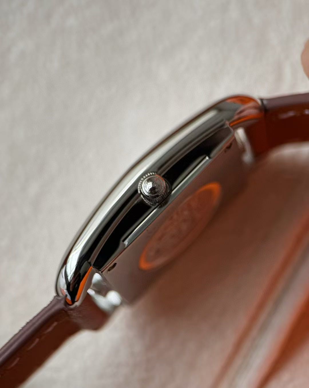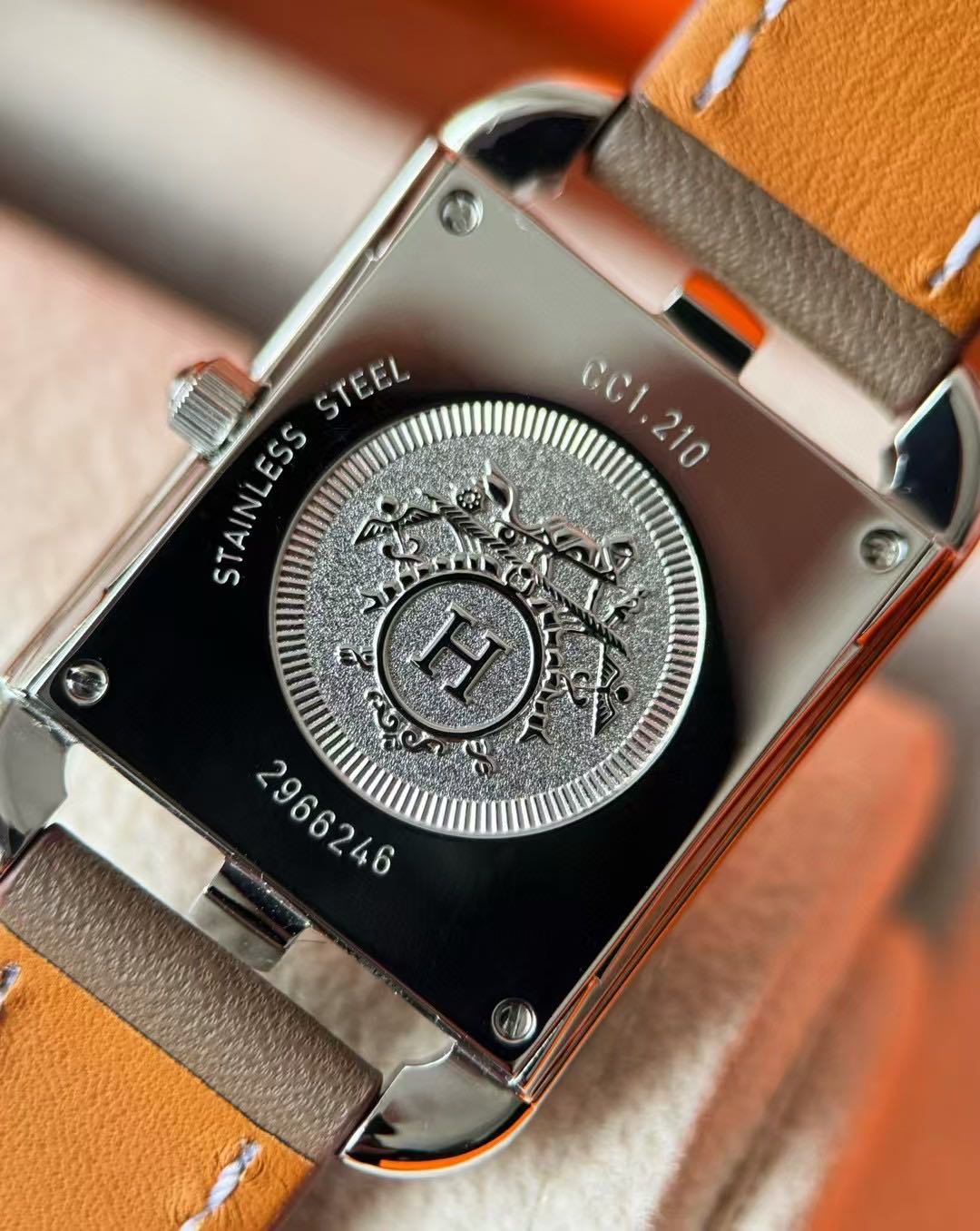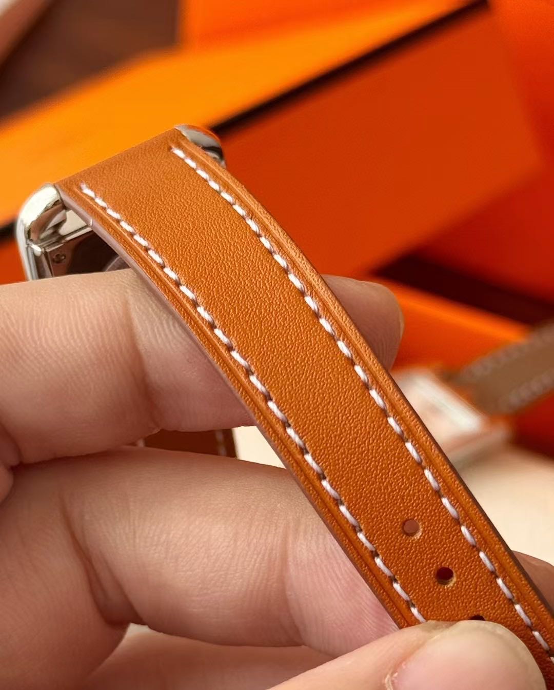 长方形猪鼻子表壳中嵌入正方形表盘,其表壳形状及表盘字体灵感汲取自“锚链”图案,非常特别,个性十足。白色天然珍珠贝母盘面镶8颗1.0真钻,低调奢华感十足,H经典swift牛皮材质,质感细腻、柔韧~