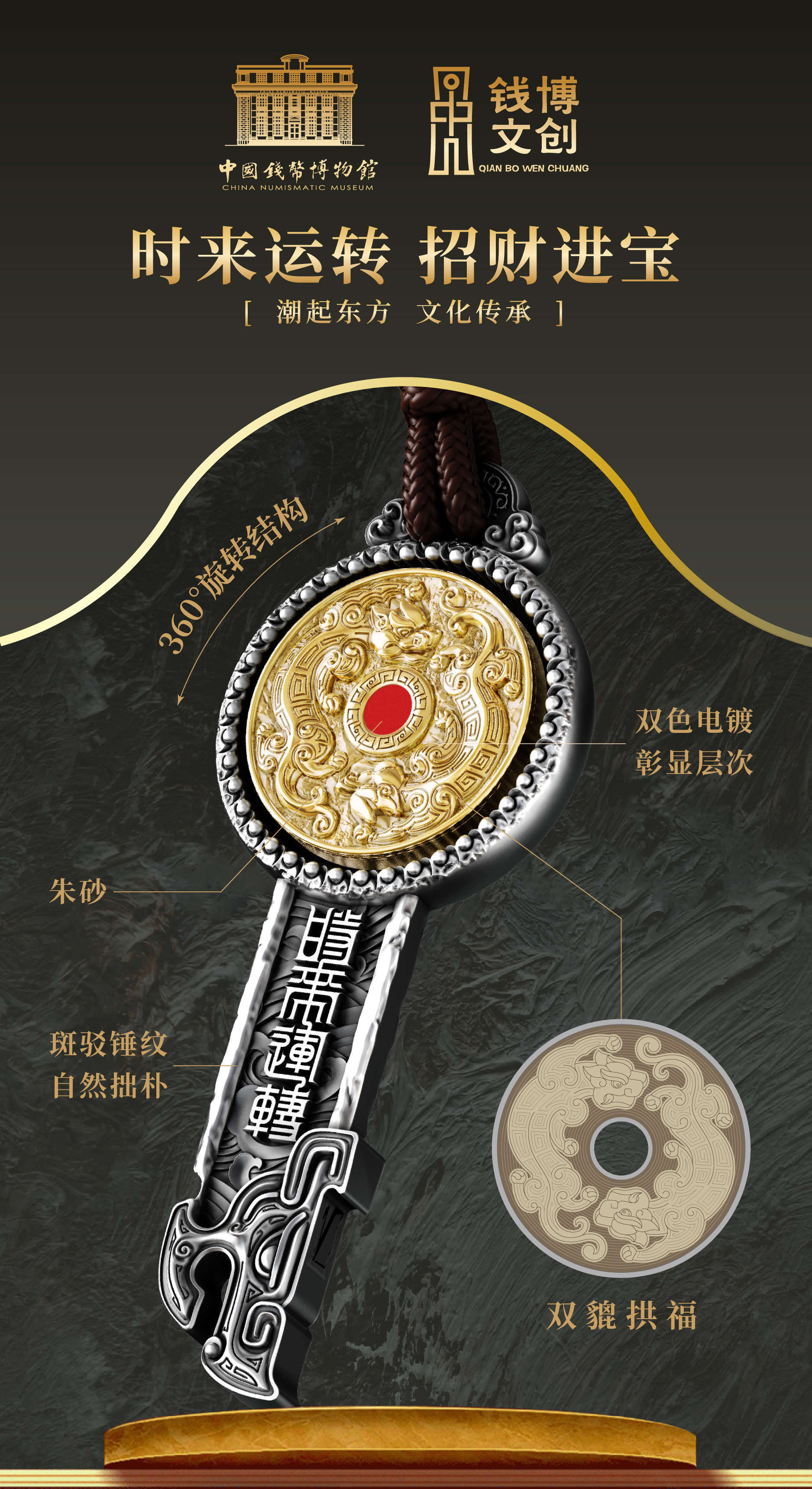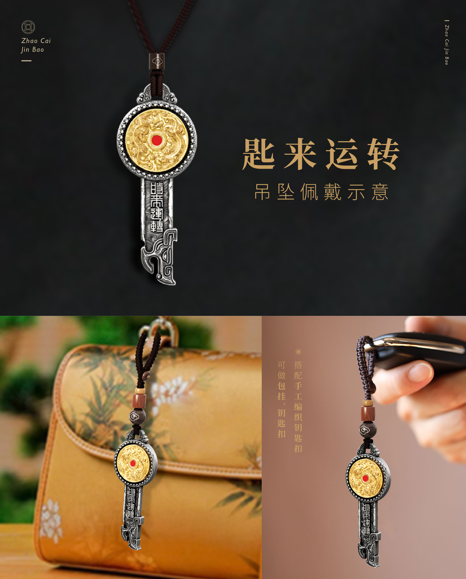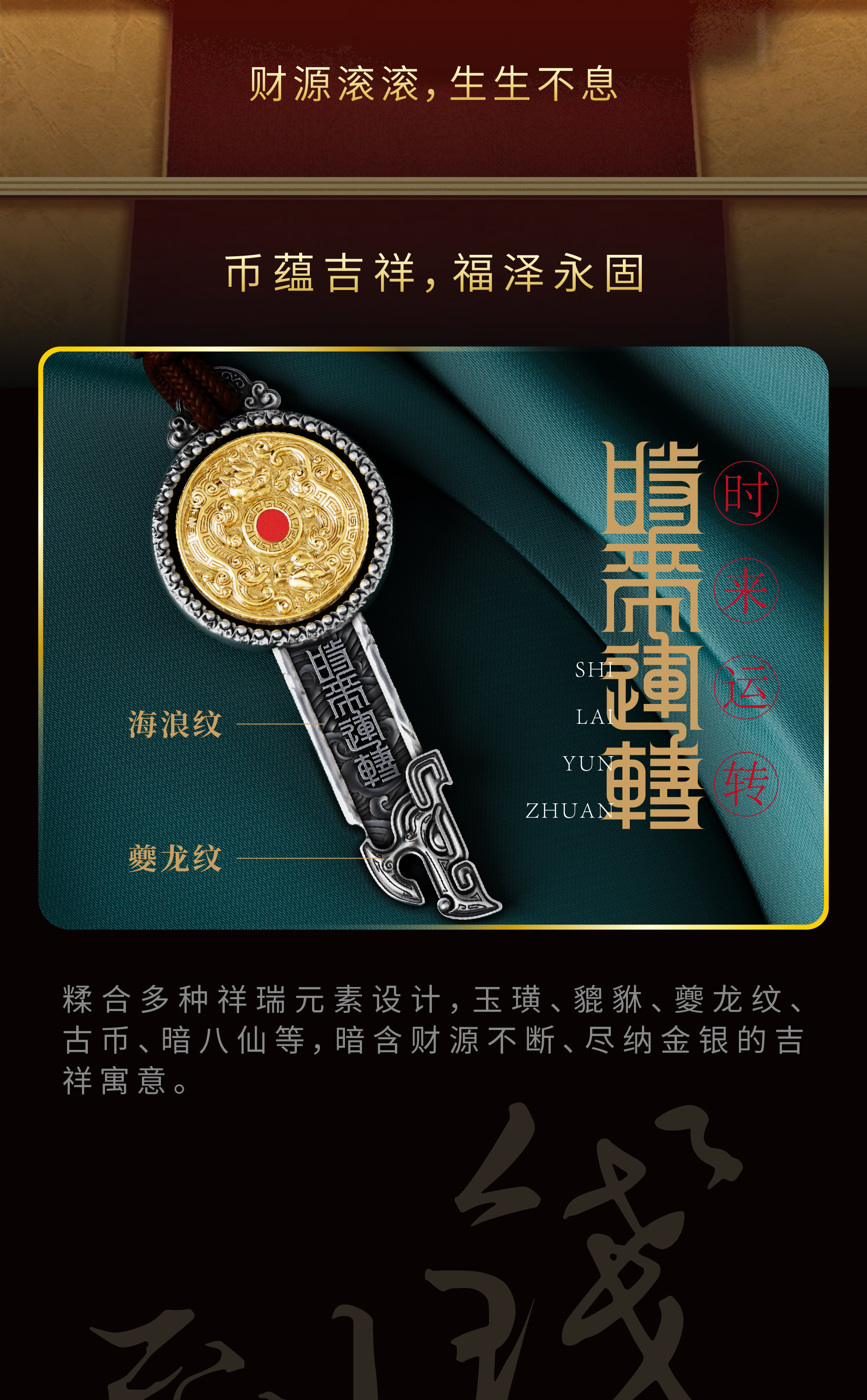 《时来运转》财富挂件 可佩戴 形似钥匙 寓意开启财富幸福之门 带颈绳 挂绳