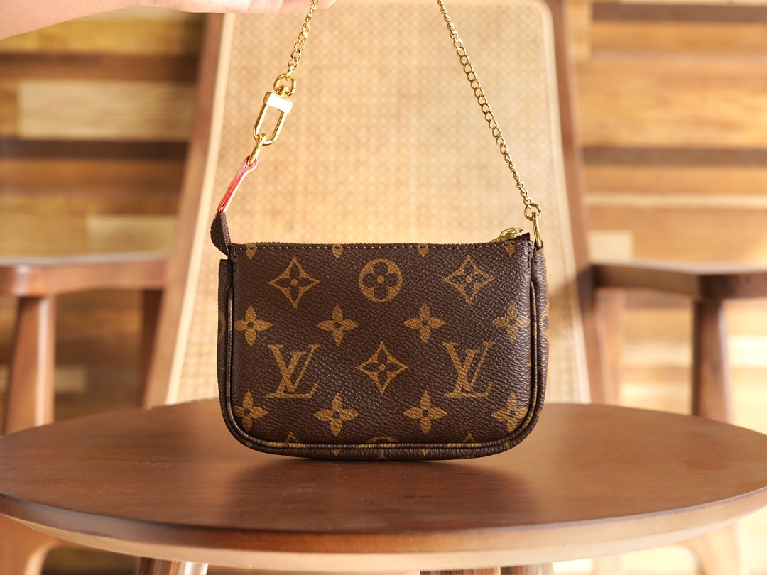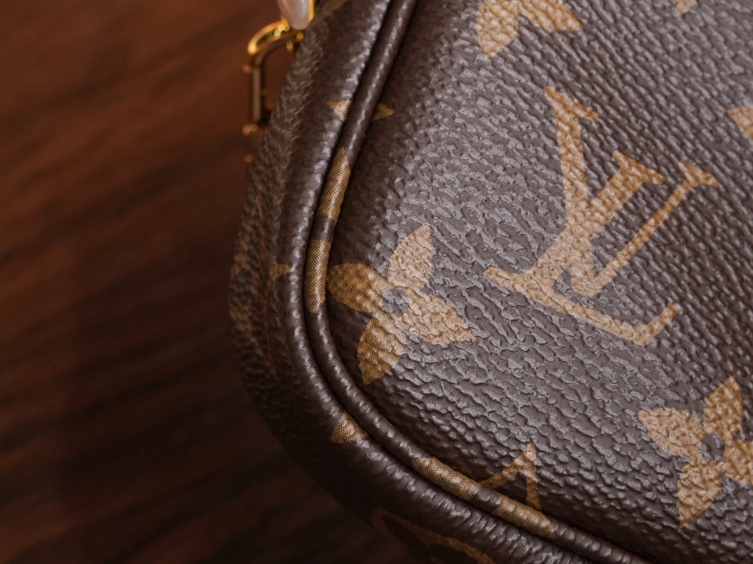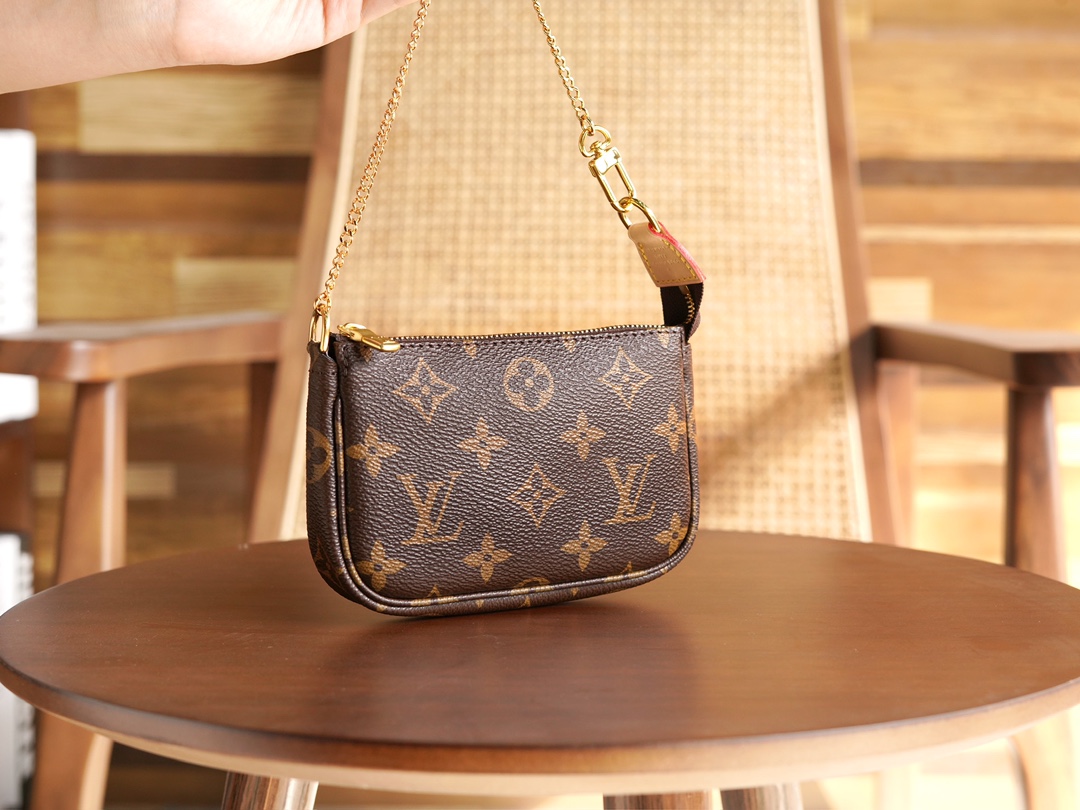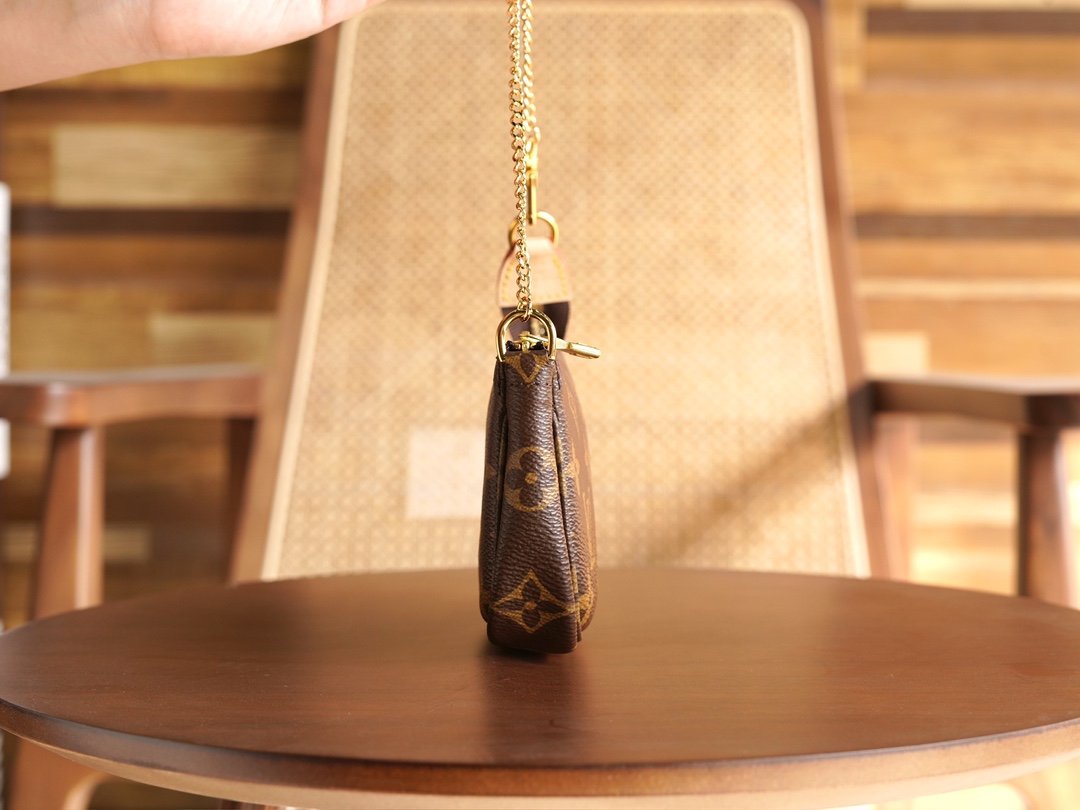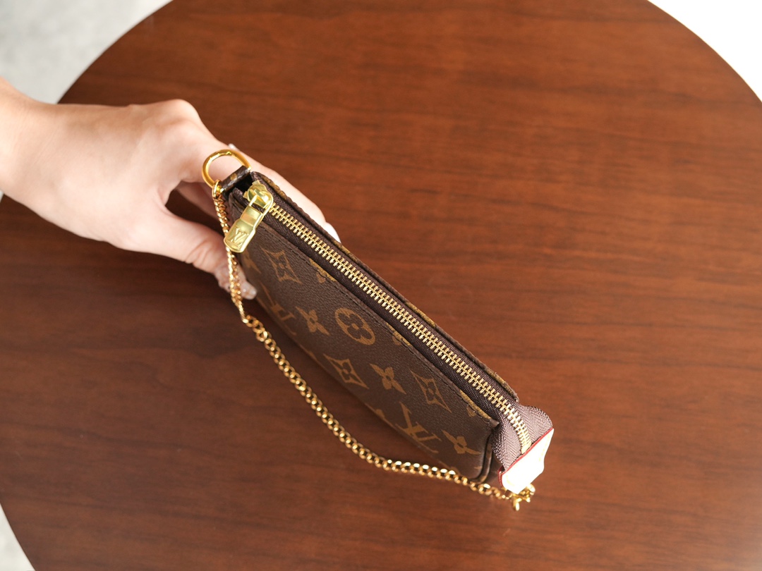 Mini Pochette Accessoires on Chain 手袋以 Monogram 帆布塑造玲珑构型,轻松收纳随行小物。短链条和拉链开合延续原版设计,可拆卸长链条增添肩背和斜挎选择。
