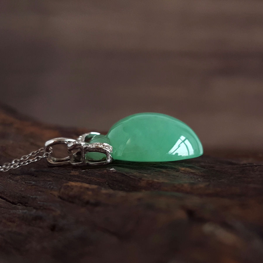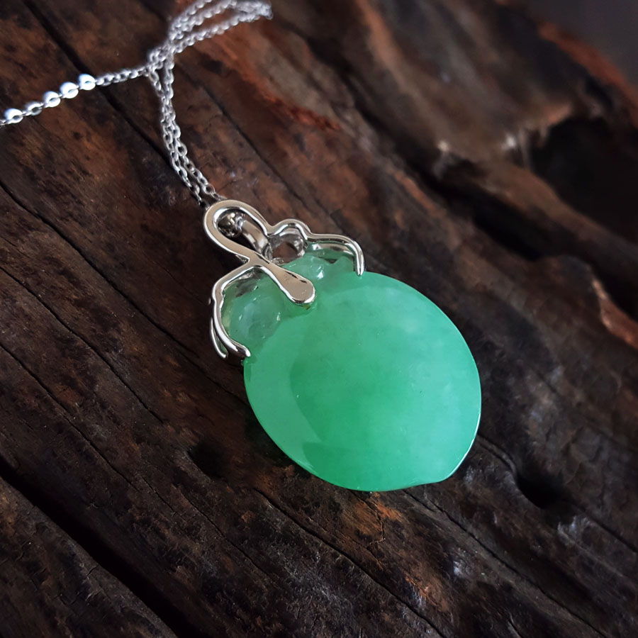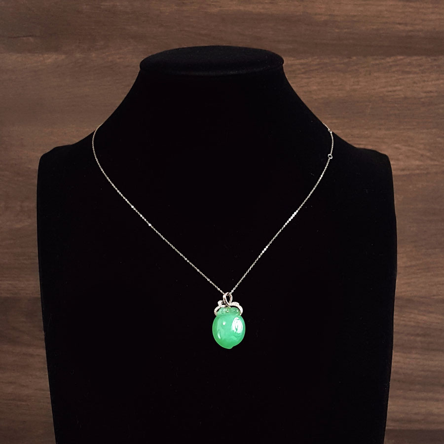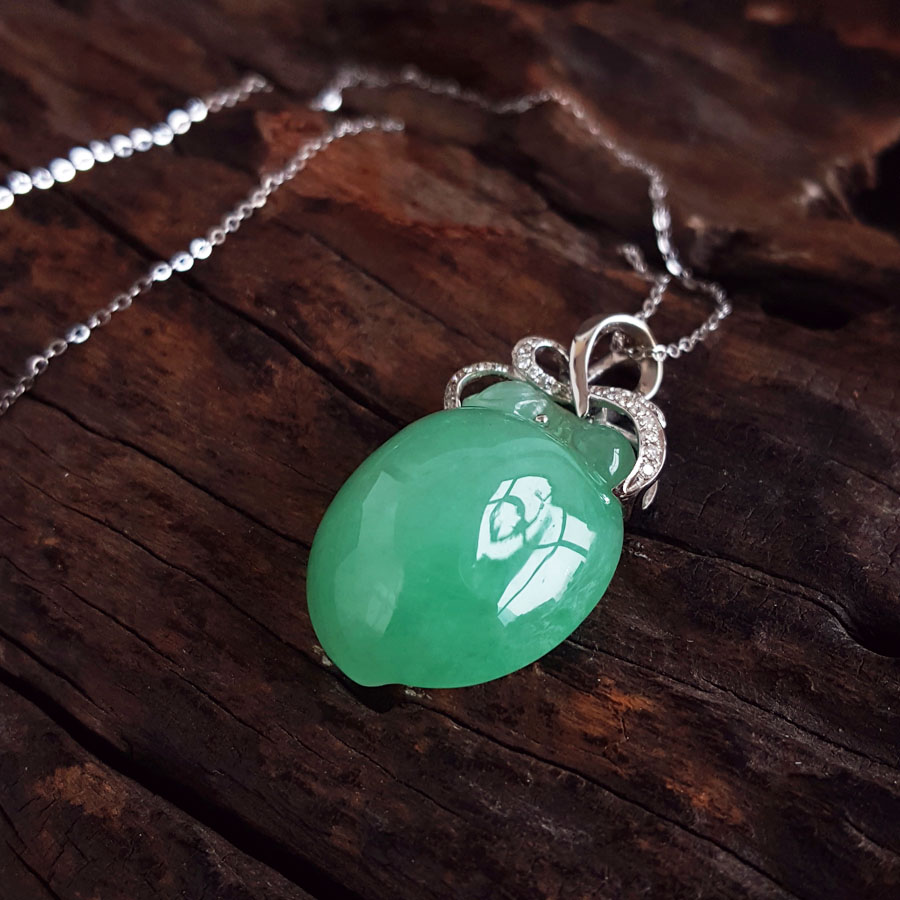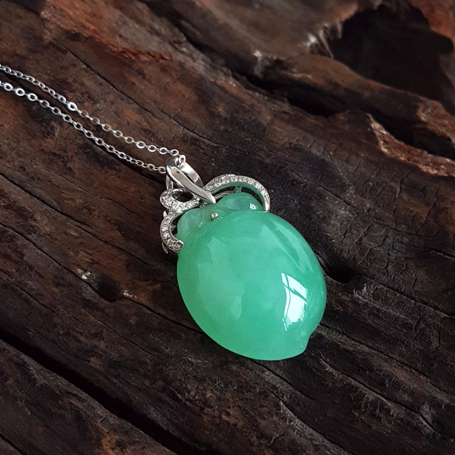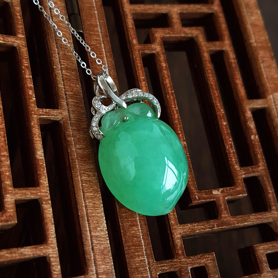 名称 | AU750白金镶钻镶天然细腻满绿糯冰种寿桃造型(福气安康、健康长寿)翡翠吊坠项链 |