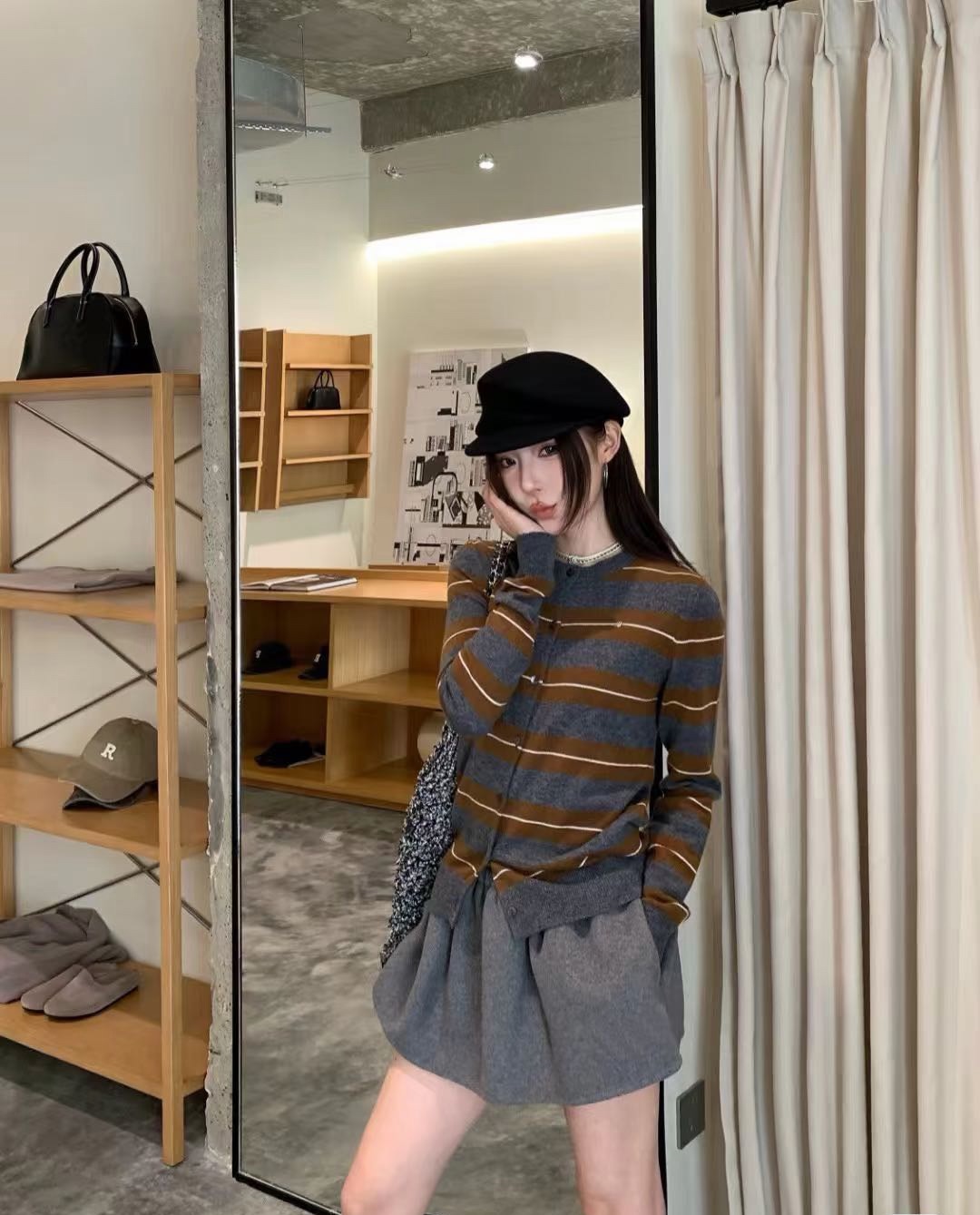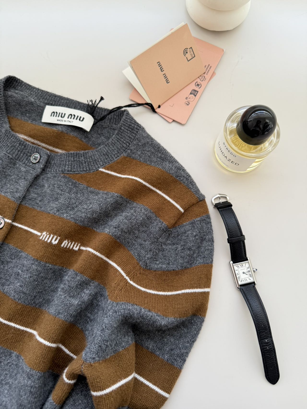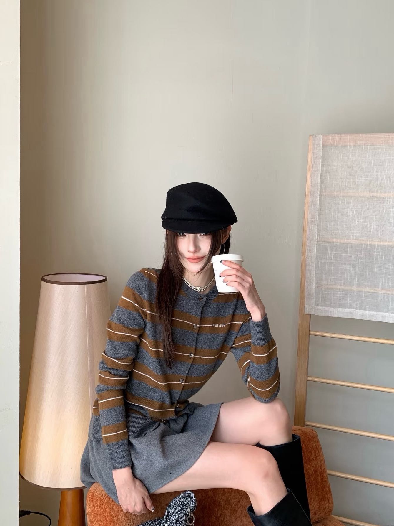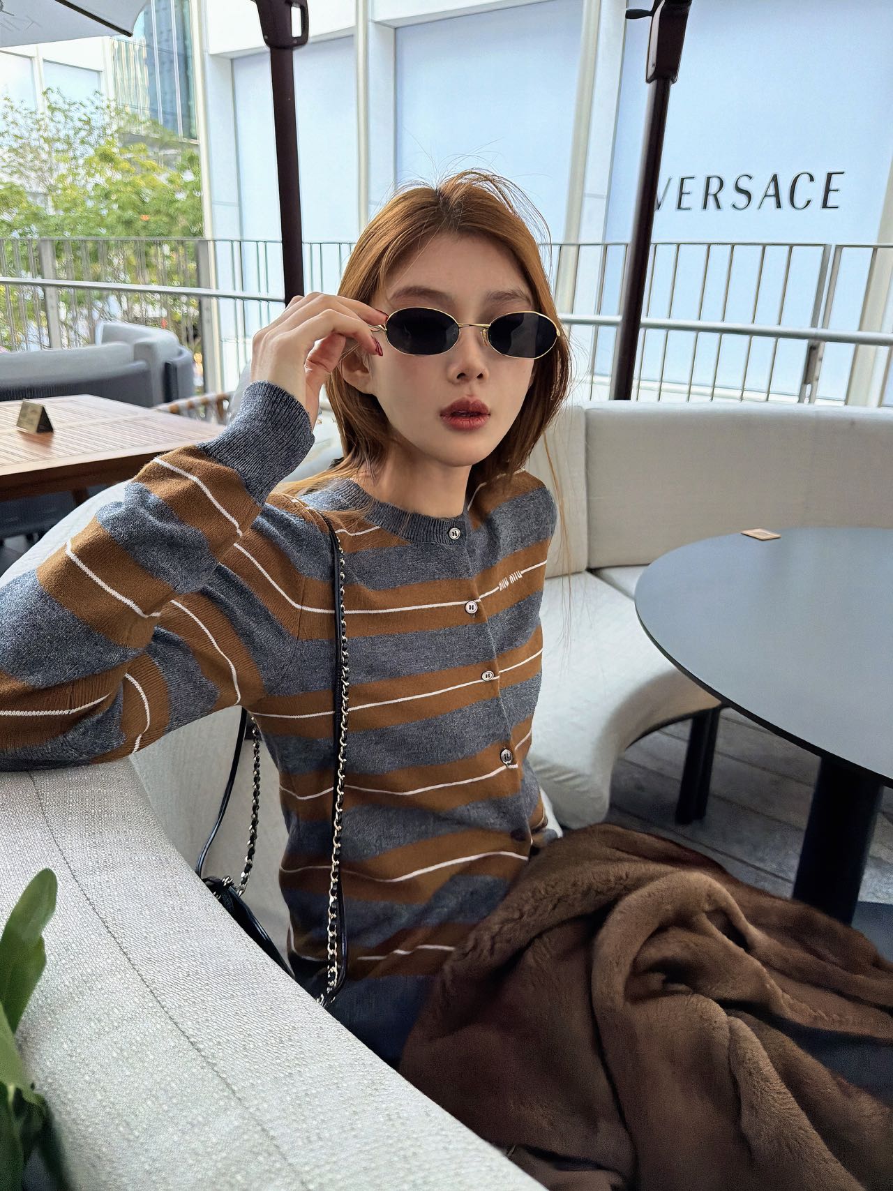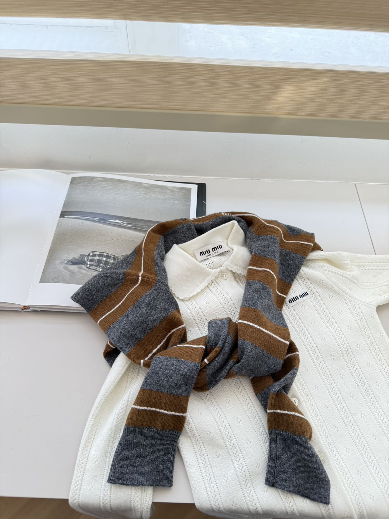 Miu Miu 2025秋冬系列羊绒真丝条纹圆领开衫