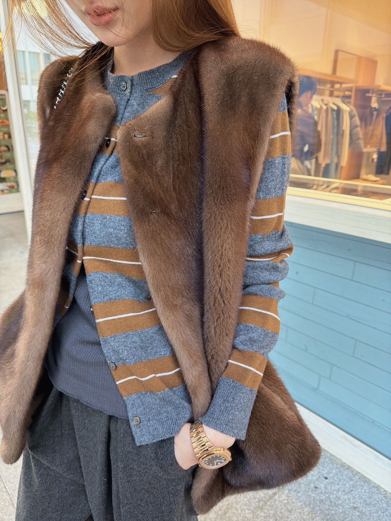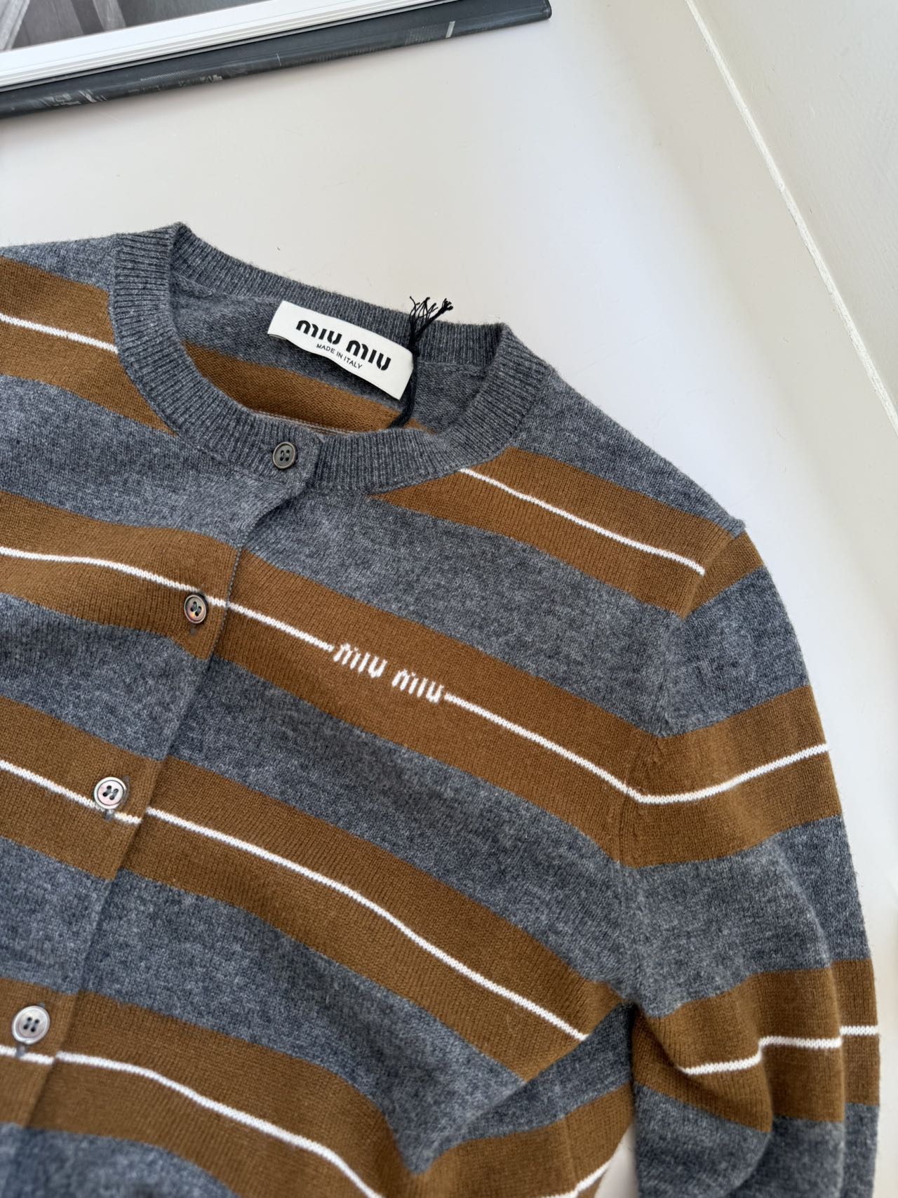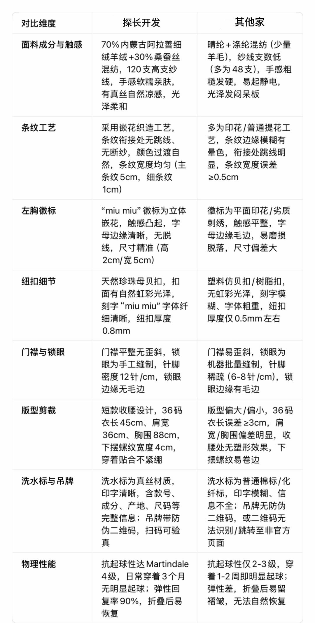 探长家纽扣与门襟:正品为天然珍珠母贝扣,刻字“miu miu”清晰,门襟锁眼为手工缝制(12针/cm);低版本为塑料扣,刻字模糊,机器锁眼针脚稀疏。