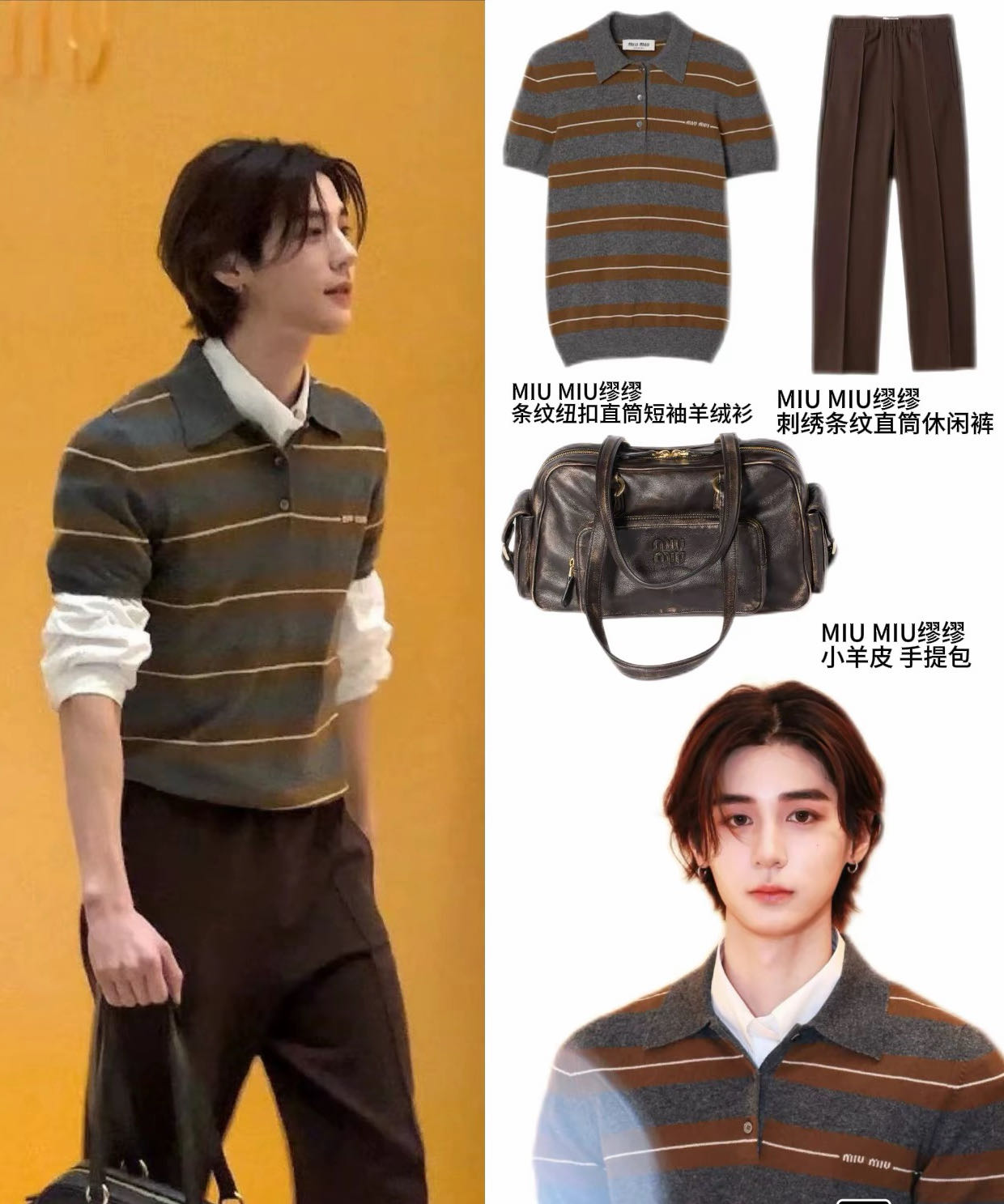 修身短款版型,圆领单排扣设计,左胸嵌花“miu miu”徽标,条纹元素为品牌经典标识,主打轻奢通勤/休闲风格。