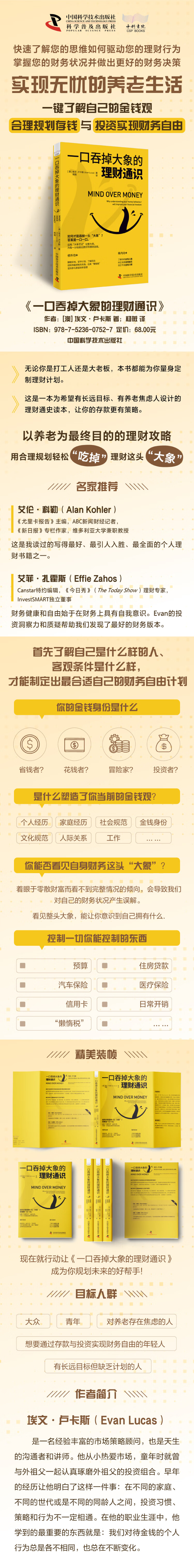 我们所有人使用金钱的方式各不相同:我们当中有人是省钱者,有人是花钱者,有人是冒险家,也有人是投资者。《一口吞掉大象的理财通识》可以帮助你了解自己的金钱人格,并了解思维是如何驱动金钱行为的。它可以教会你如何通过确认自己的习得行为并发挥自身优势做出更好的金钱决策,从而实现个人财务目标。