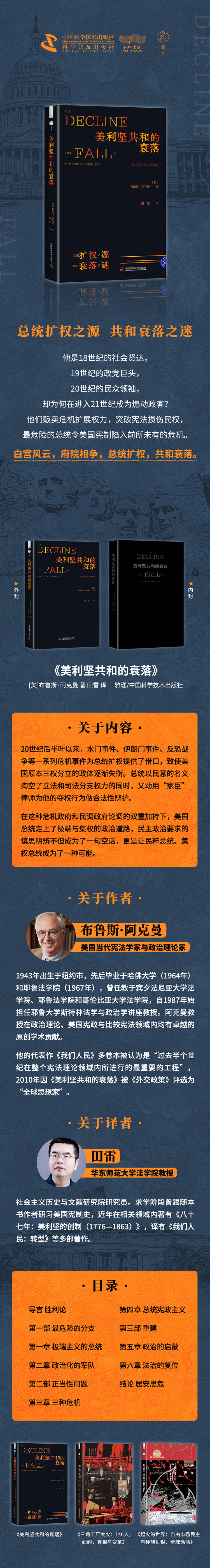 白宫风云,府院相争,总统扩权,共和衰落。在本书中,阿克曼从制度运行的视角,通过对美国宪制中一系列看似孤立的事件进行梳理和分析,成功预言了21世纪的美国宪制危机,并试图在亡羊补牢前提出一系列可能降低前路风险的改革。