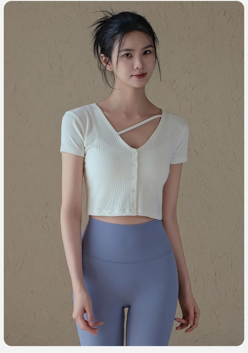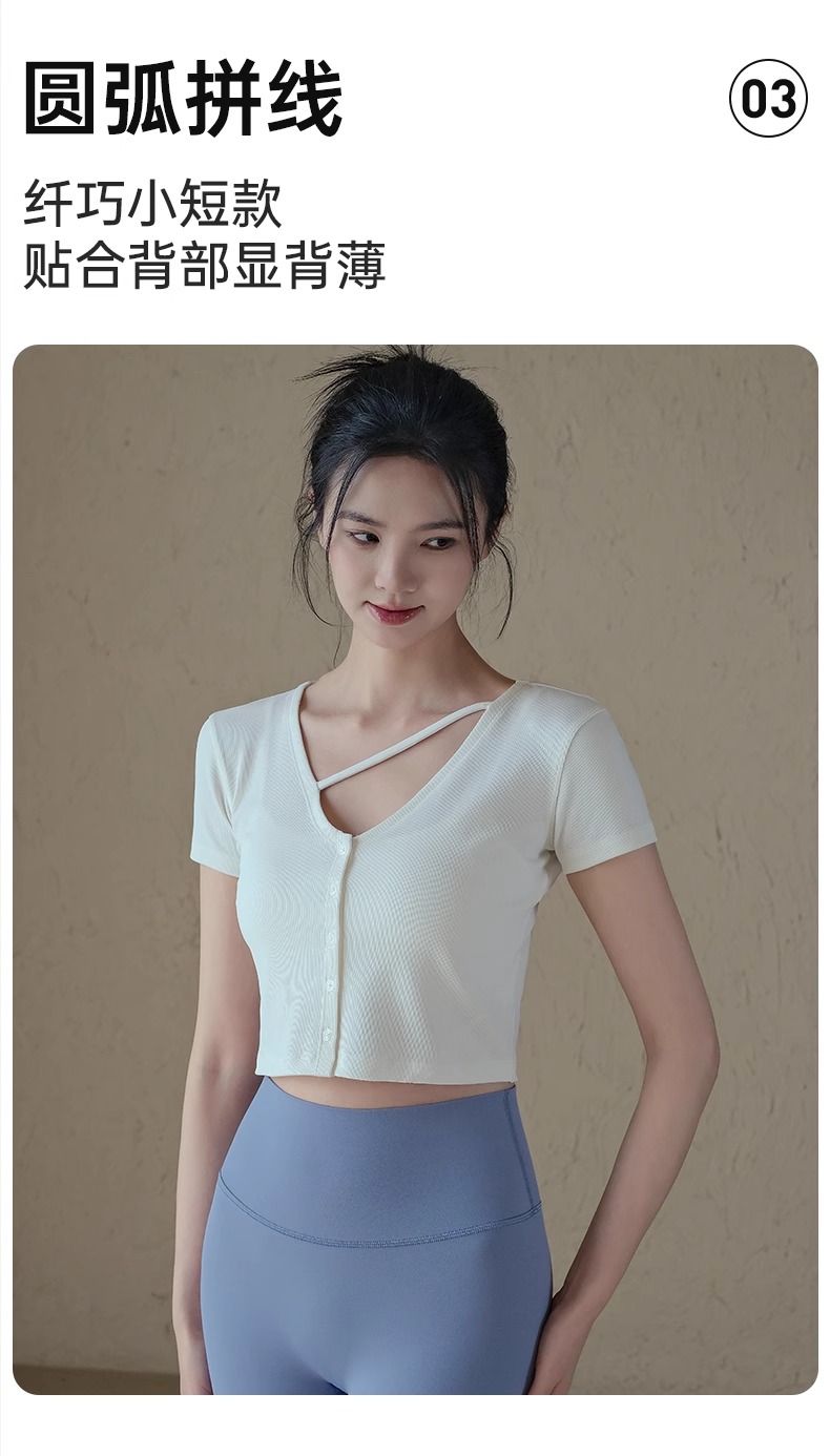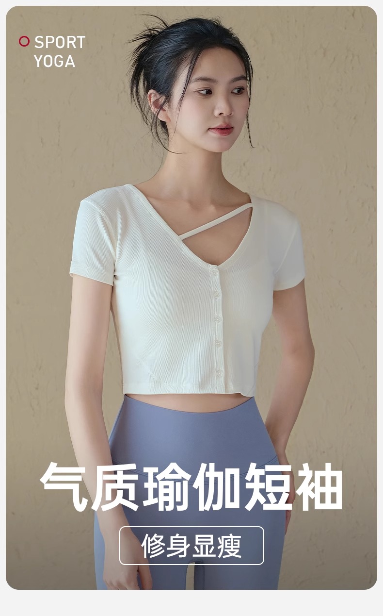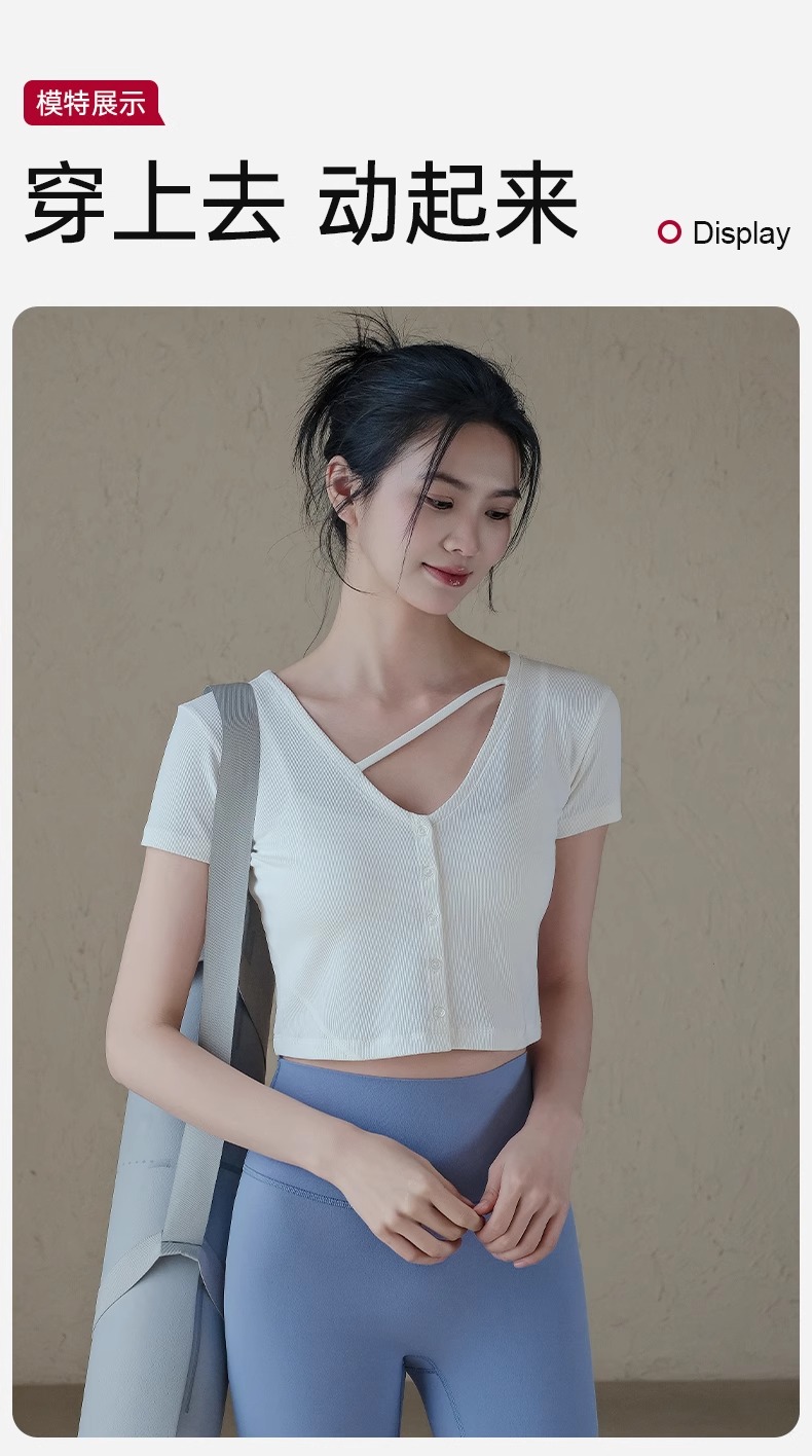 跃牌【周游世界系列】春夏新款瑜伽服女纽扣开衫修身显瘦短袖透气辣妹T恤TP0865