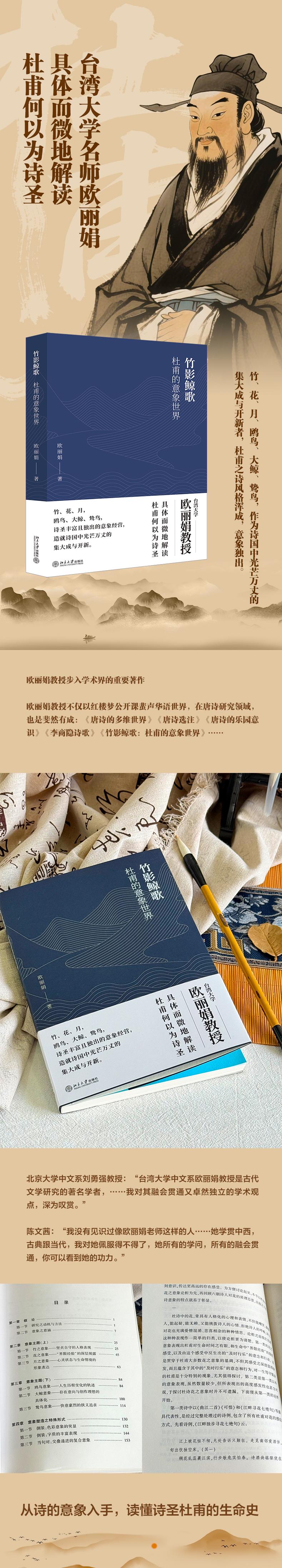 一千多年以来,杜甫的“诗圣”的地位可谓无人可堪比肩, 作为诗国中光芒万丈的集大成与开新者,杜甫之诗风格浑成,意象独出。 台湾大学中文系欧丽娟教授代表作之一《竹影鲸歌:杜甫的意象世界》 致力于足以显发杜甫生命与艺术成就的标志性意象, 如竹、花、月、鸥鸟、大鲸、鸷鸟等,吸收传统中的灼然慧见, 将杜诗意象纳入《诗经》以来的整个诗史发展脉络中观察, 更借鉴西方文学研究的理论方法和观察分析的眼光, 由此可以具体而微地理解杜甫何以为诗圣。