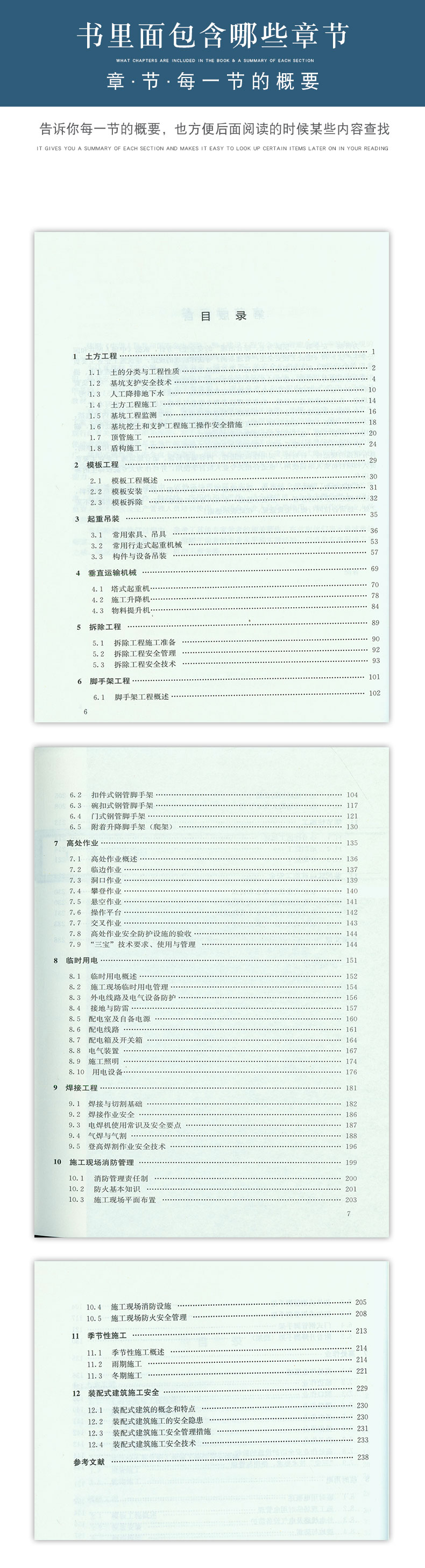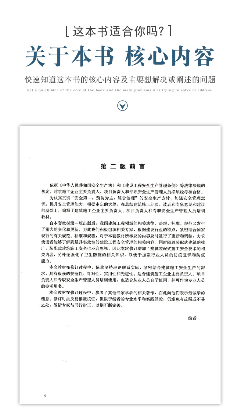 本套教材第一版是根据住建部印发《建筑施工企业主要负责人 项目负责人和专职安全生产管理人员安全生产管理规定实施意见的通知》的文件精神,针对施工企业相关三类人员的安全教育培训教材,组织中建一局的有关专家进行研讨,结合中建系统的行业资源基础上编写的本书侧重于土建施工的安全技术要求,内容主要包括:土方工程、模板工程、脚手架工程、高处作业、临时用电、电气焊工程、施工现场防火、季节性施工、工程建设标准强制性条文九个方面。本书适合适合专职安全生产管理人员培训使用,也适合从业人员自学使用,并可作为专业人员的参考用书。
