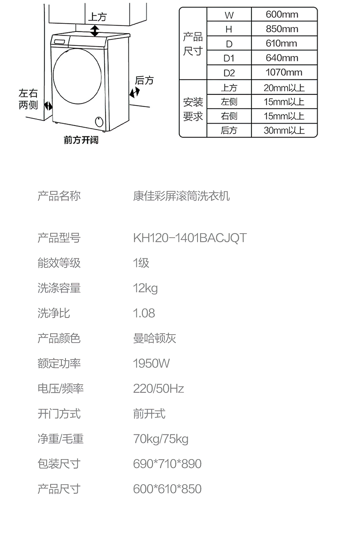 康佳(KONKA)12公斤臻彩智慧洗烘洗衣机 KH120-1401BACJQT