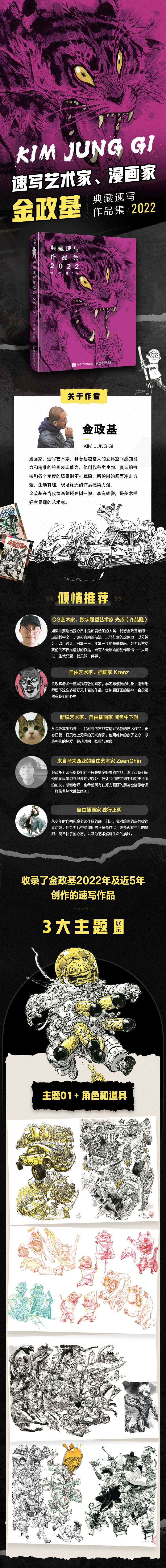 一、金政基国际速写艺术家、漫画家典藏作品集金政基是国际插画家、漫画家,其具备超越常人的立体空间感知能力和精准的绘画表现能力,因创作复杂的速写从不打草稿被称作;人肉打印机。在当代插画、漫画领域享有盛誉,也是美术爱好者;膜拜的大神。本作品集收录了金政基2022年及近5年创作的速写作品,分为三个主题展示,分别为:主题一角色和道具,主题二场景和空间,主题三镜头和叙事。全书内容丰富,画面精美,印刷专业,适合绘画爱好者和学习者阅读、临摹、参考,也适合欣赏与收藏。二、国内艺术家、插画师倾情推荐CG艺术家、数字雕塑艺术家 光叔(许喆隆)如果非要选出我心目中热爱绘画的人类,我想金政基老师一定是其中之一。游刃有余的技法、天马行空的想象力,以分钟计、以小时计,日复一日、年复一年的辛勤耕耘,金老师留给我们的不仅是精彩的作品,更有人原始的创作激情人可以一生就只爱,就只做一件事。自由艺术家、插画家 Krenz金政基老师一直是我尊敬的画家,学习与模仿的对象,谢谢老师留下这么多精彩又丰富的作品,您热爱画画的精神,会永远留在我们的心中。新锐艺术家、自由插画家 咸鱼中下游从金政基老师身上,我看到的不只有精妙绝伦的艺术作品,更有日复一日灵魂上无声的刀光剑影。他用纯粹的赤子之心,以最朴实的热爱,超越时间、欲望与生命。来自马来西亚的自由艺术家 ZeenChin金政基老师带给我们的不只是很多好看的作品,除了让我们从他的画里学习到很多知识以外,还让我们感受到老师对于绘画的热忱。感谢老师,也希望所有在努力画画的朋友也能像老师一样带着热忱继续画画!自由插画家 独行正明从少年时代初见金老师作品的那一刻起,我对绘画的热情被彻底点燃。但金老师带给我们的不仅是作品,更是观察生活的慧眼、简单快乐的心态,以及为艺术燃烧生命的虔诚。三、精心打造,值得珍藏内容丰富,画面精美,印刷专业,适合绘画爱好者和学习者阅读、临摹、参考,也适合欣赏与收藏。