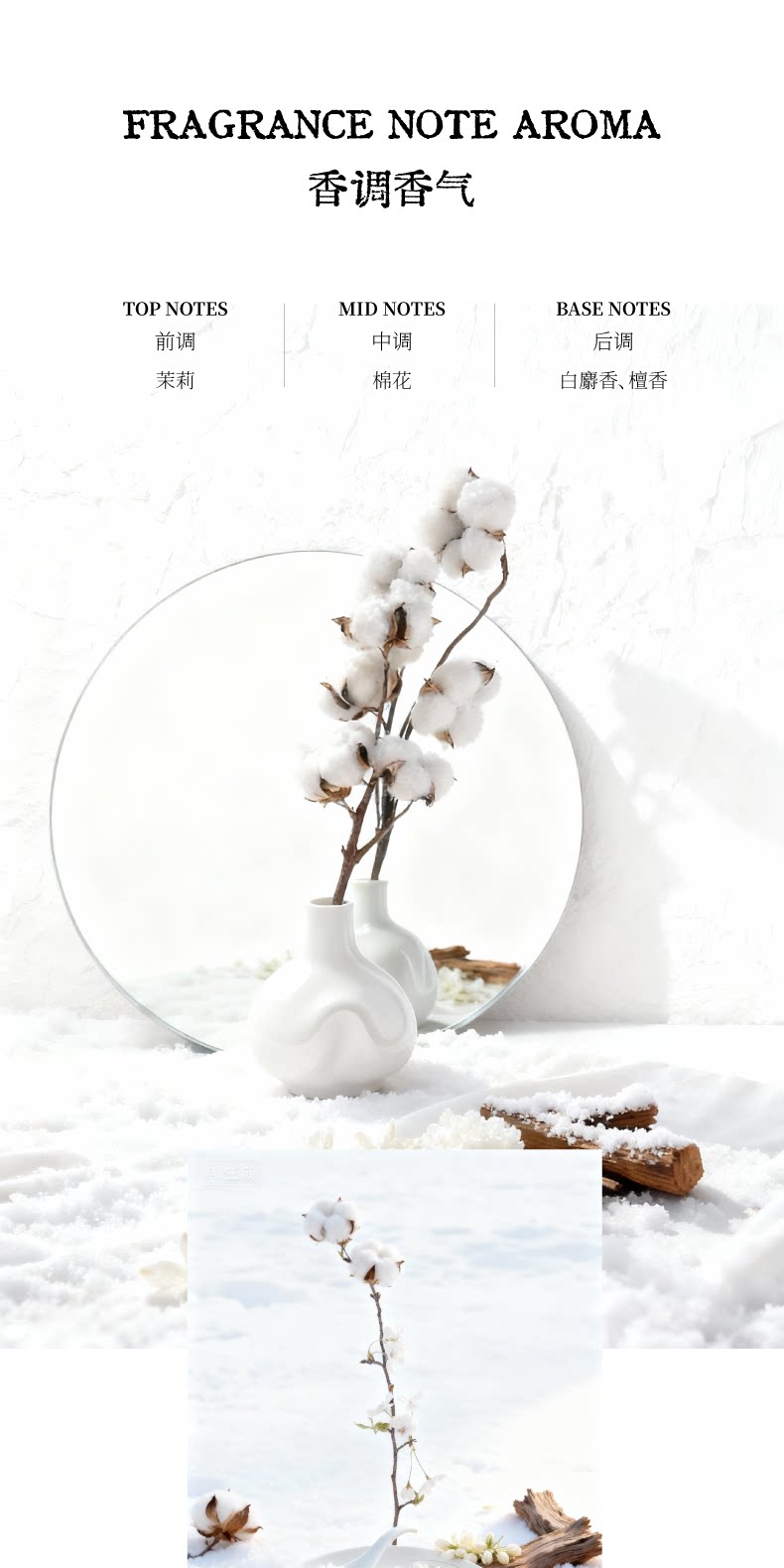 但很快,柔软的花香和沉稳的木质香就会接住这份清新,让它不至于轻飘。