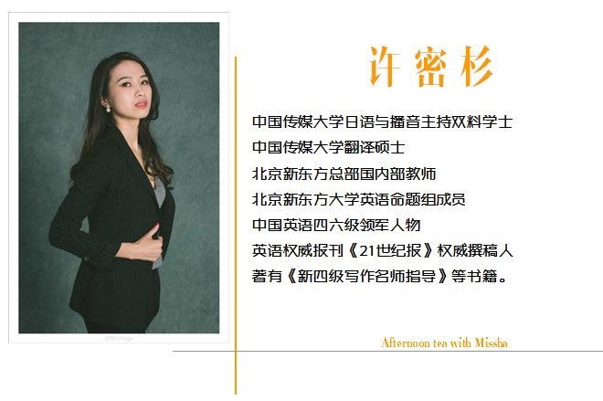 许密杉 中国传媒大学翻译硕士,前北京新东方国内部优秀教师,执教写作课6年,一线课程教学经验,出版写作类相关书籍《新大学四级名师写作指导》《翻译硕士》系列